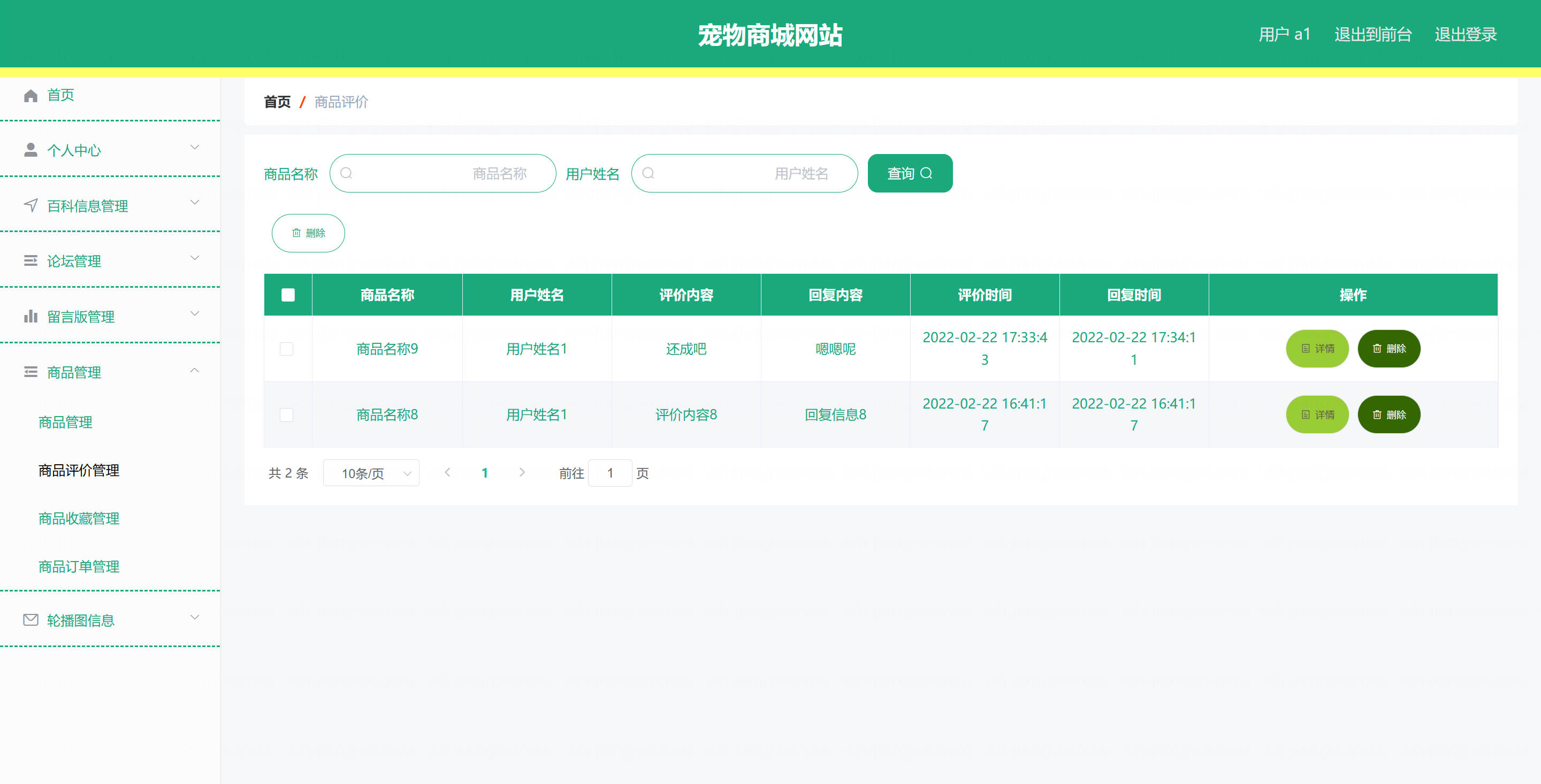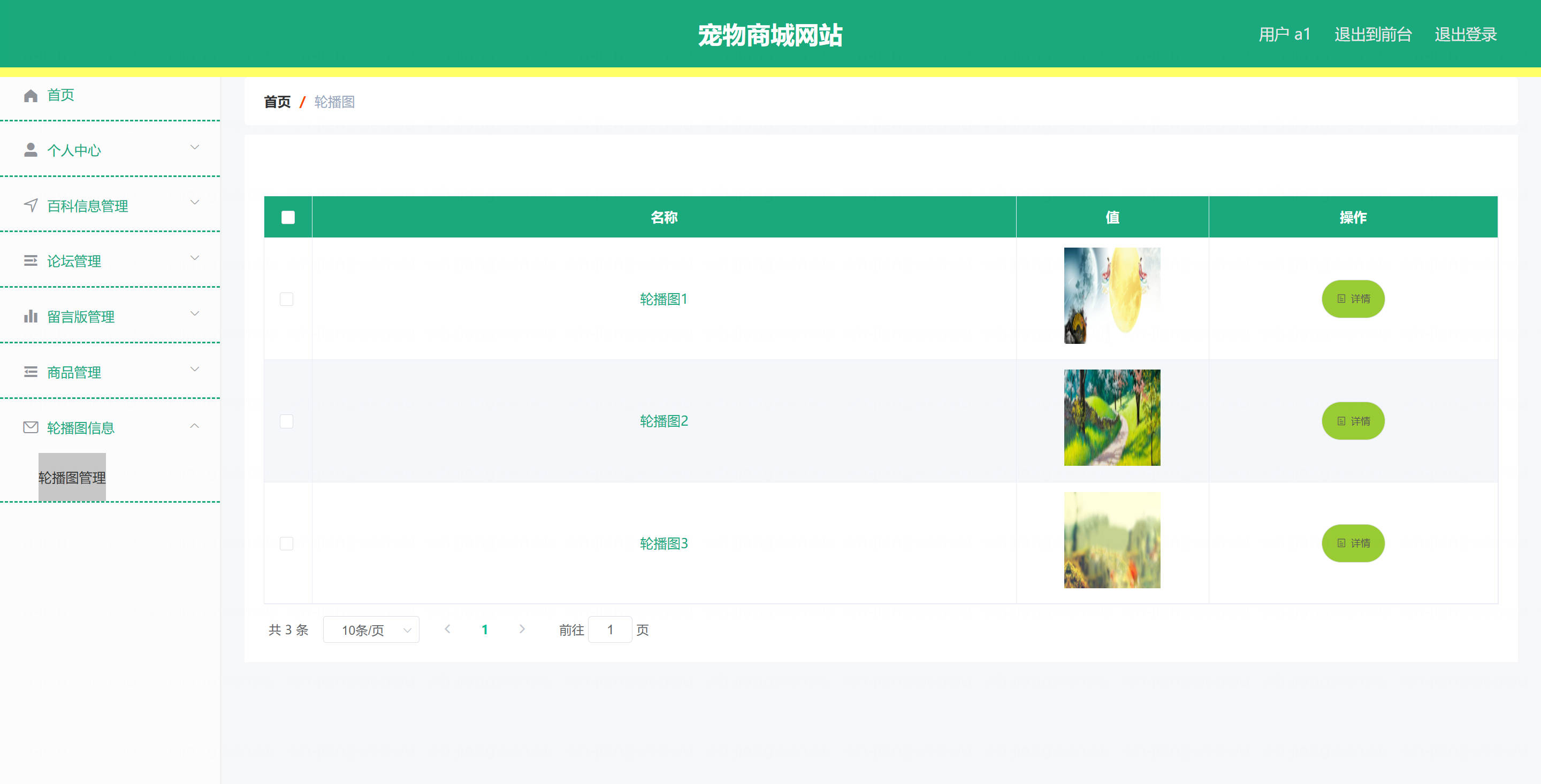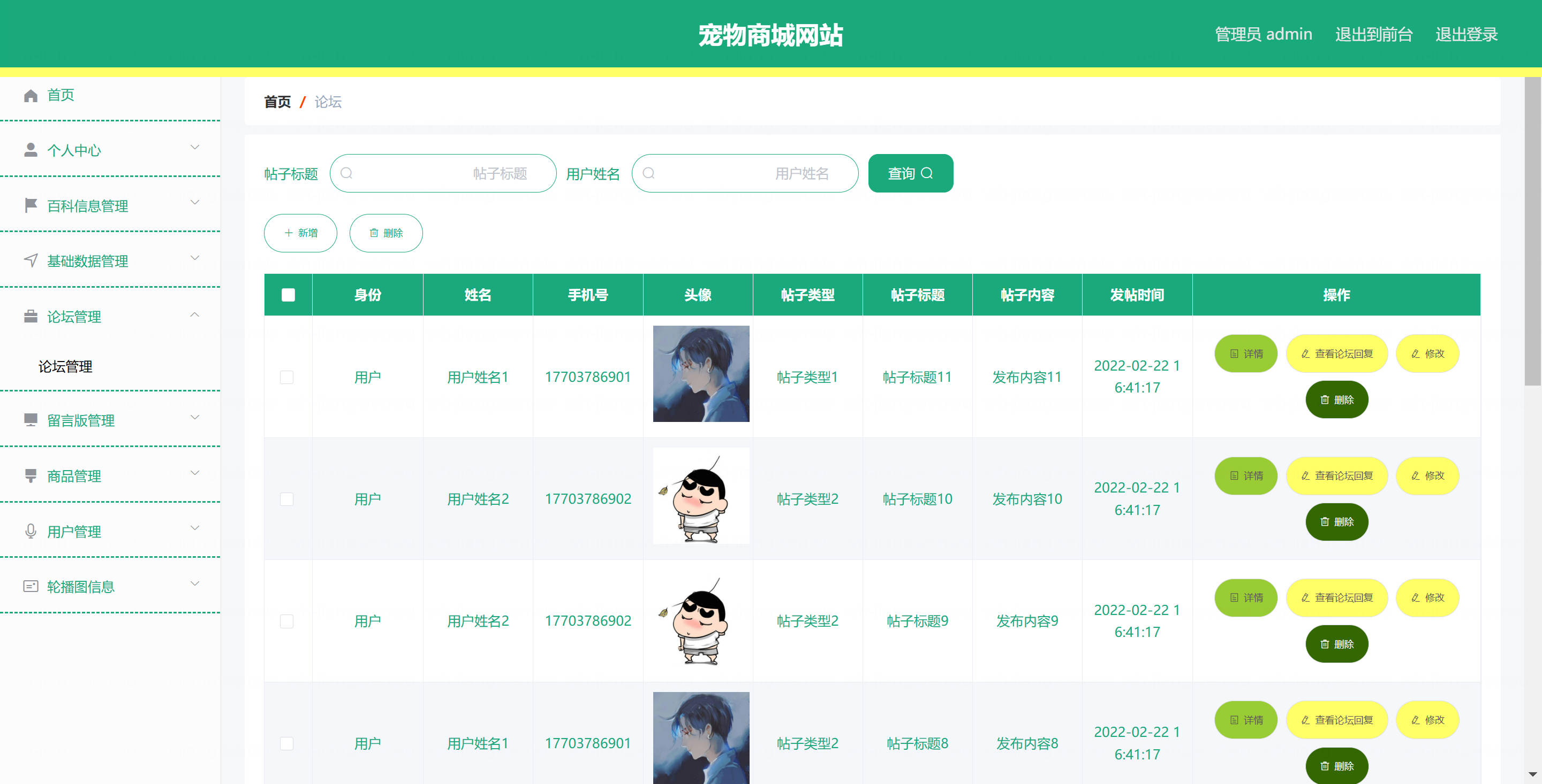 基于SpringBoot+Vue的宠物商城网站,系统角色为管理员、用户,主要功能如下