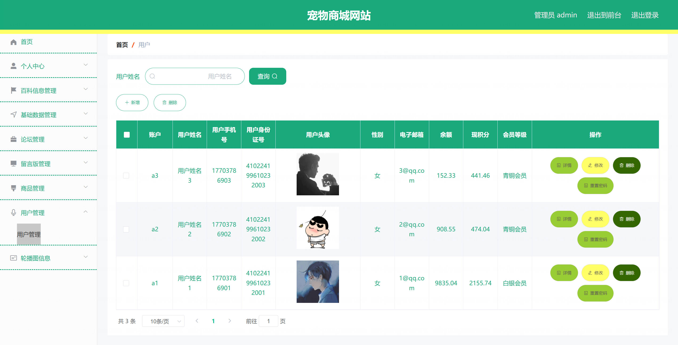 管理员: 基本操作:登录、退出、修改密码、获取个人信息、修改个人信息 系统配置管理:查看/修改系统参数、站点与展示配置 管理员账户管理:新增管理员、重置密码、查询列表、删除、查看详情 前台用户管理:筛选用户、查看详情、重置密码、修改信息、删除、余额与积分/会员等级调整 商品管理:筛选商品、查看详情、新增商品、修改商品、逻辑删除、上下架 订单管理:筛选订单、查看详情、发货、收货、删除 商品评论管理:查看评论、回复评论、删除评论 商品收藏管理:查看收藏列表、取消收藏 购物车管理:查看购物车列表、修改数量、删除条目 收货地址管理:查看地址、设置默认地址、增删改查 百科管理:发布百科、筛选、查看详情、增删改查 论坛管理:筛选帖子、查看详情、修改状态(审核)、删除帖子 留言管理:查看留言、回复、删除