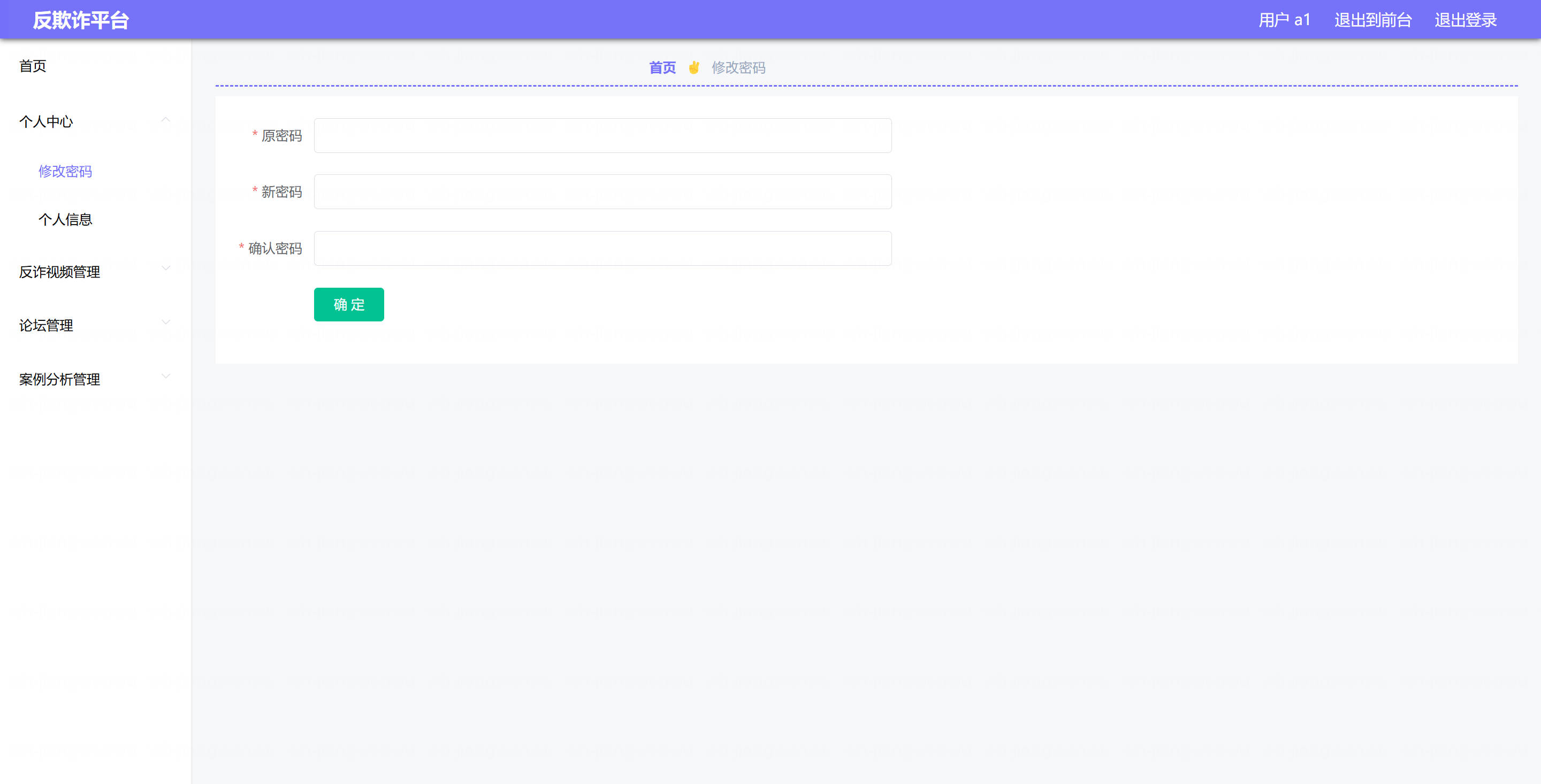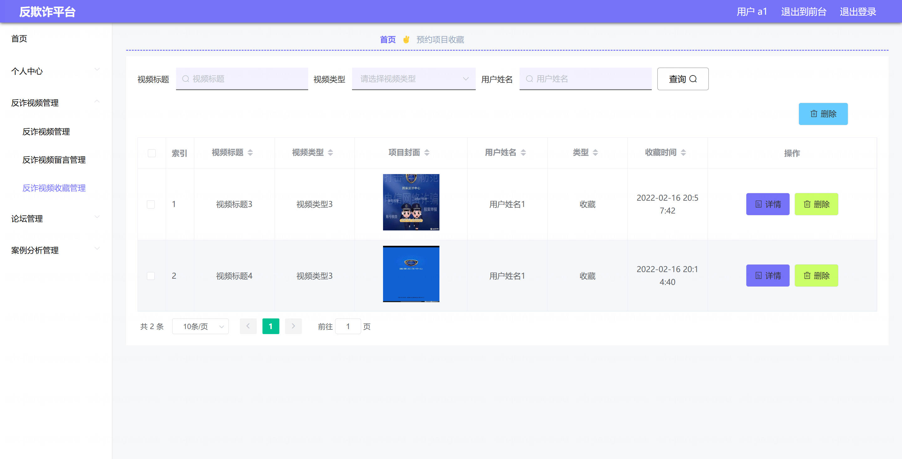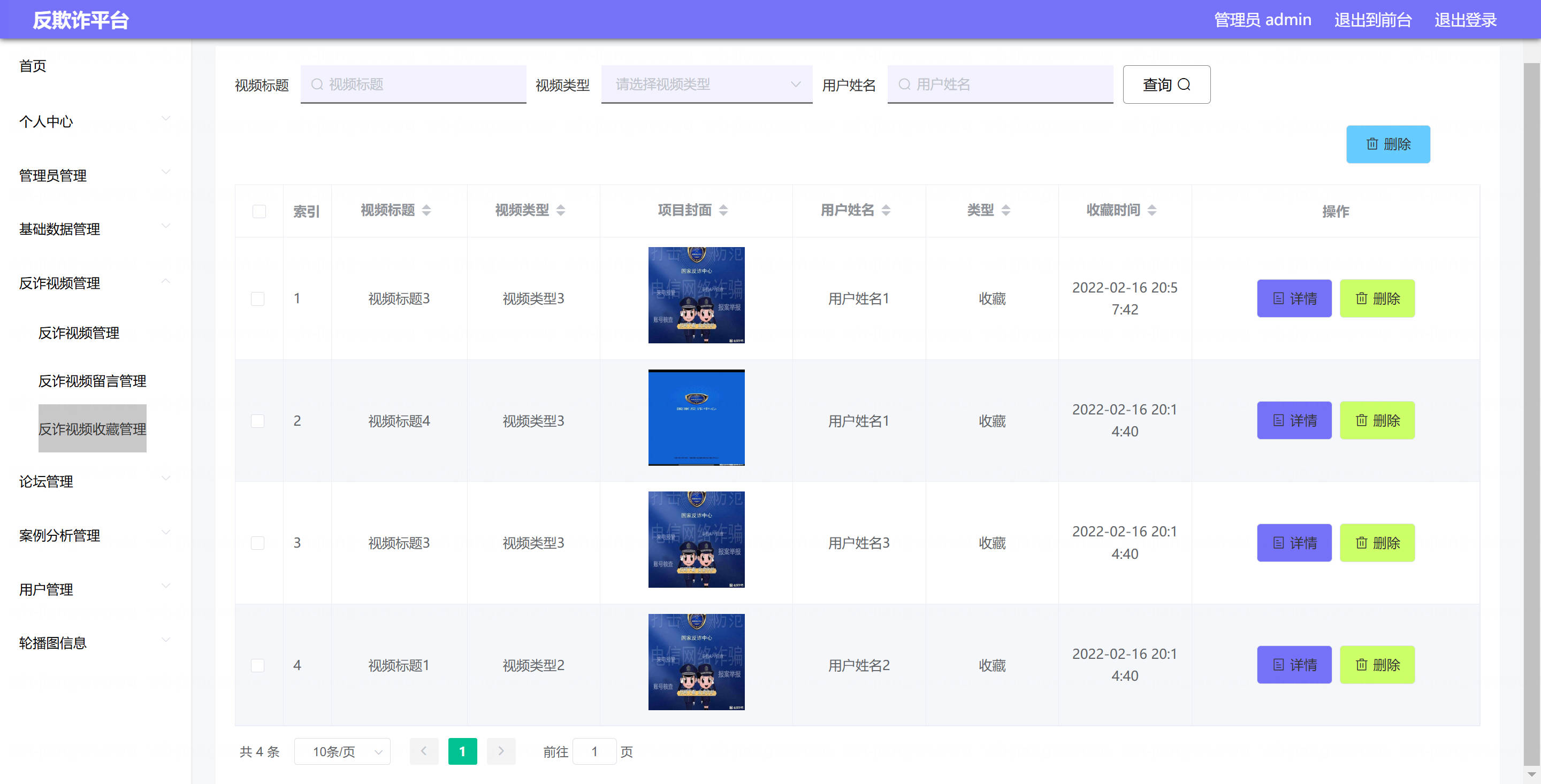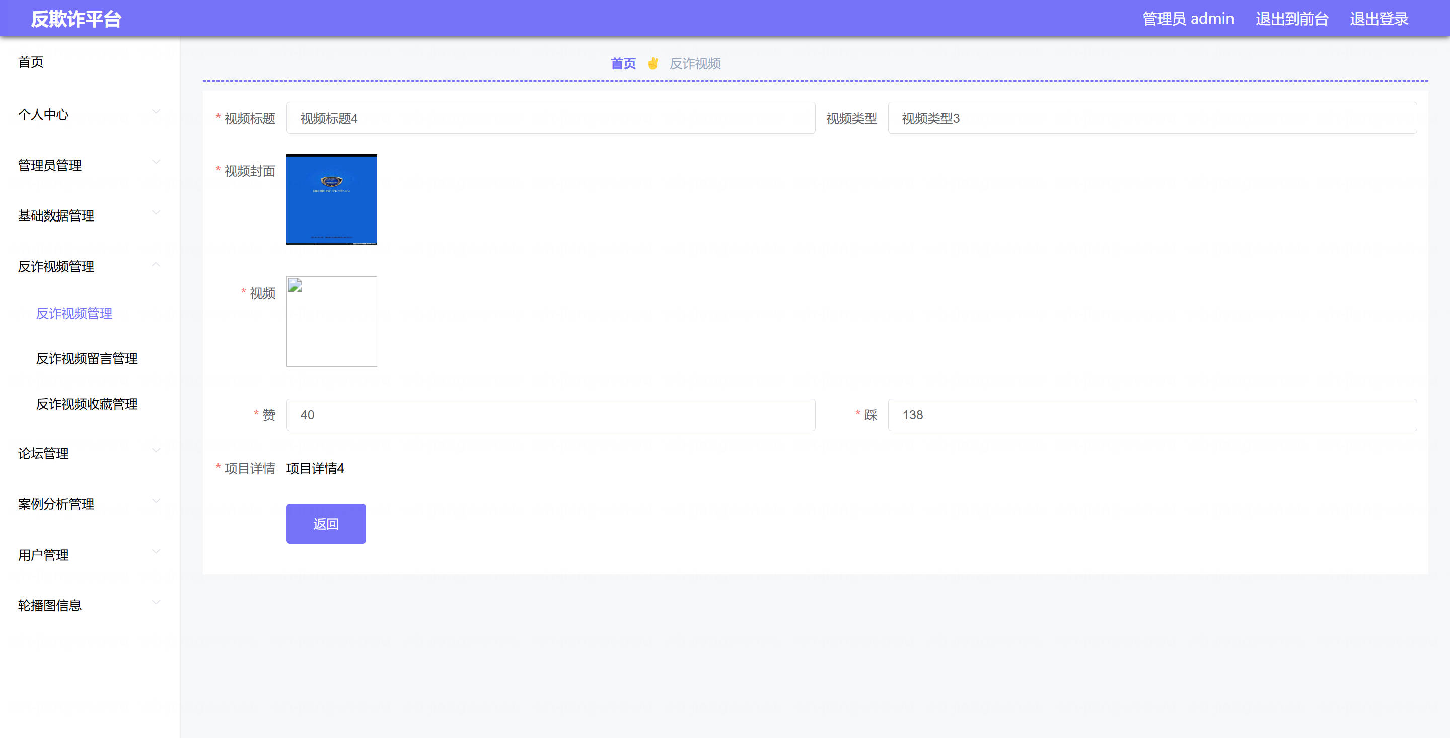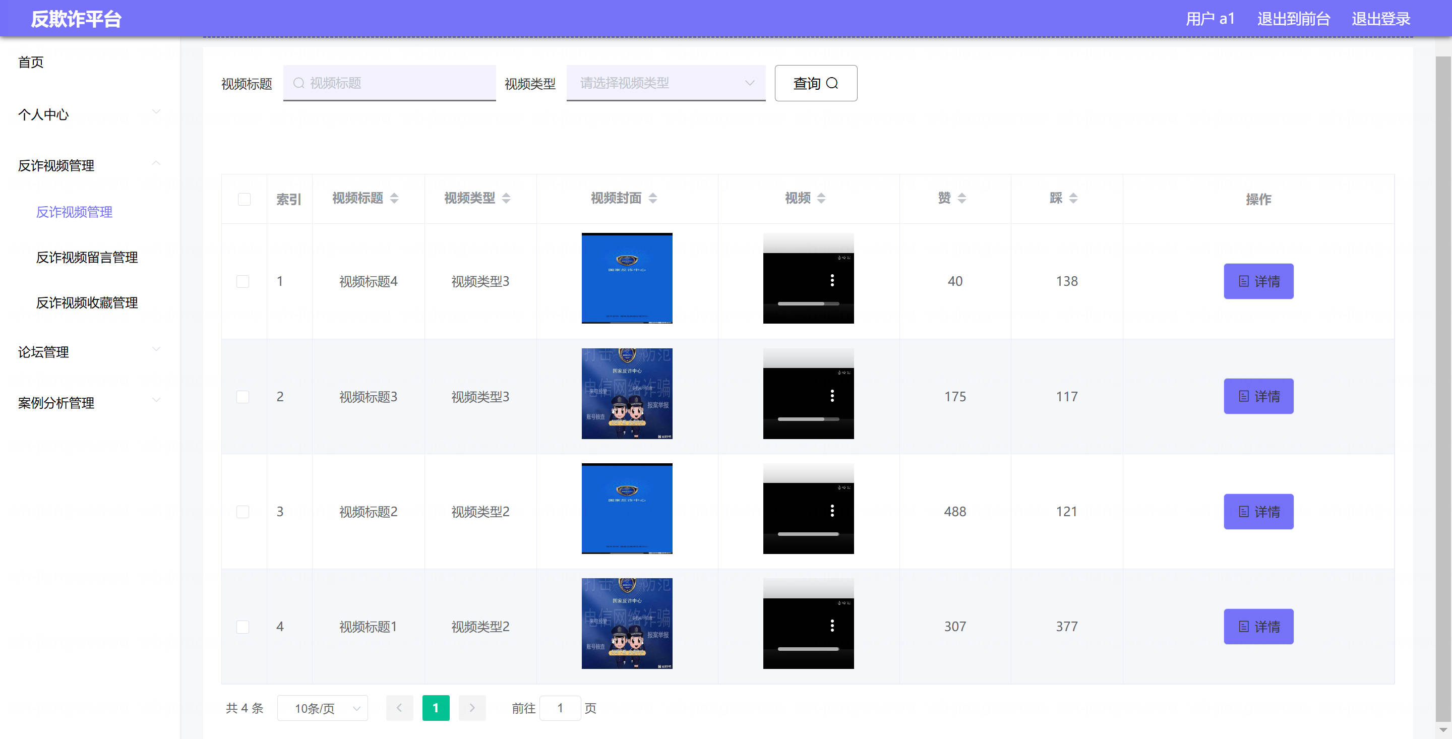 前台用户: 基本操作:注册、登录、修改密码、获取个人信息、修改个人信息 反诈视频:浏览/筛选视频、查看视频详情、收藏/取消收藏、留言评论、查看我的收藏 论坛:发布帖子、浏览帖子、查看帖子详情、评论互动、管理个人帖子 新闻公告:浏览新闻、查看新闻详情 个人中心:查看与修改个人资料、头像上传、密码修改、查看我的留言与收藏