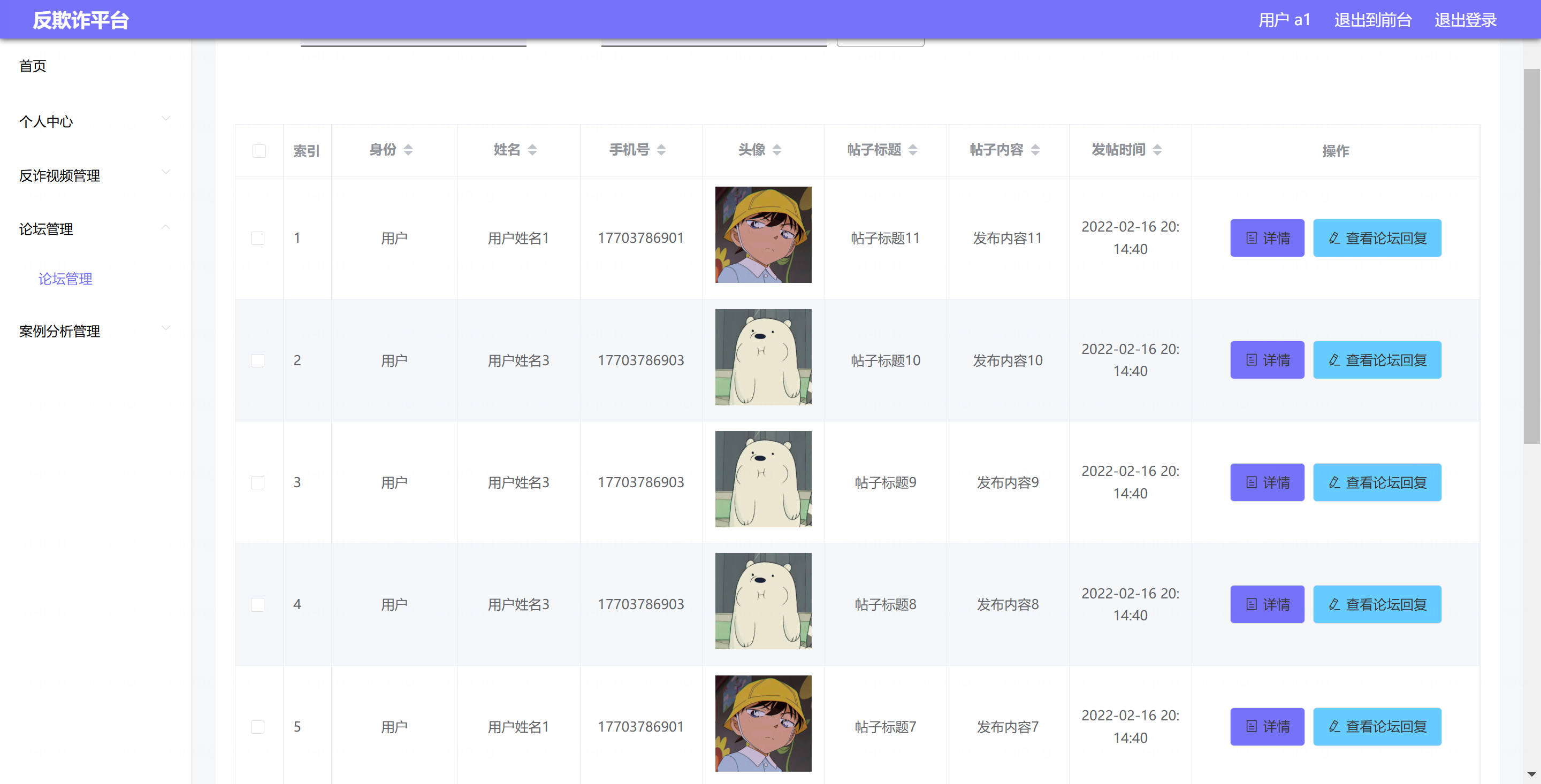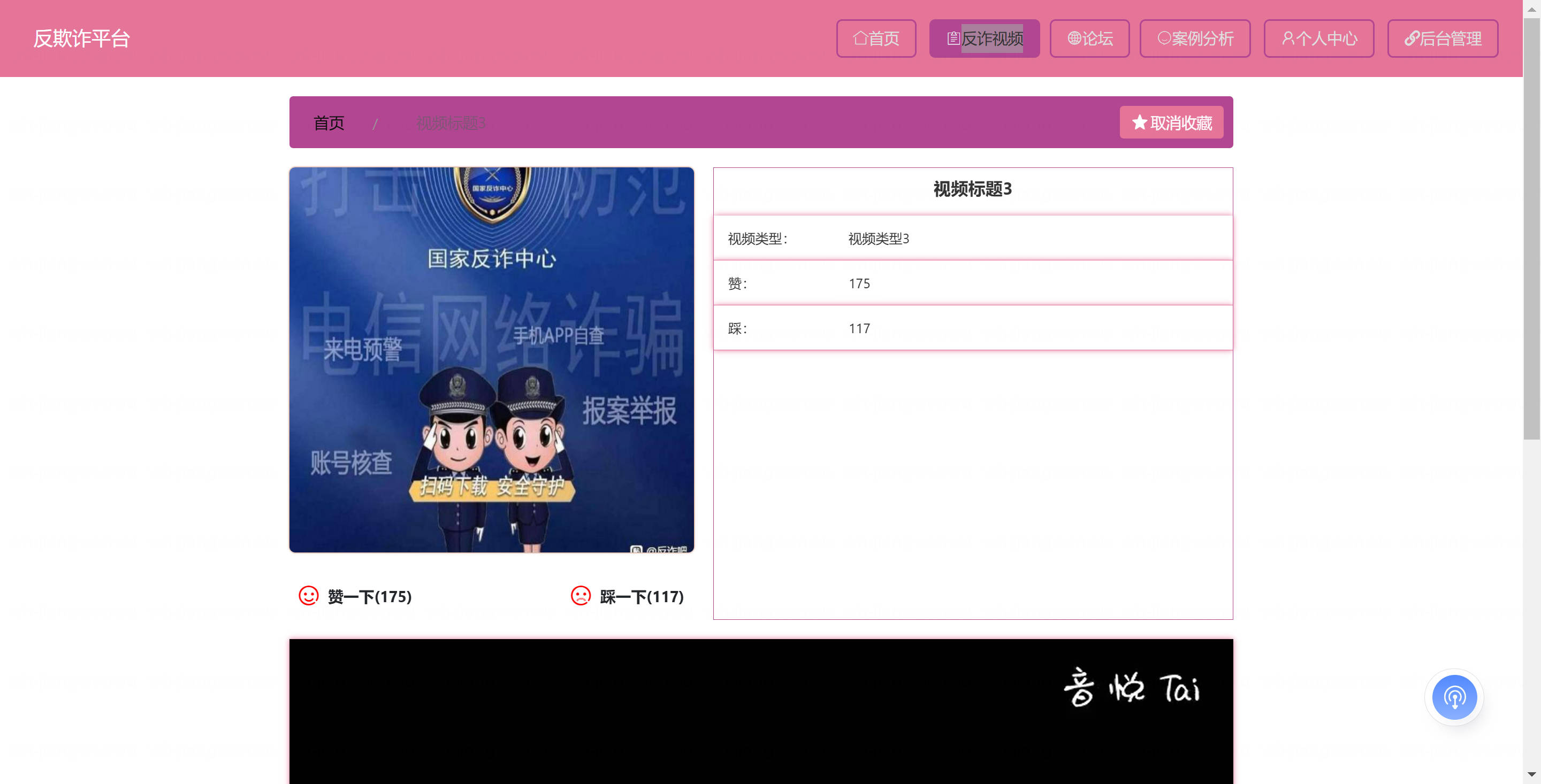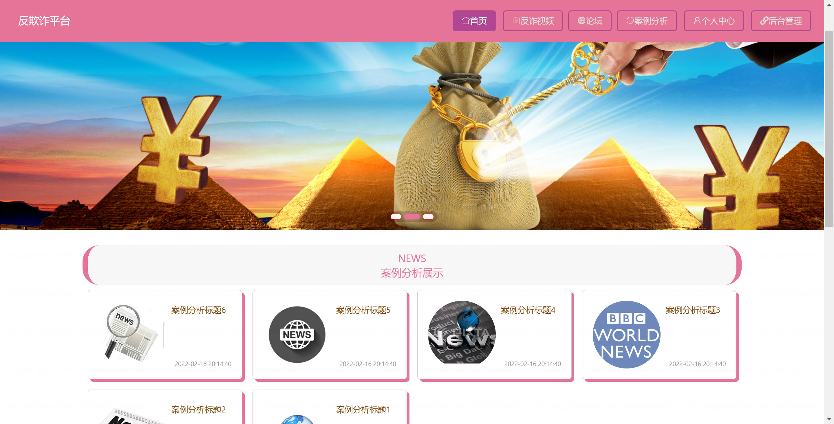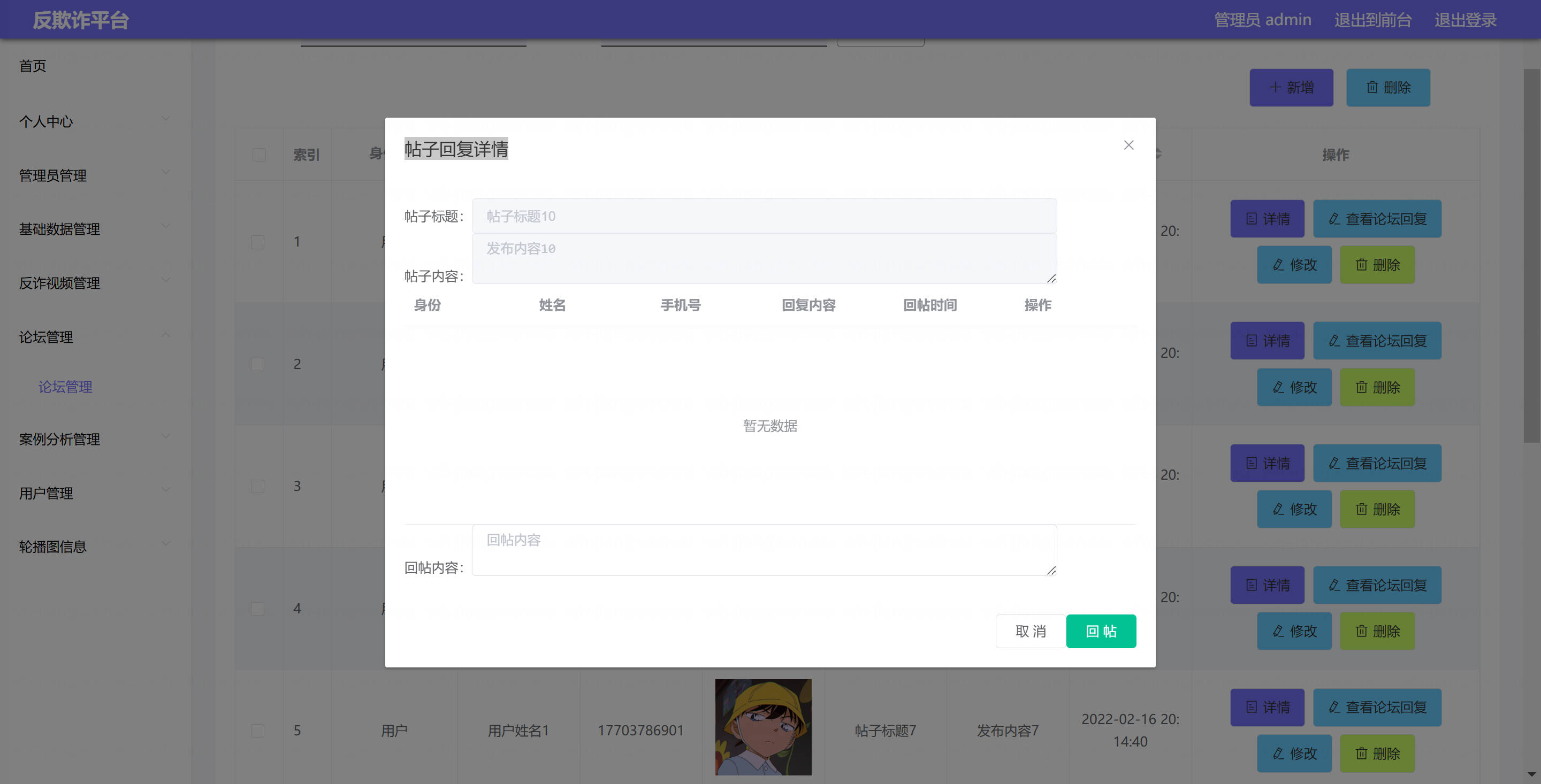 前台用户: 基本操作:注册、登录、修改密码、获取个人信息、修改个人信息 反诈视频:浏览/筛选视频、查看视频详情、收藏/取消收藏、留言评论、查看我的收藏 论坛:发布帖子、浏览帖子、查看帖子详情、评论互动、管理个人帖子 新闻公告:浏览新闻、查看新闻详情 个人中心:查看与修改个人资料、头像上传、密码修改、查看我的留言与收藏