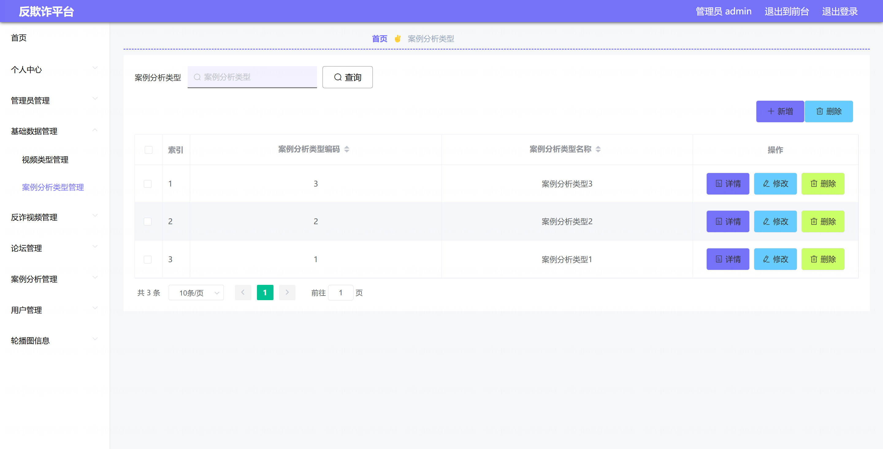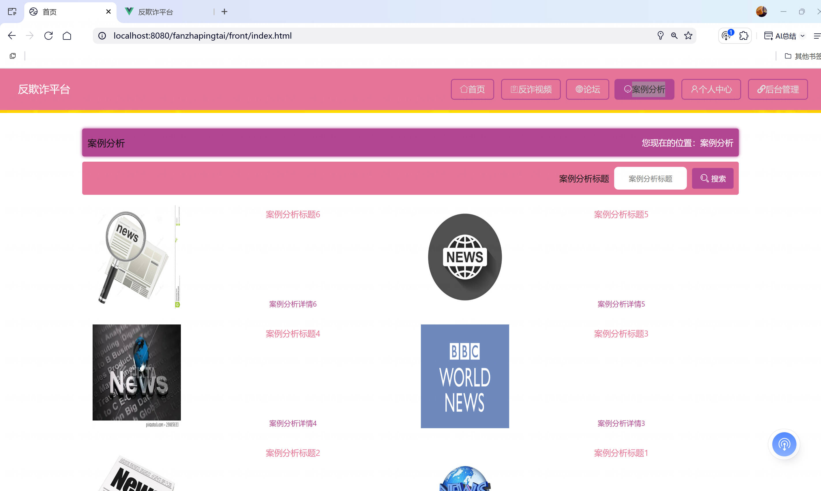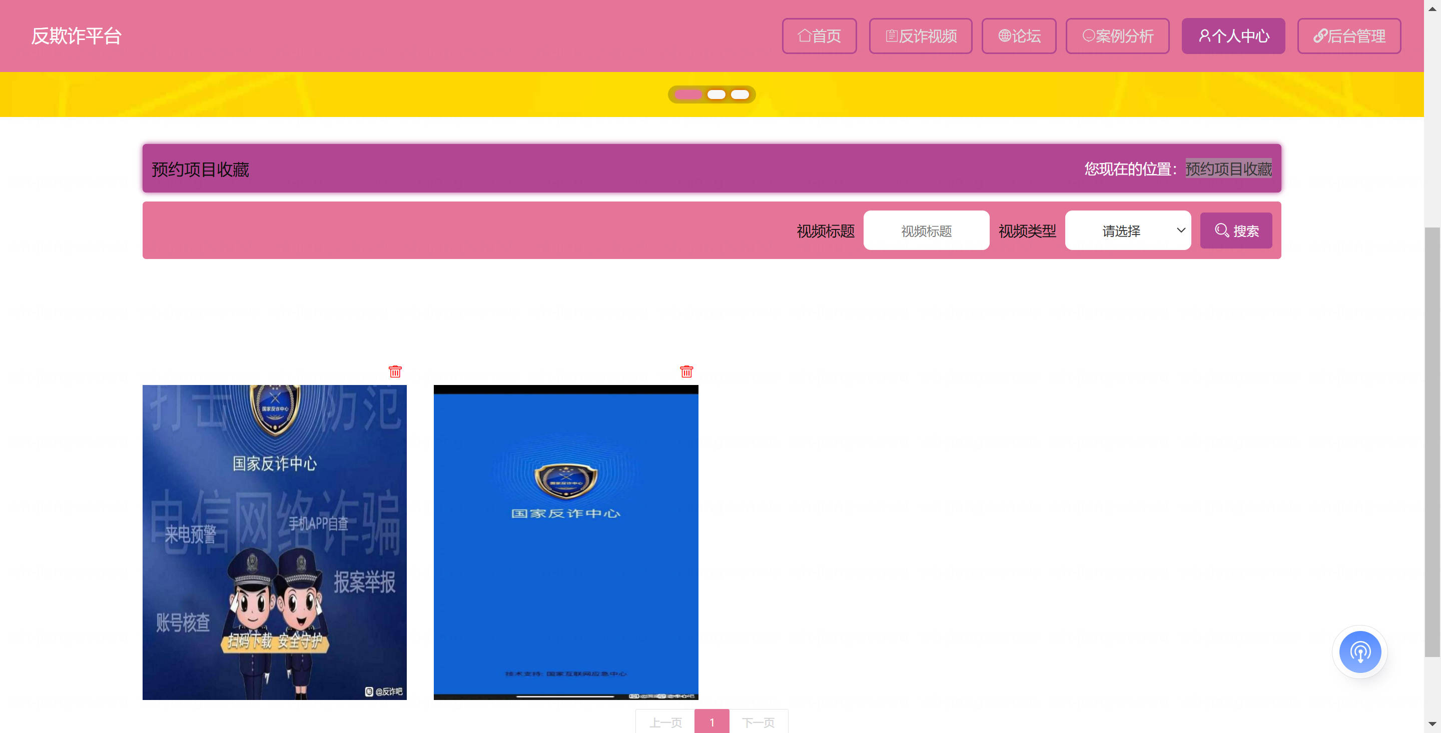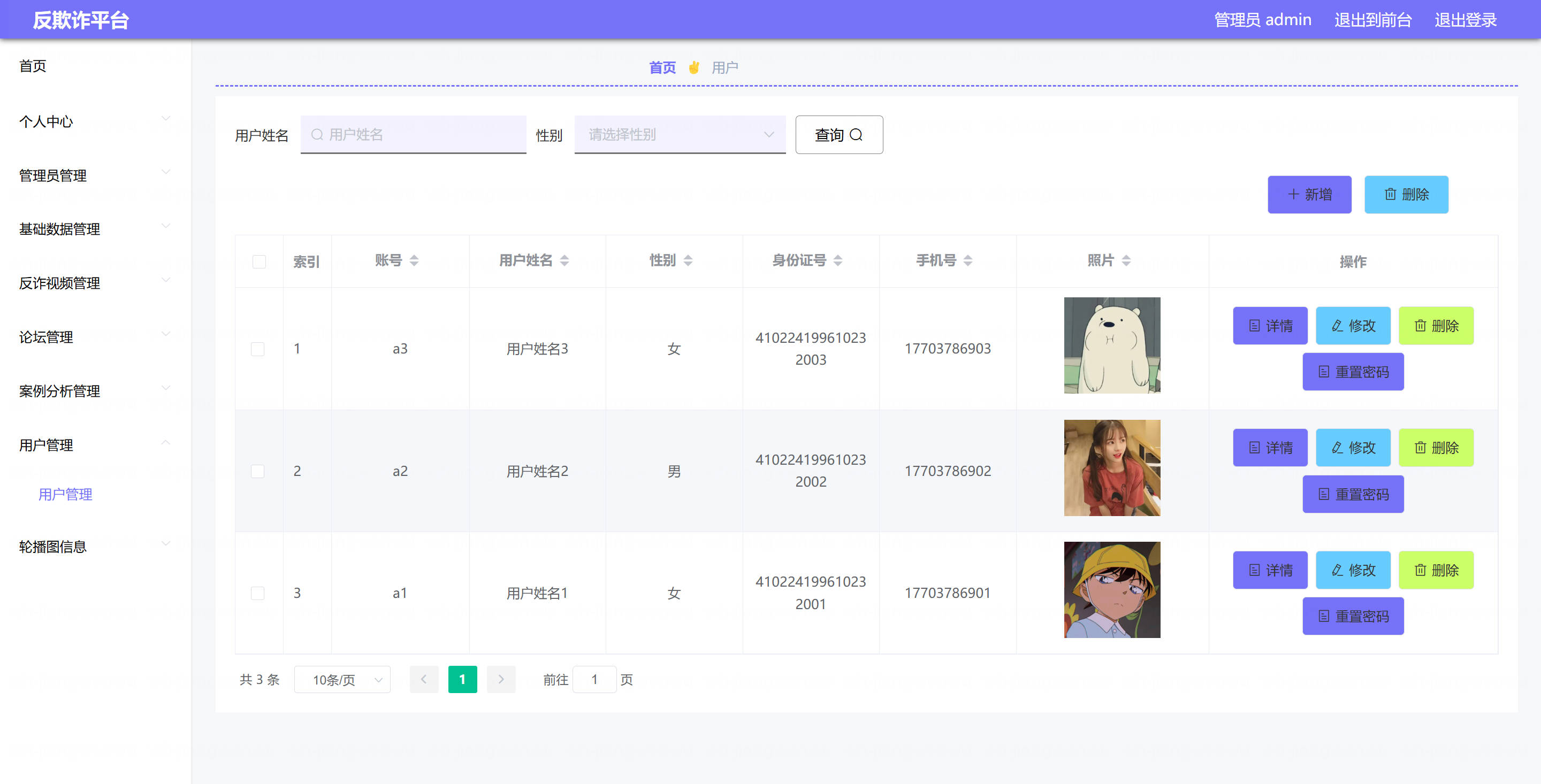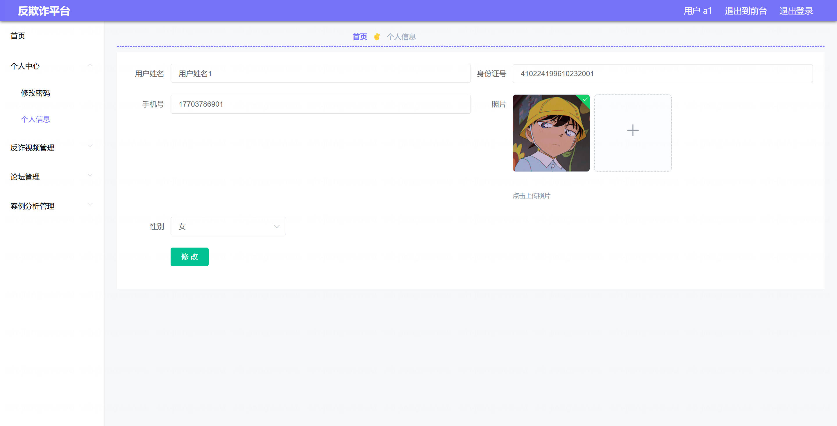 前台用户: 基本操作:注册、登录、修改密码、获取个人信息、修改个人信息 反诈视频:浏览/筛选视频、查看视频详情、收藏/取消收藏、留言评论、查看我的收藏 论坛:发布帖子、浏览帖子、查看帖子详情、评论互动、管理个人帖子 新闻公告:浏览新闻、查看新闻详情 个人中心:查看与修改个人资料、头像上传、密码修改、查看我的留言与收藏