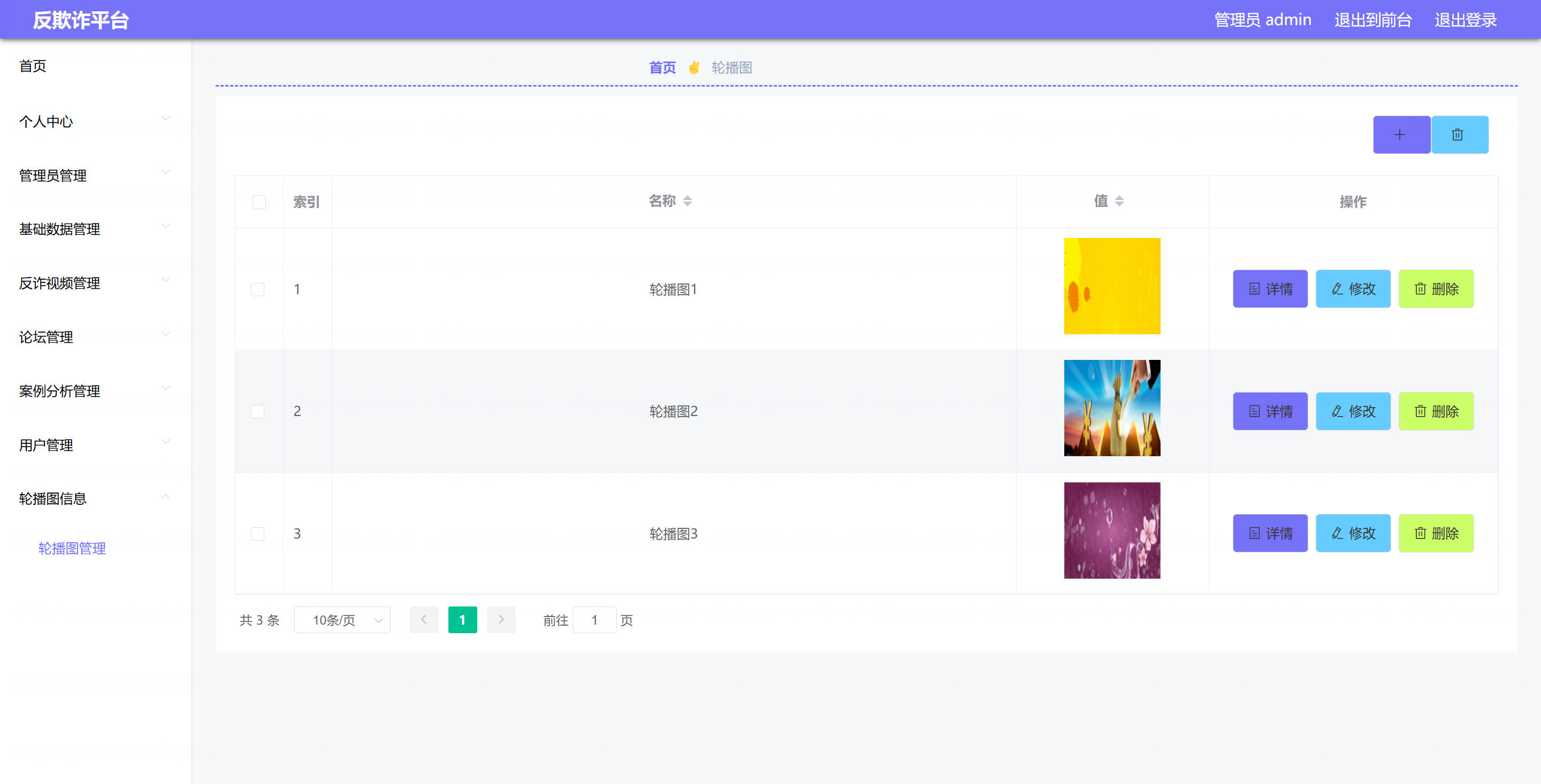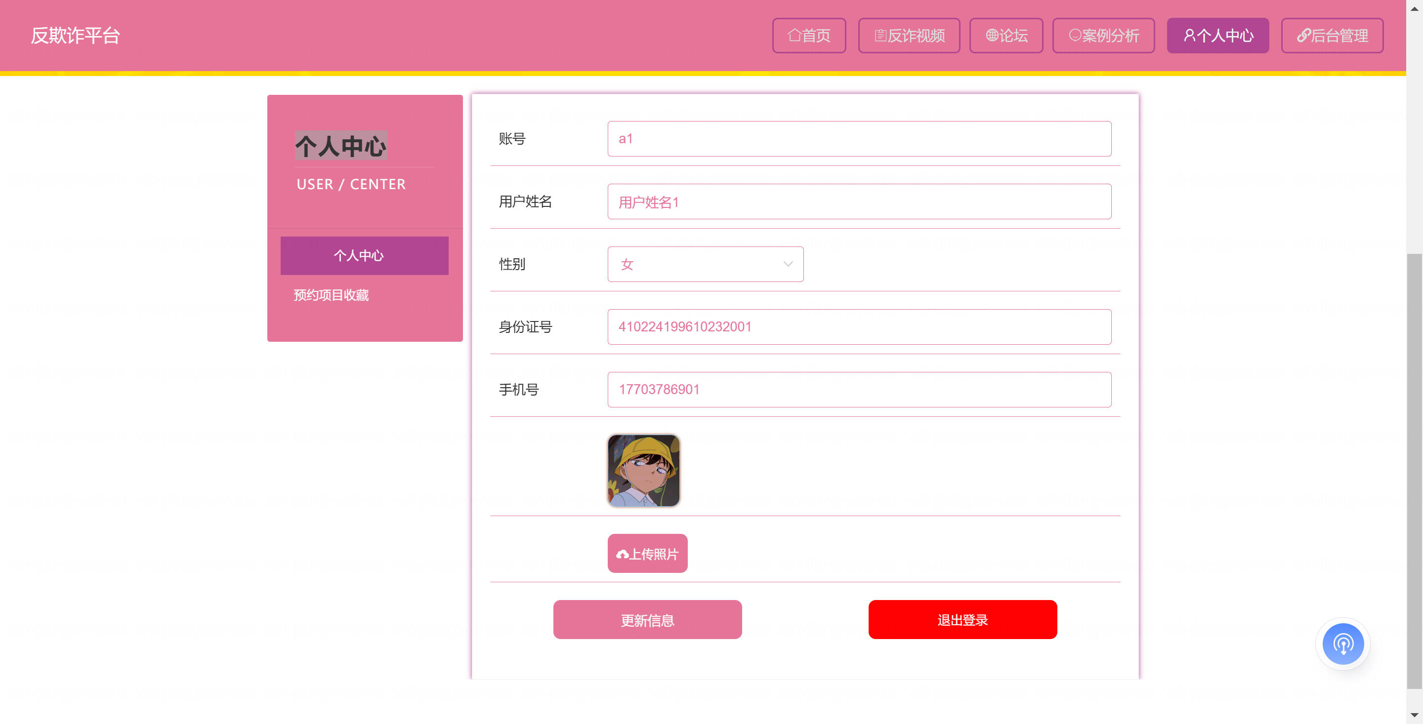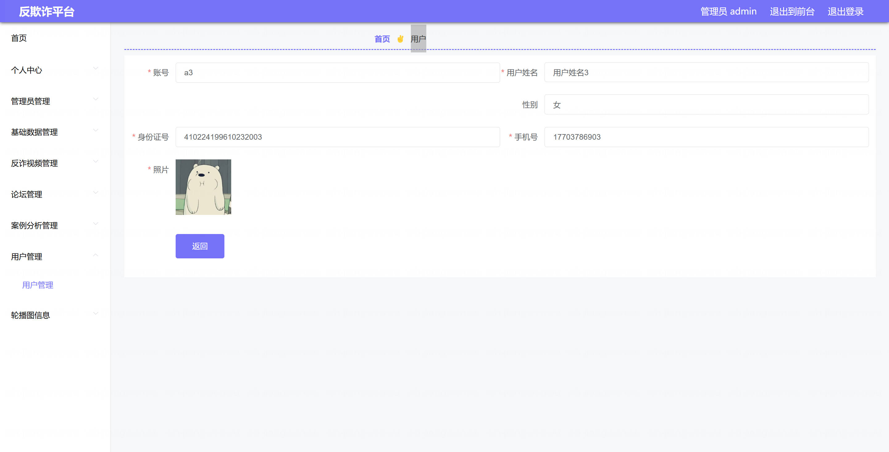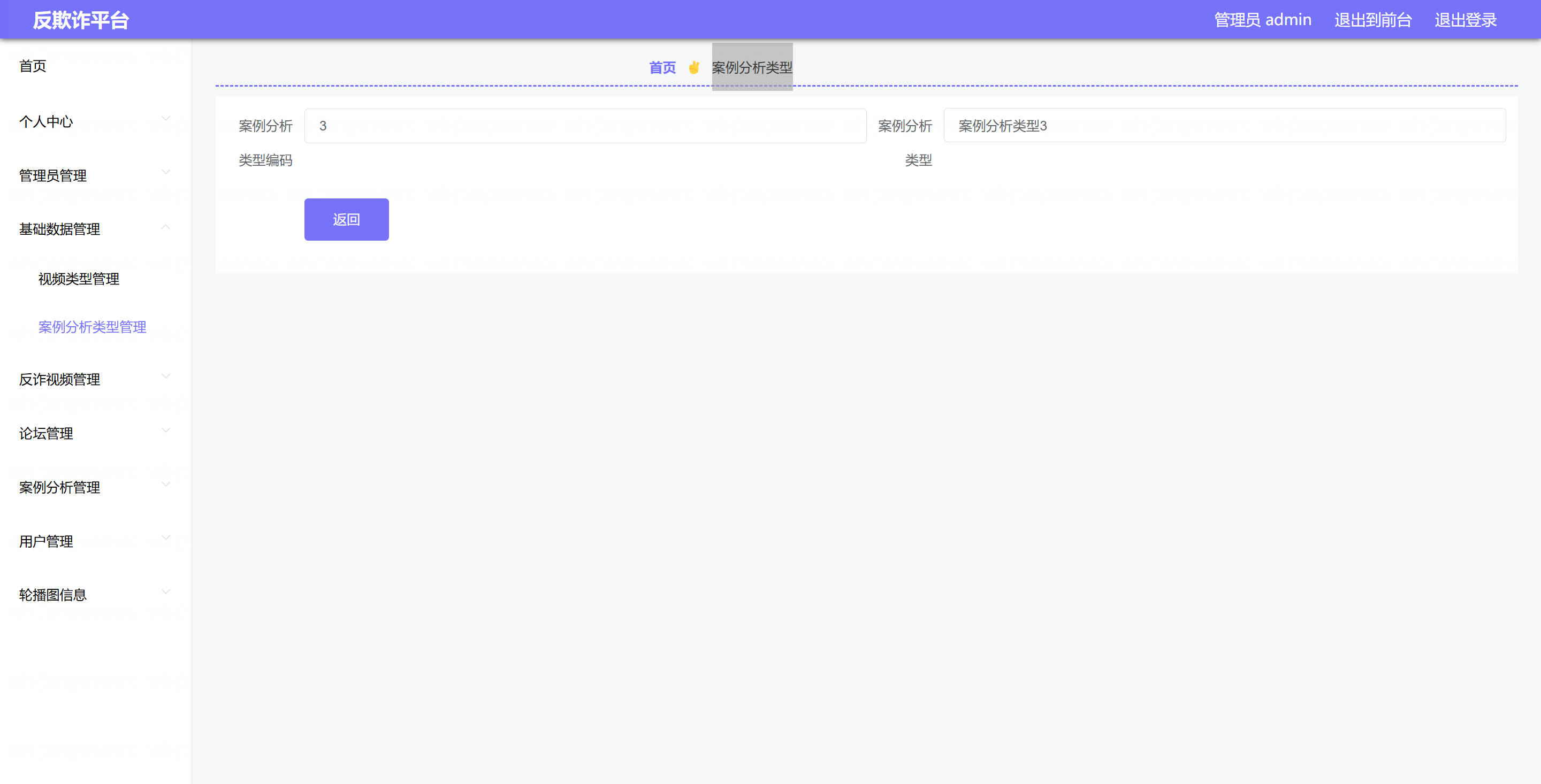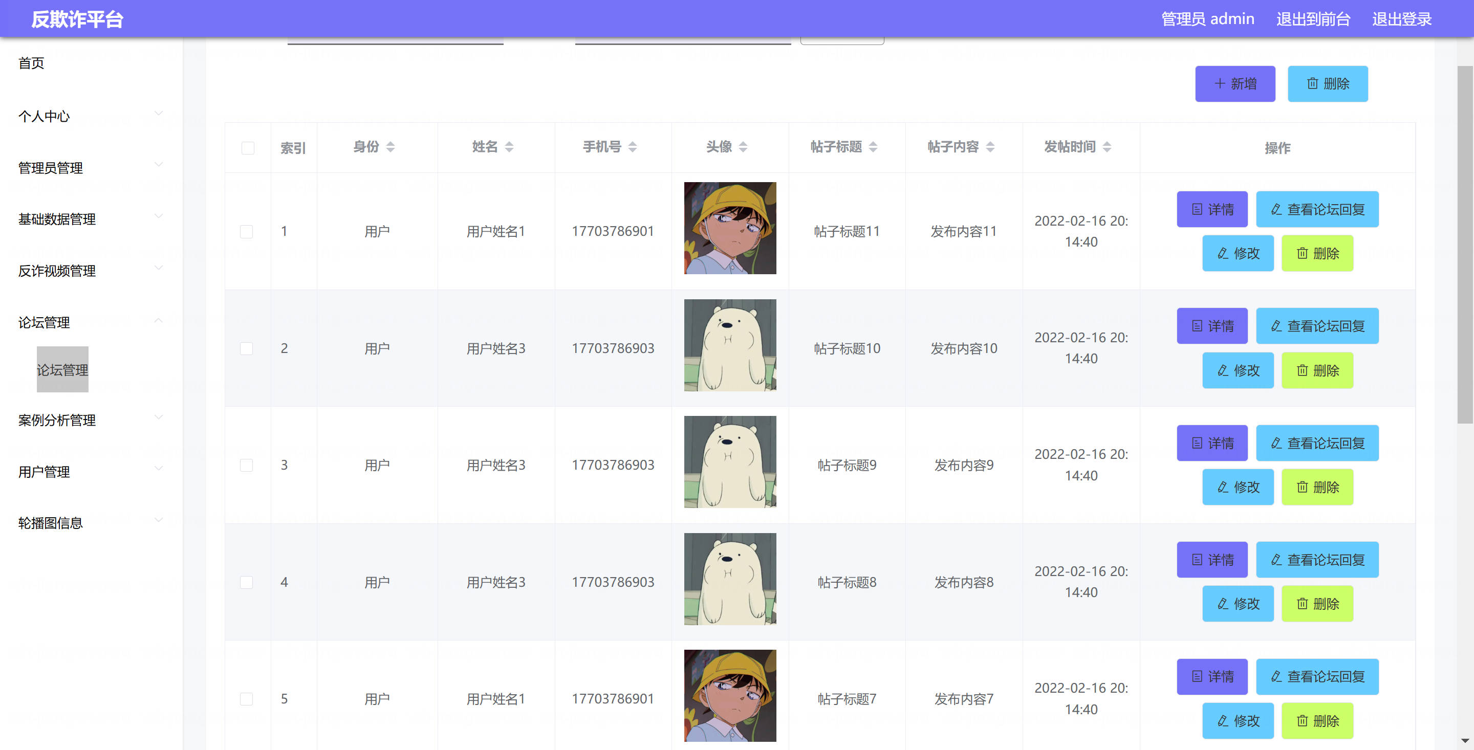 前台用户: 基本操作:注册、登录、修改密码、获取个人信息、修改个人信息 反诈视频:浏览/筛选视频、查看视频详情、收藏/取消收藏、留言评论、查看我的收藏 论坛:发布帖子、浏览帖子、查看帖子详情、评论互动、管理个人帖子 新闻公告:浏览新闻、查看新闻详情 个人中心:查看与修改个人资料、头像上传、密码修改、查看我的留言与收藏