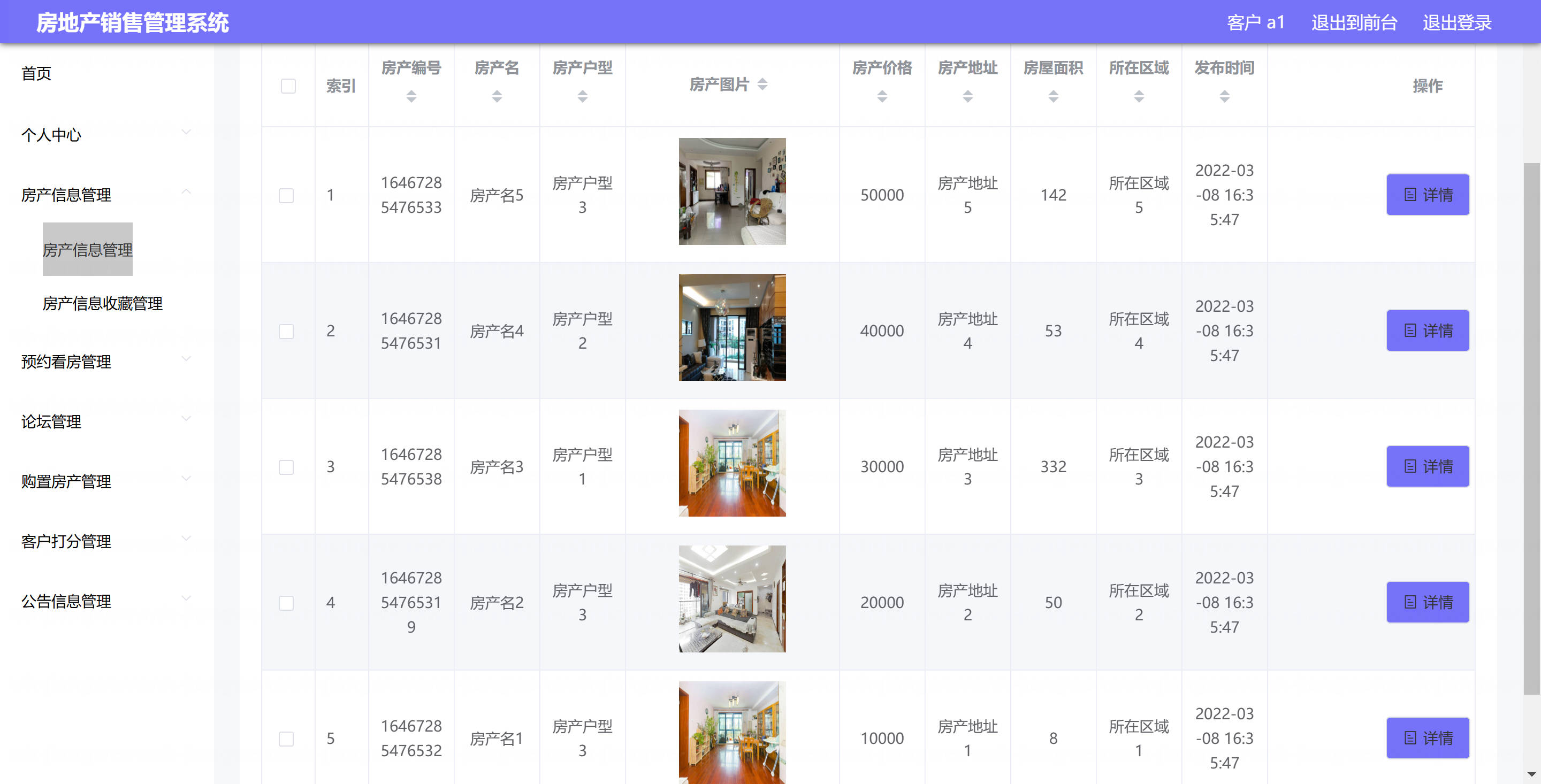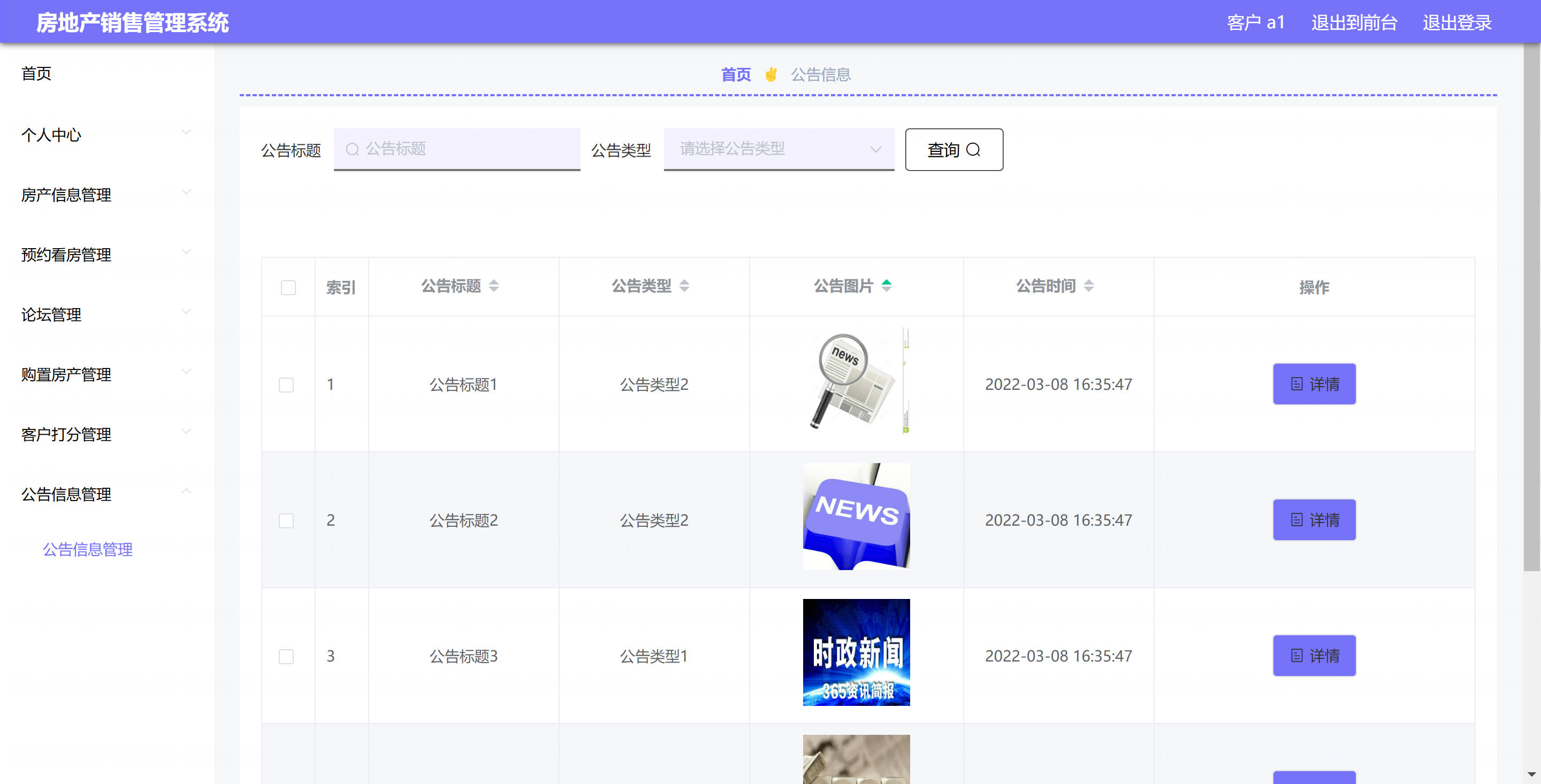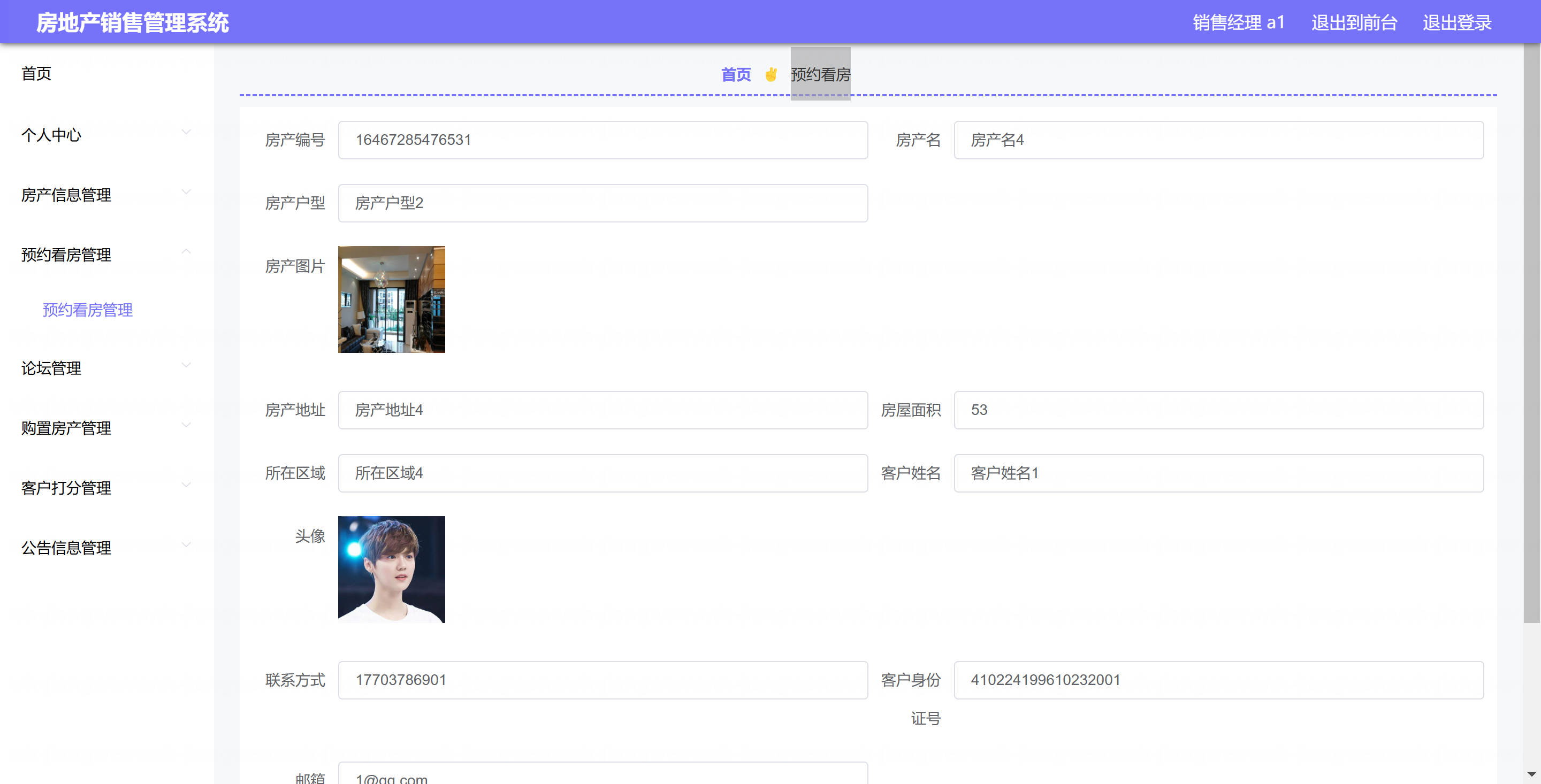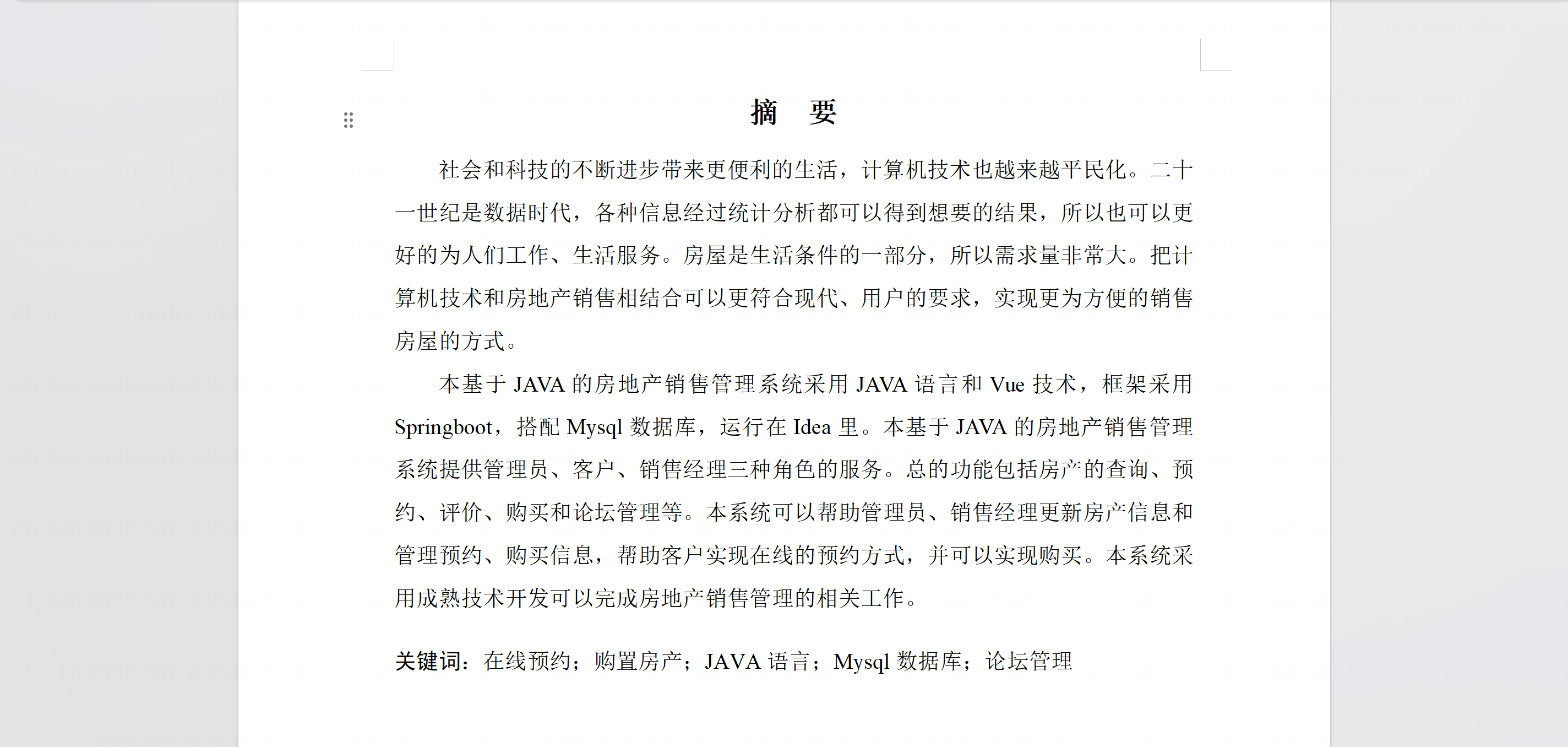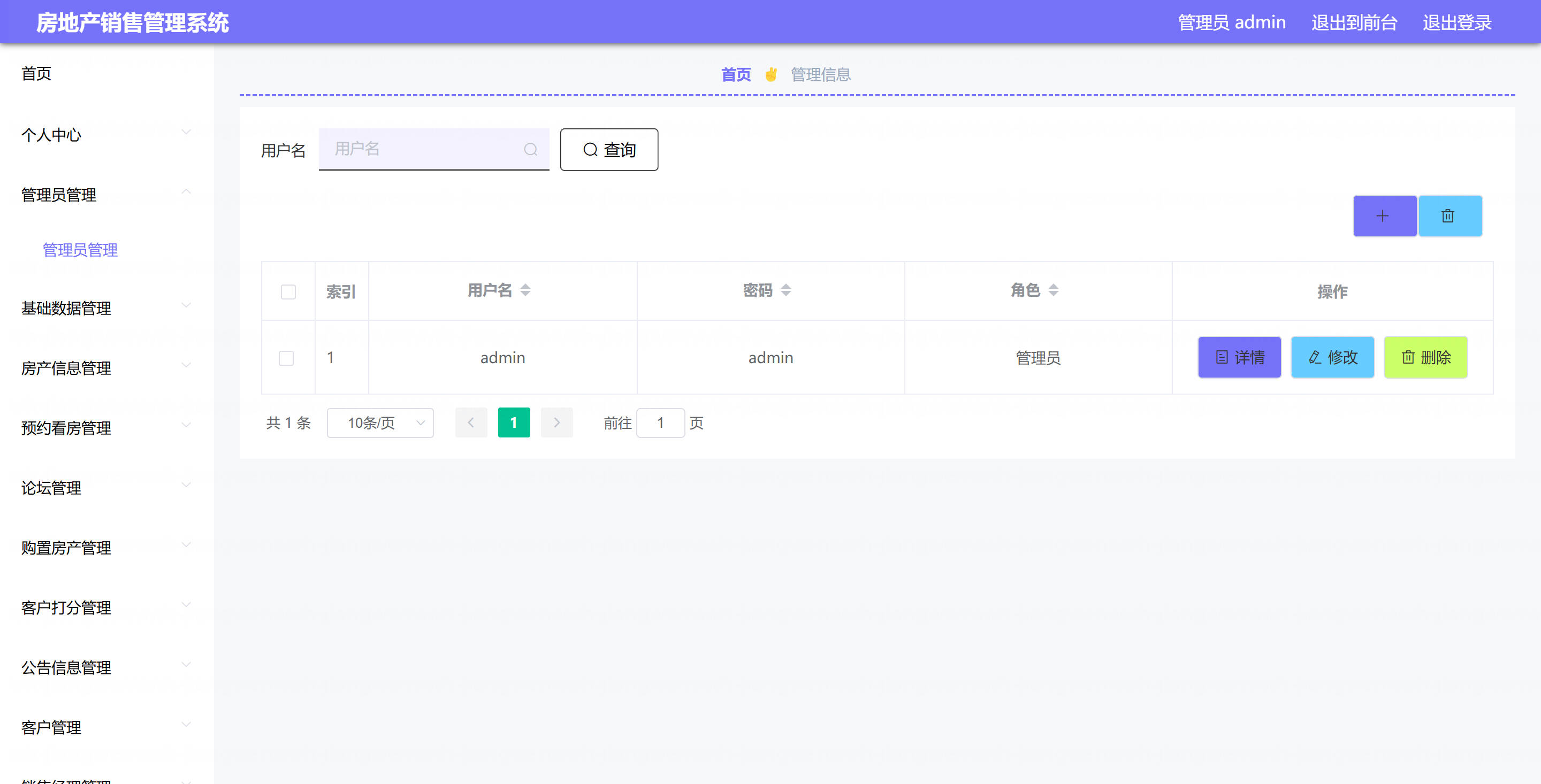 基于 Spring Boot 的房地产销售管理系统,系统角色为管理员、销售经理、客户,主要功能如下