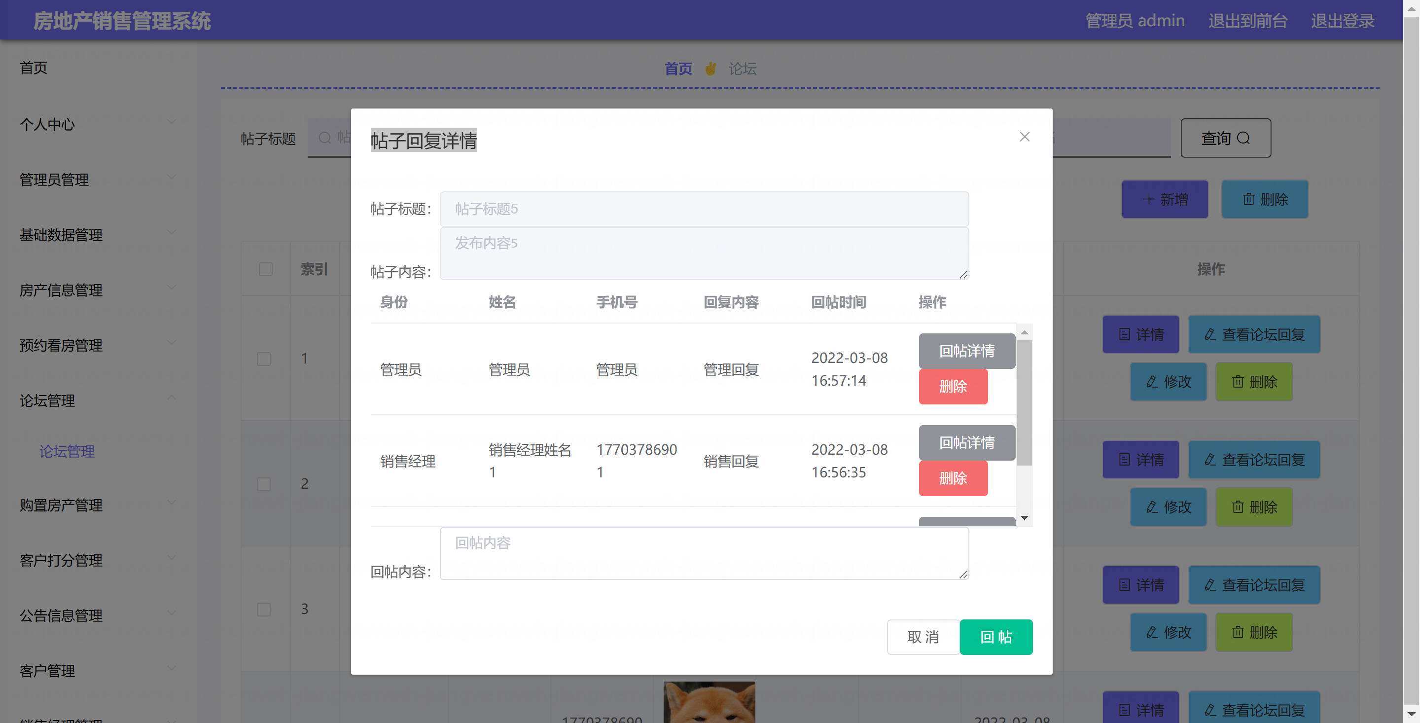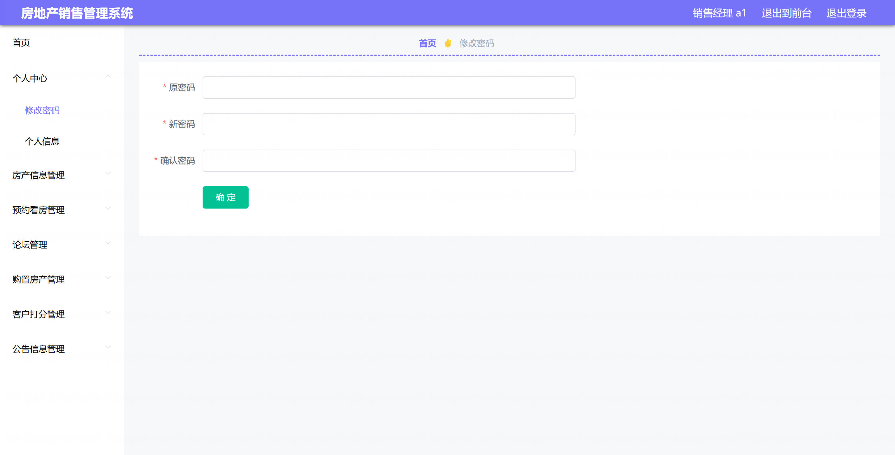 销售经理: 基本操作:登录、修改密码、获取/修改个人信息 可查看/管理分配给自己的房产/预约/收藏/论坛等(后台列表带 role 过滤) 房产、预约、收藏、论坛 的新增/修改/查看/删除(受权限约束)