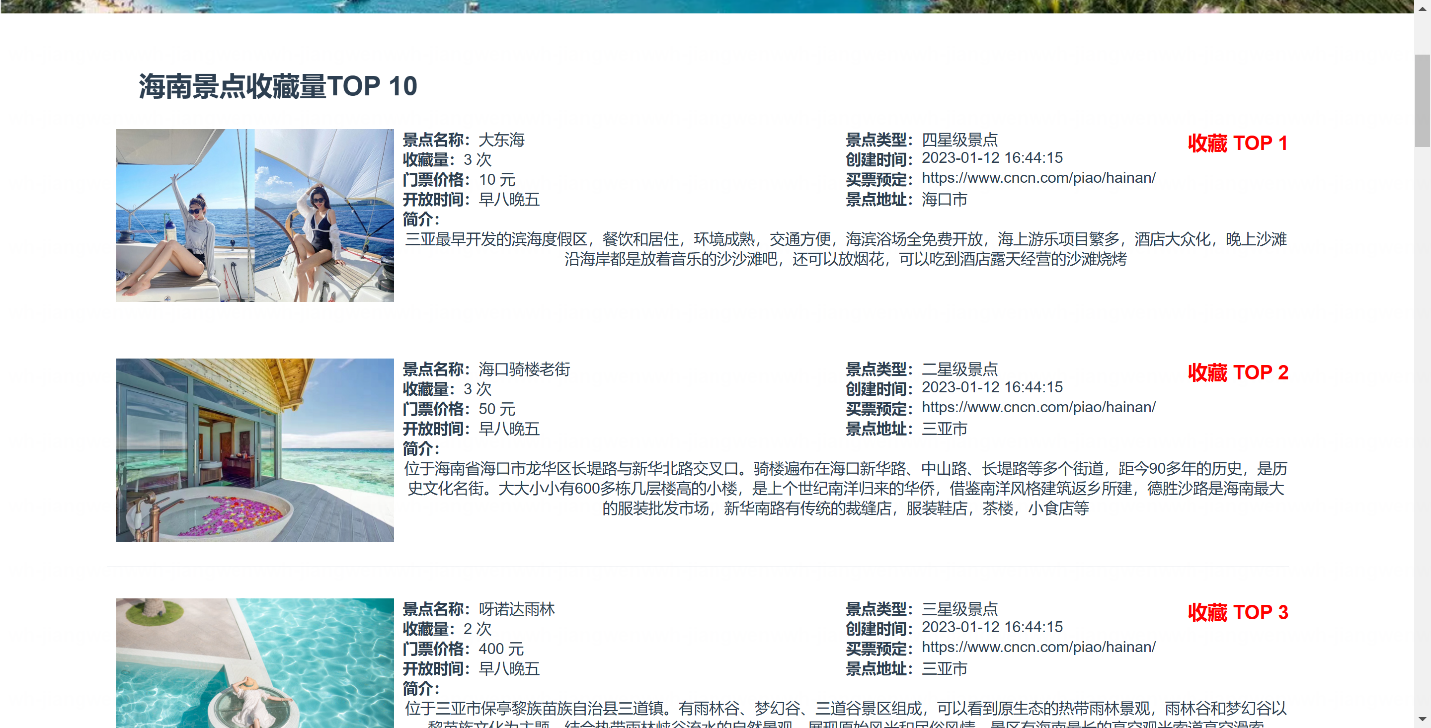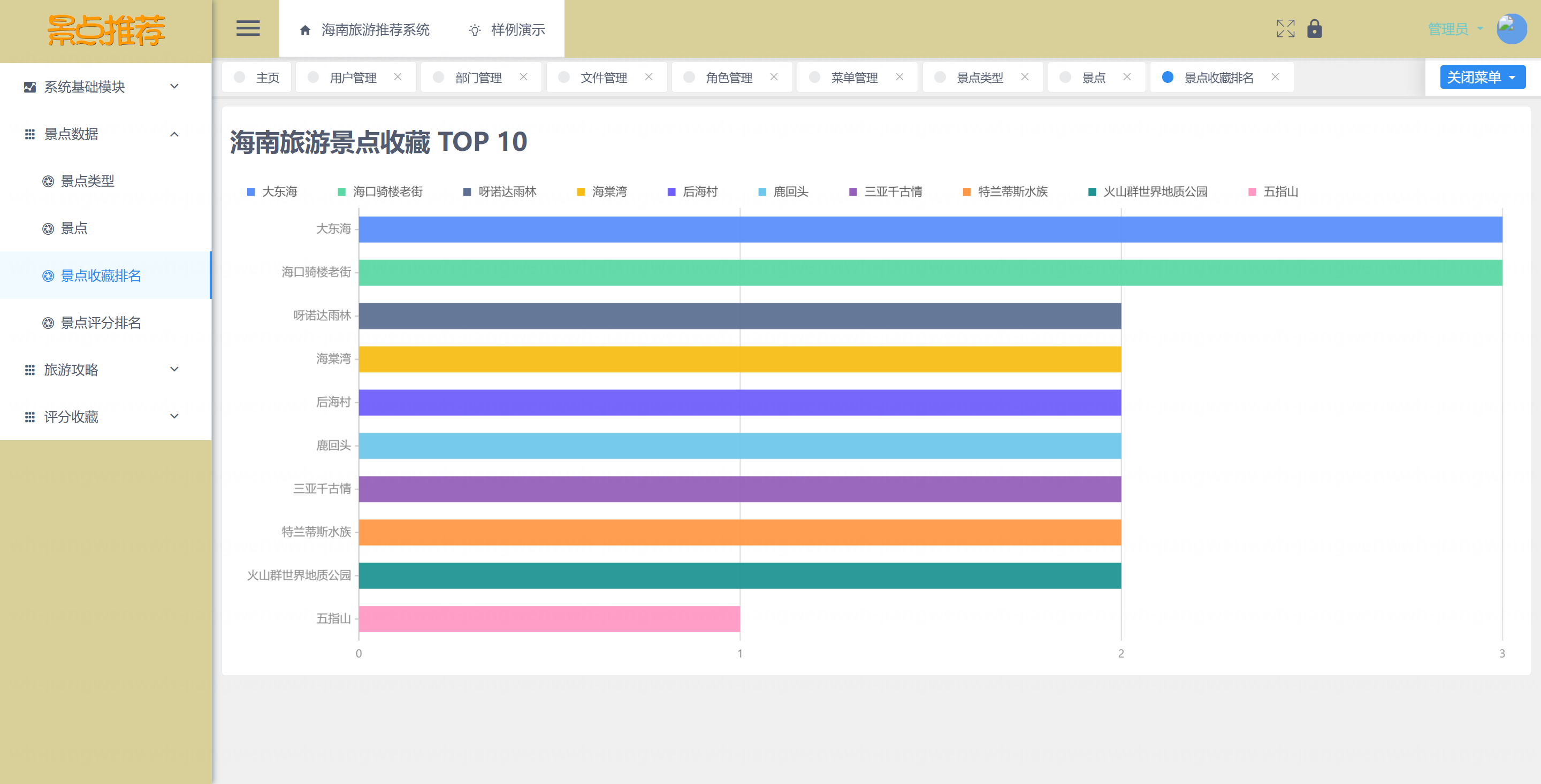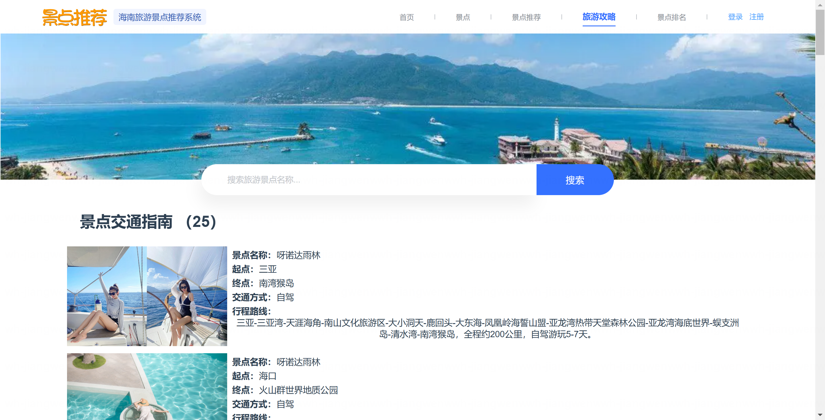 本项目为基于 Spring Boot + Vue 的海南旅游景点推荐系统,分为 管理员(后台) 与 普通用户/游客两类角色。系统已实现的主要功能如下:
