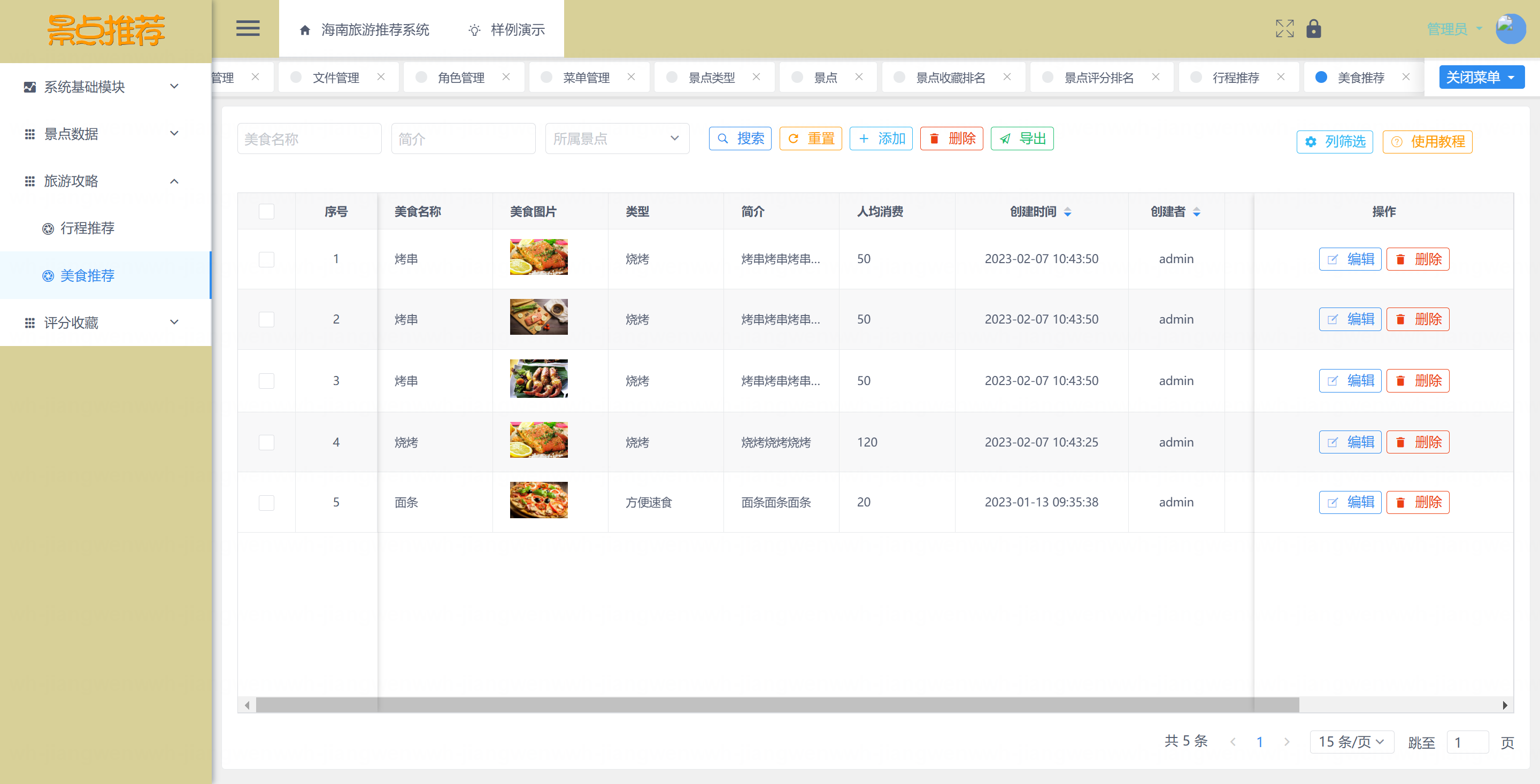 - 美食管理:美食信息发布/修改/删除/查询管理。