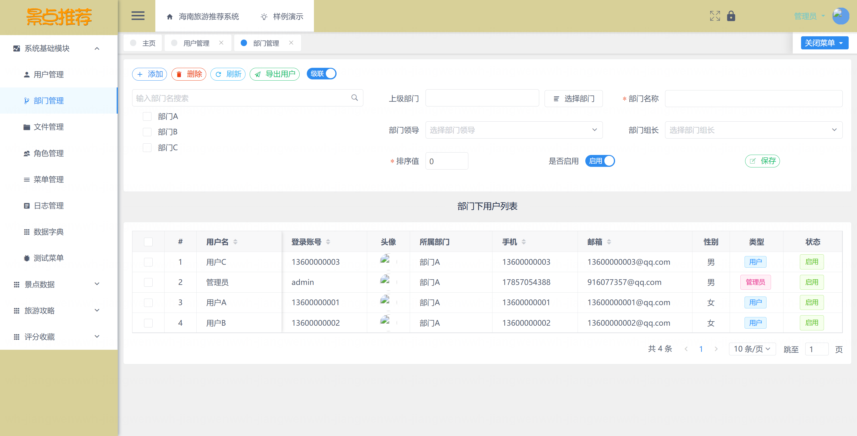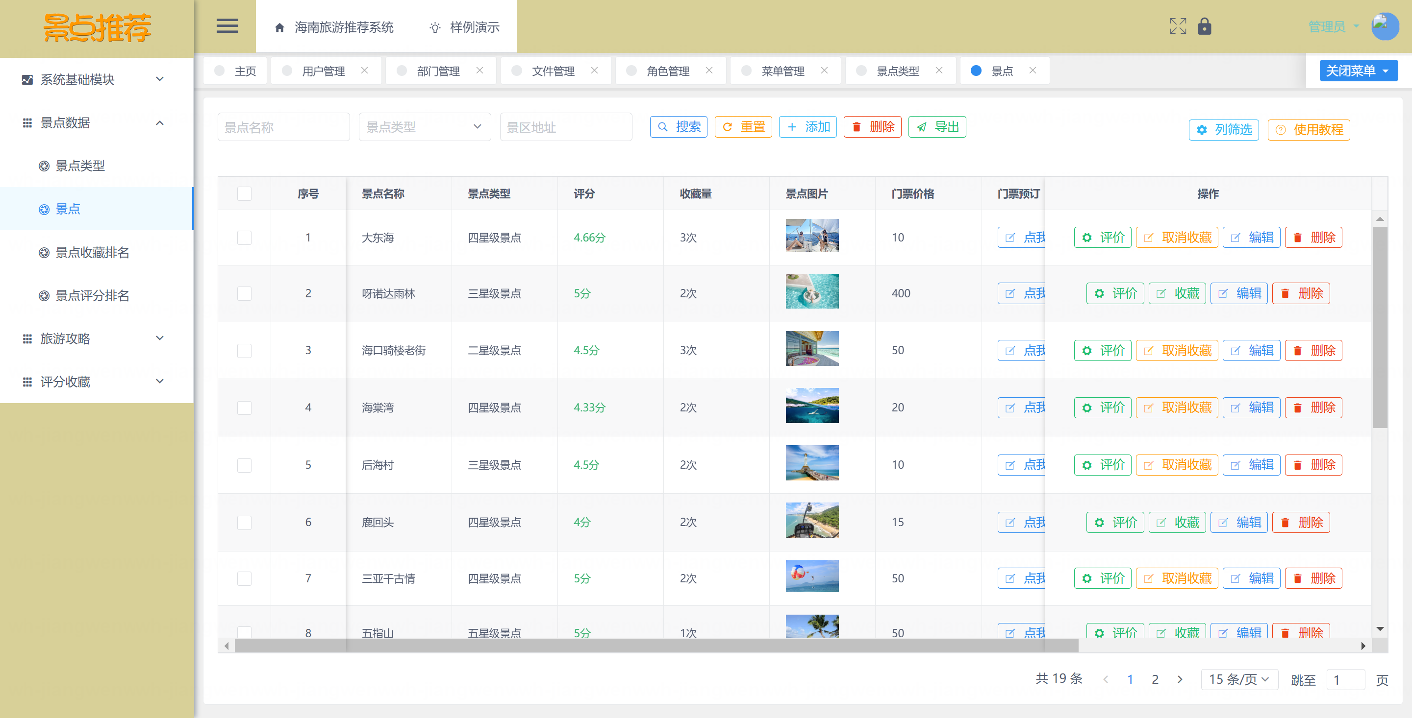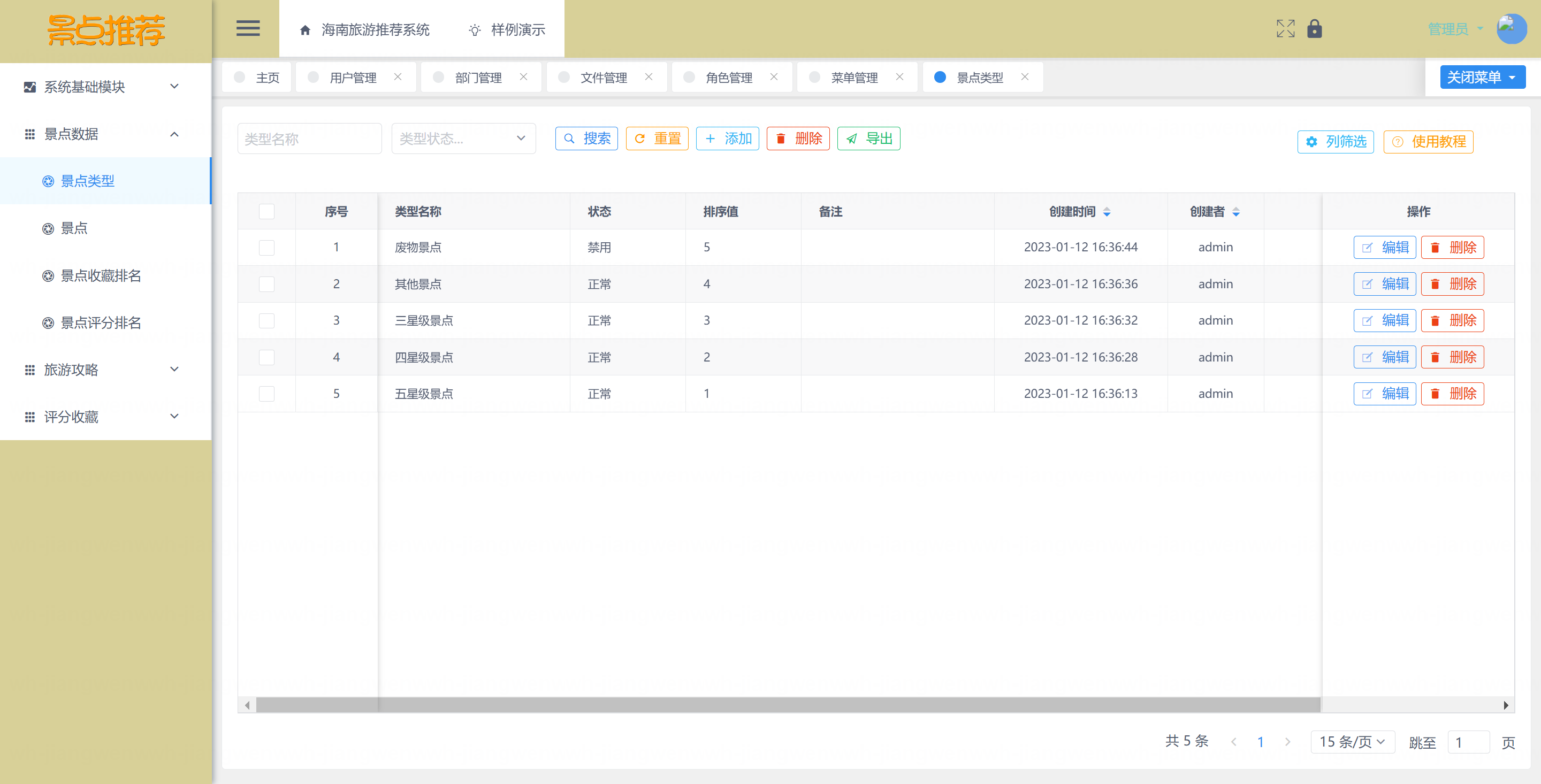 - 景点管理:景点信息的全面 CRUD、景点类型管理、景点图片管理、景点推荐排名。
