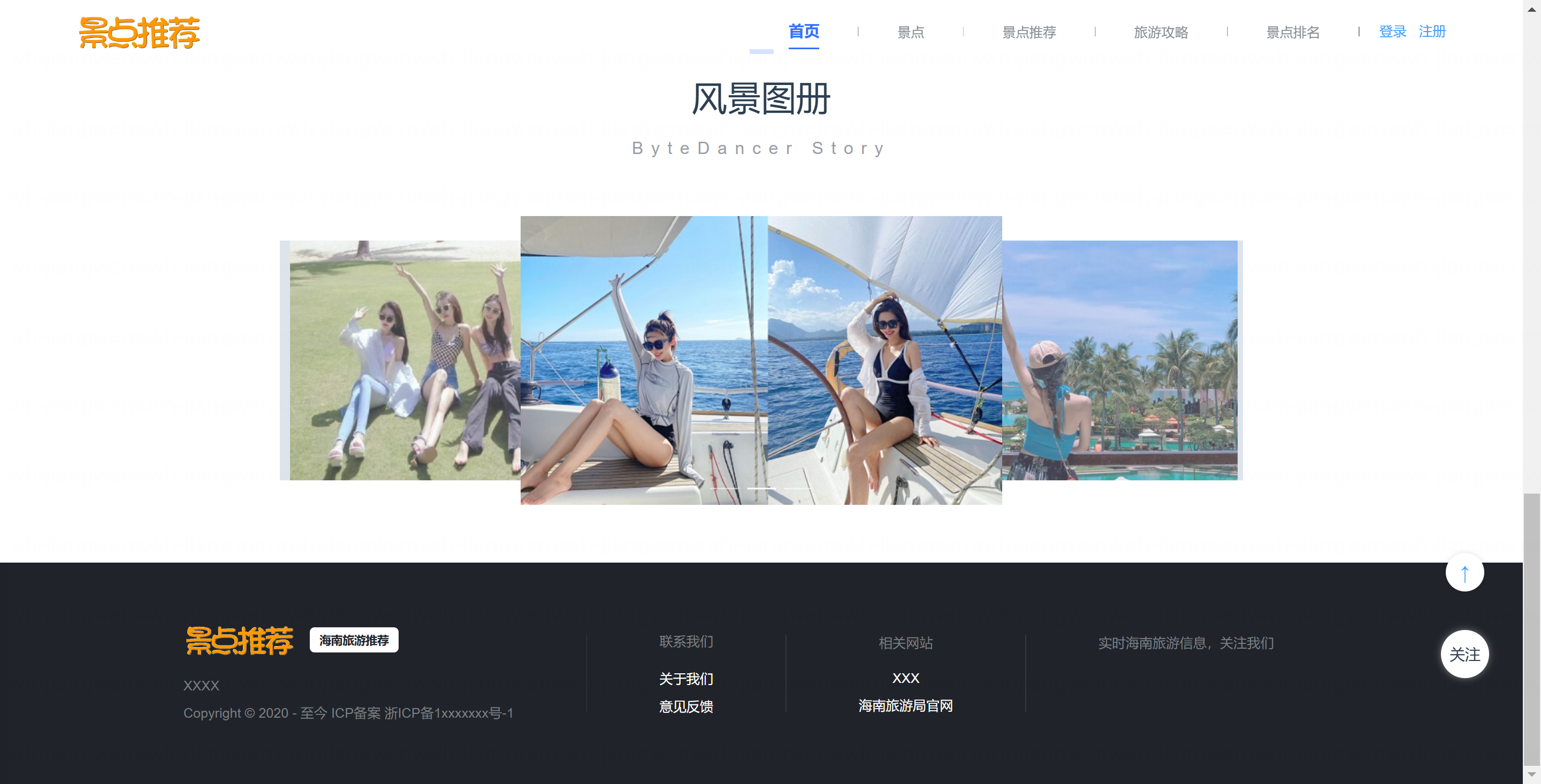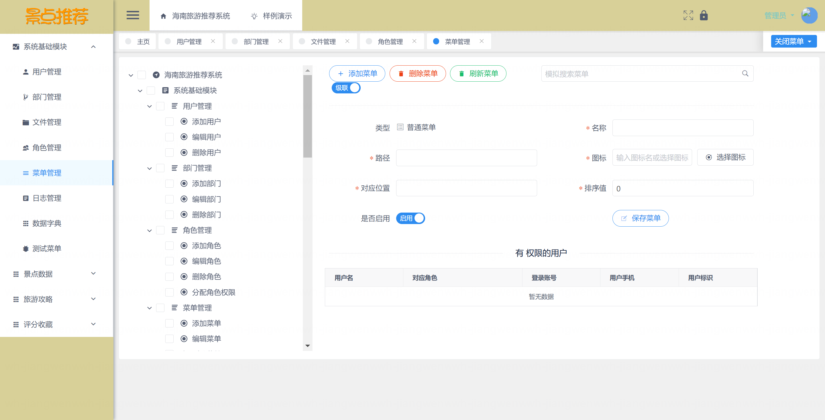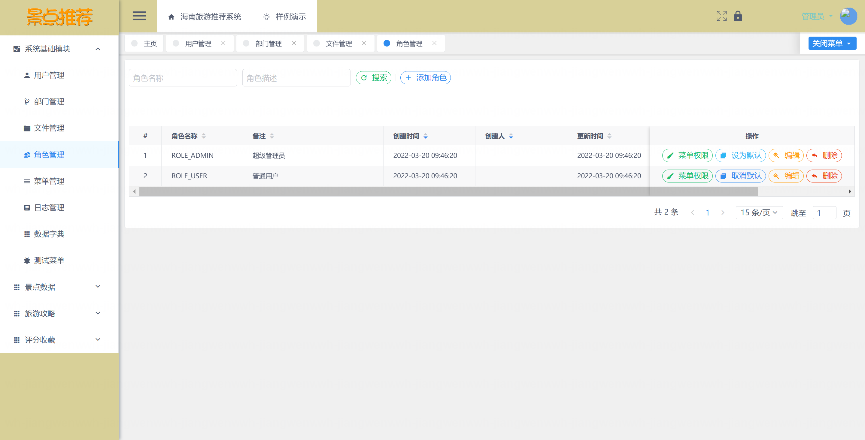 - 景点管理:景点信息的全面 CRUD、景点类型管理、景点图片管理、景点推荐排名。