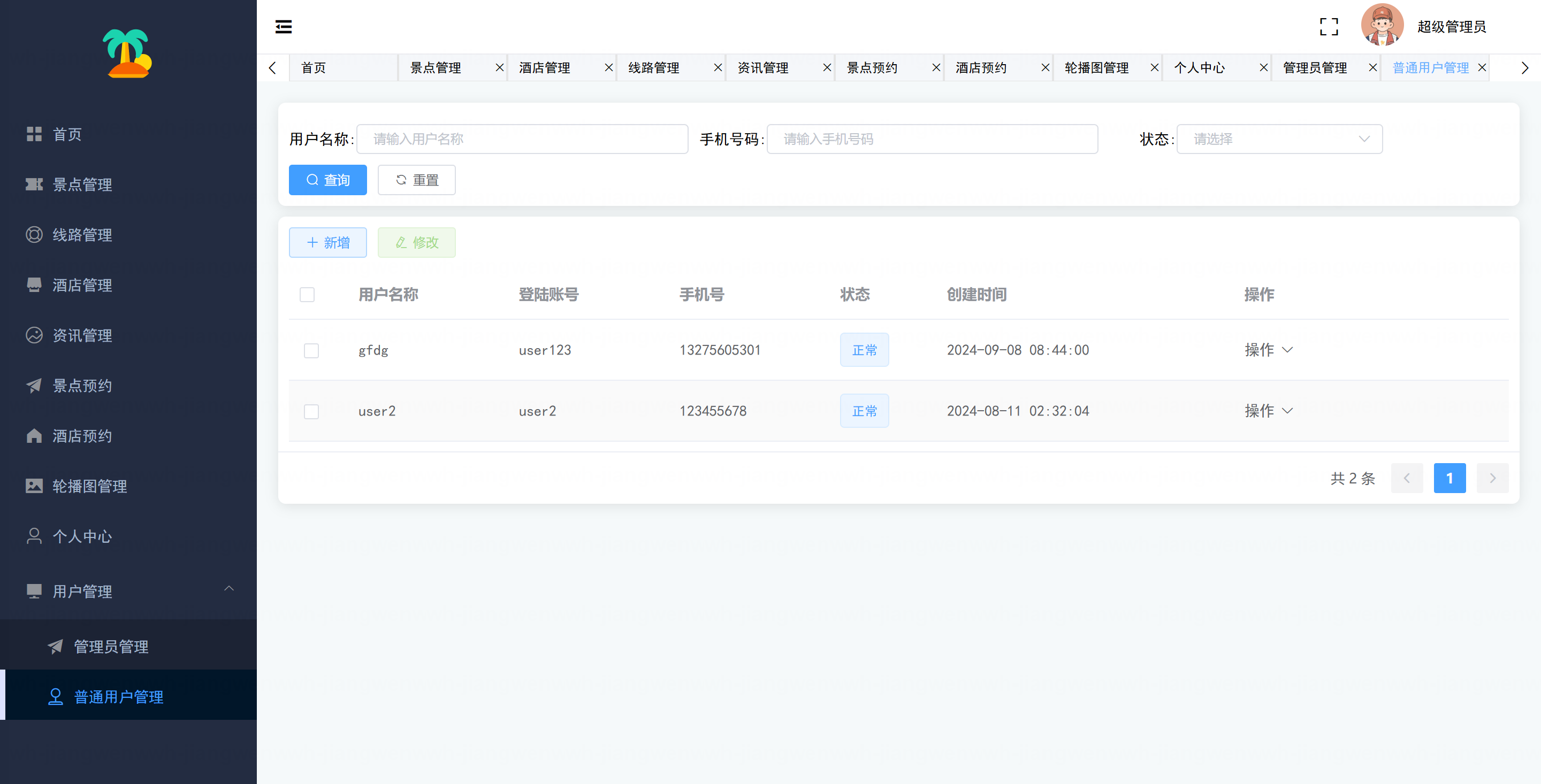 - 旅游内容管理:景点管理(景点信息的全面 CRUD、预约管理)、旅游线路管理、酒店管理(酒店信息、房型管理、订单管理)