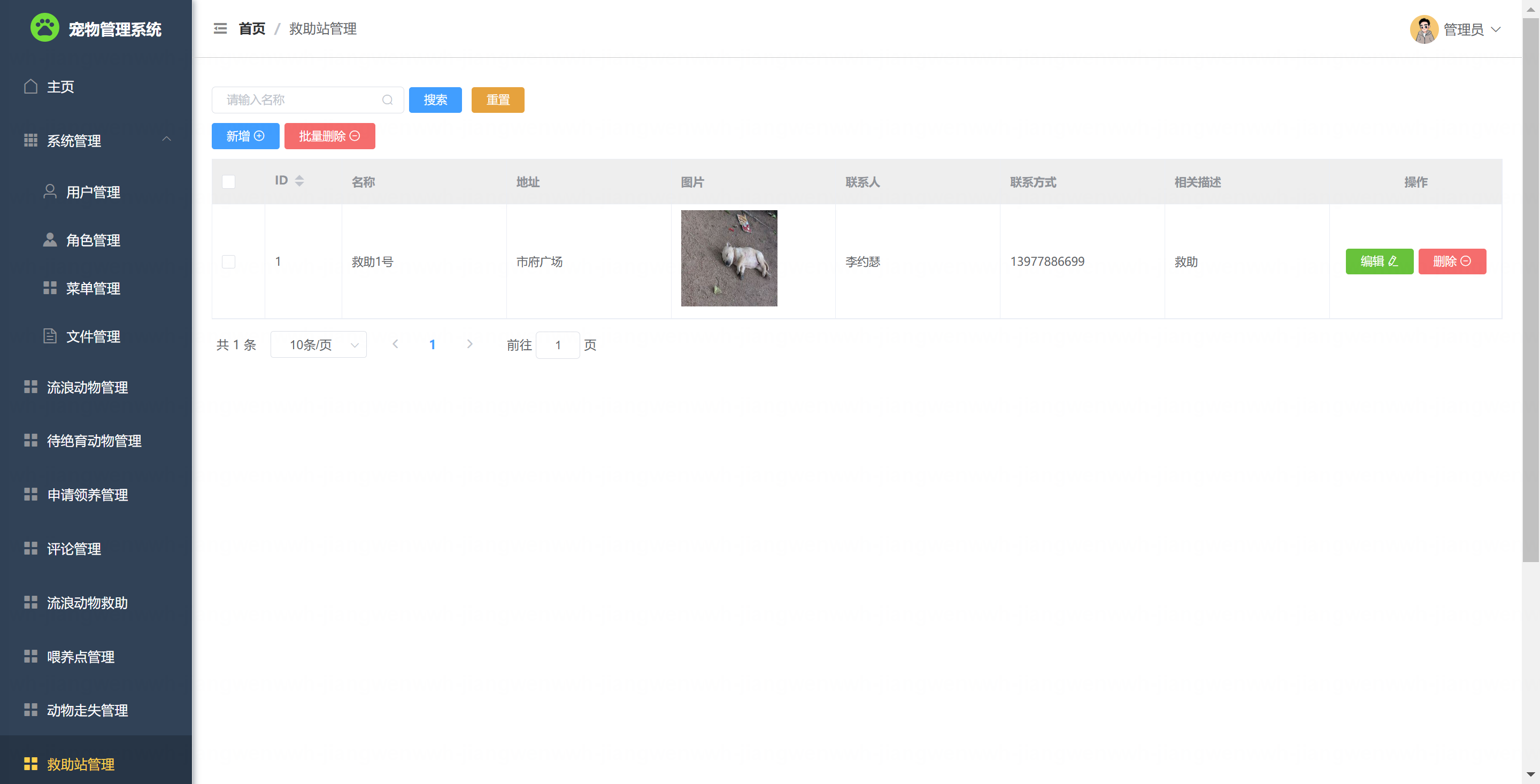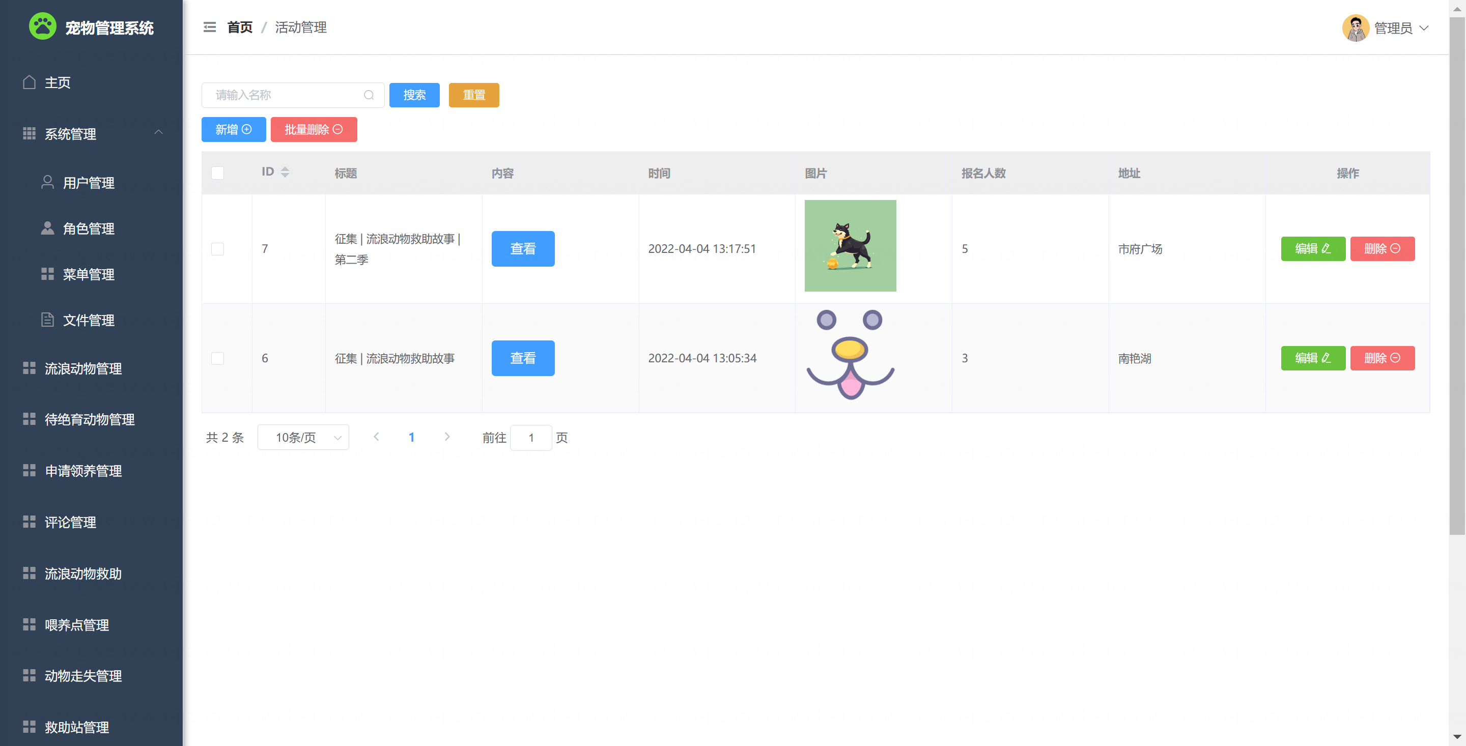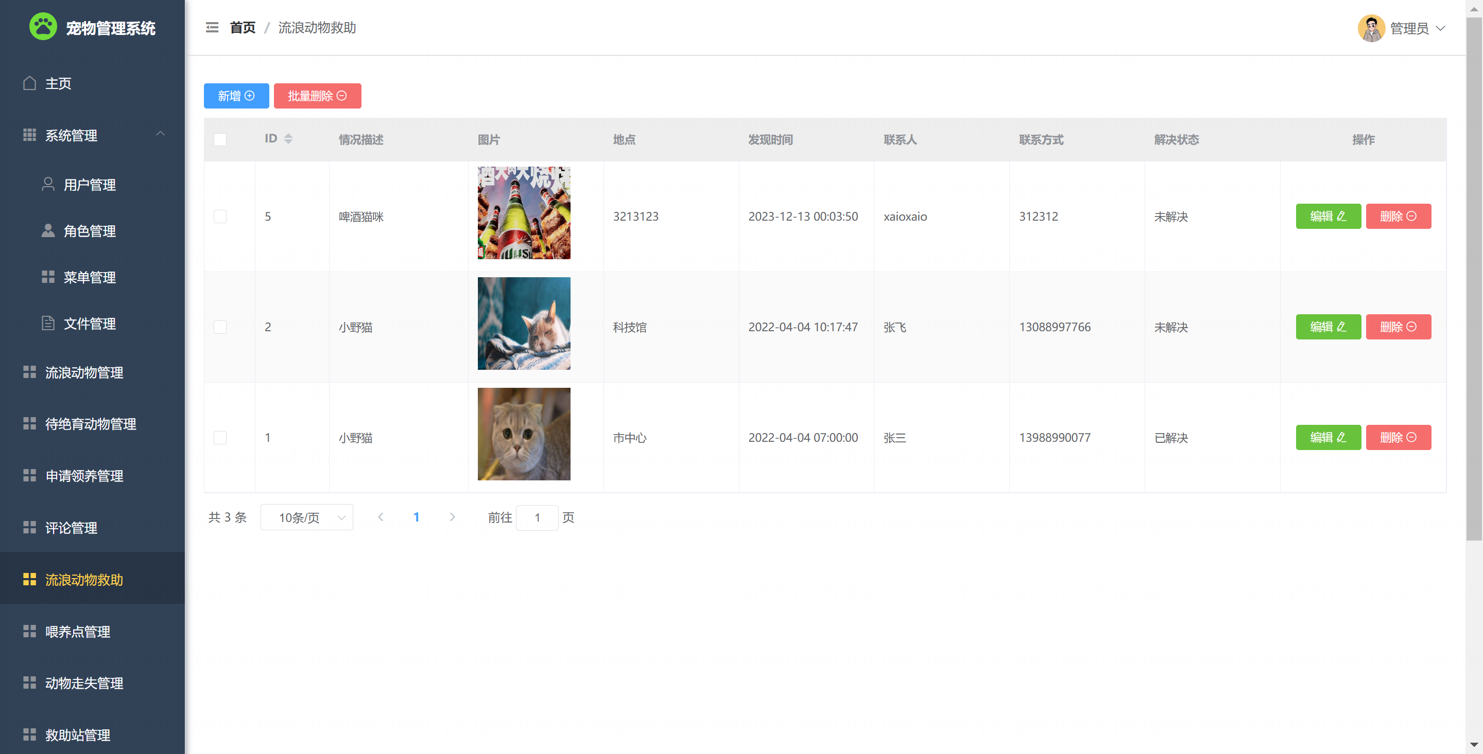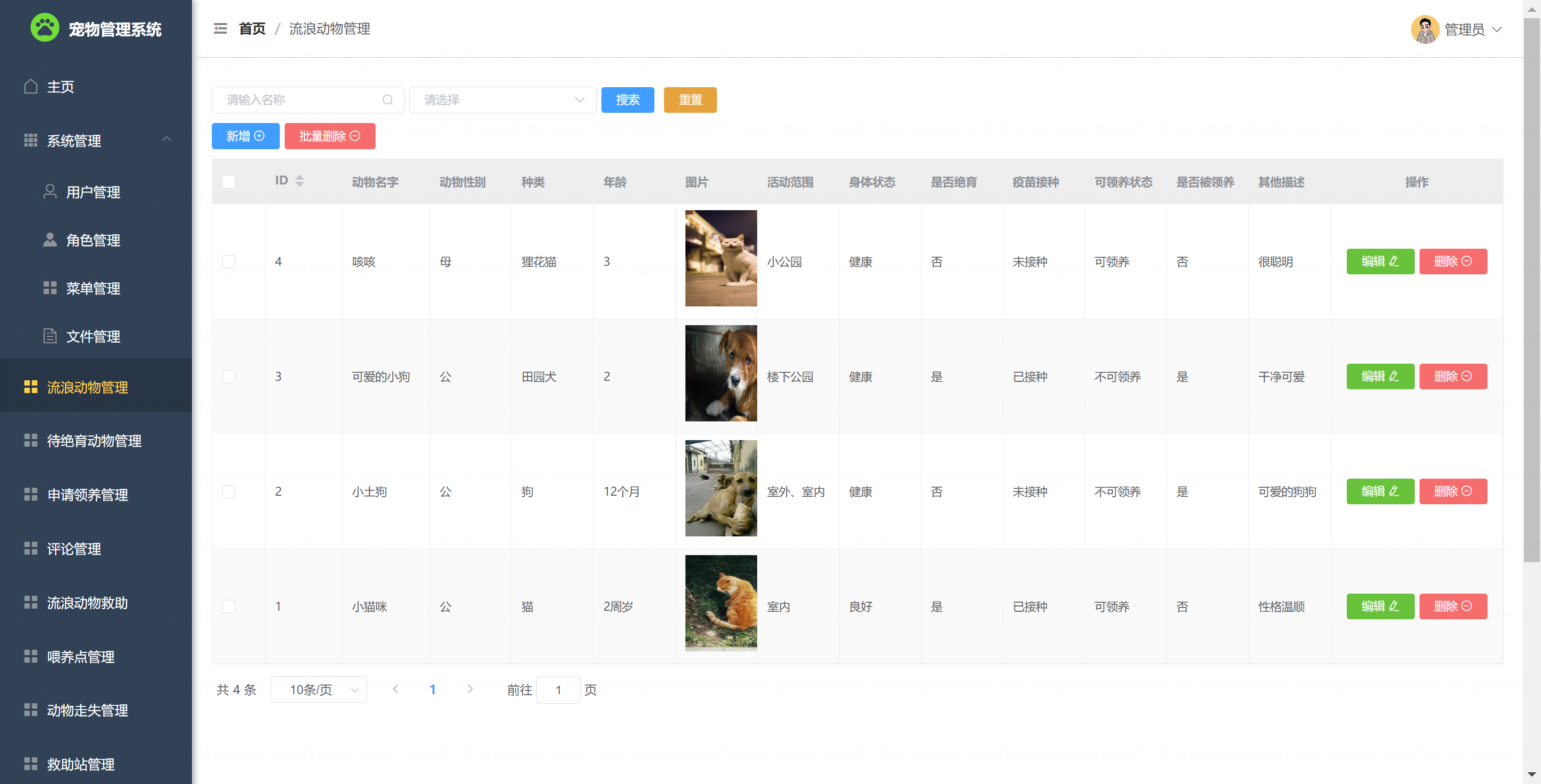 • 救助管理:流浪动物救助记录管理、救助状态更新。