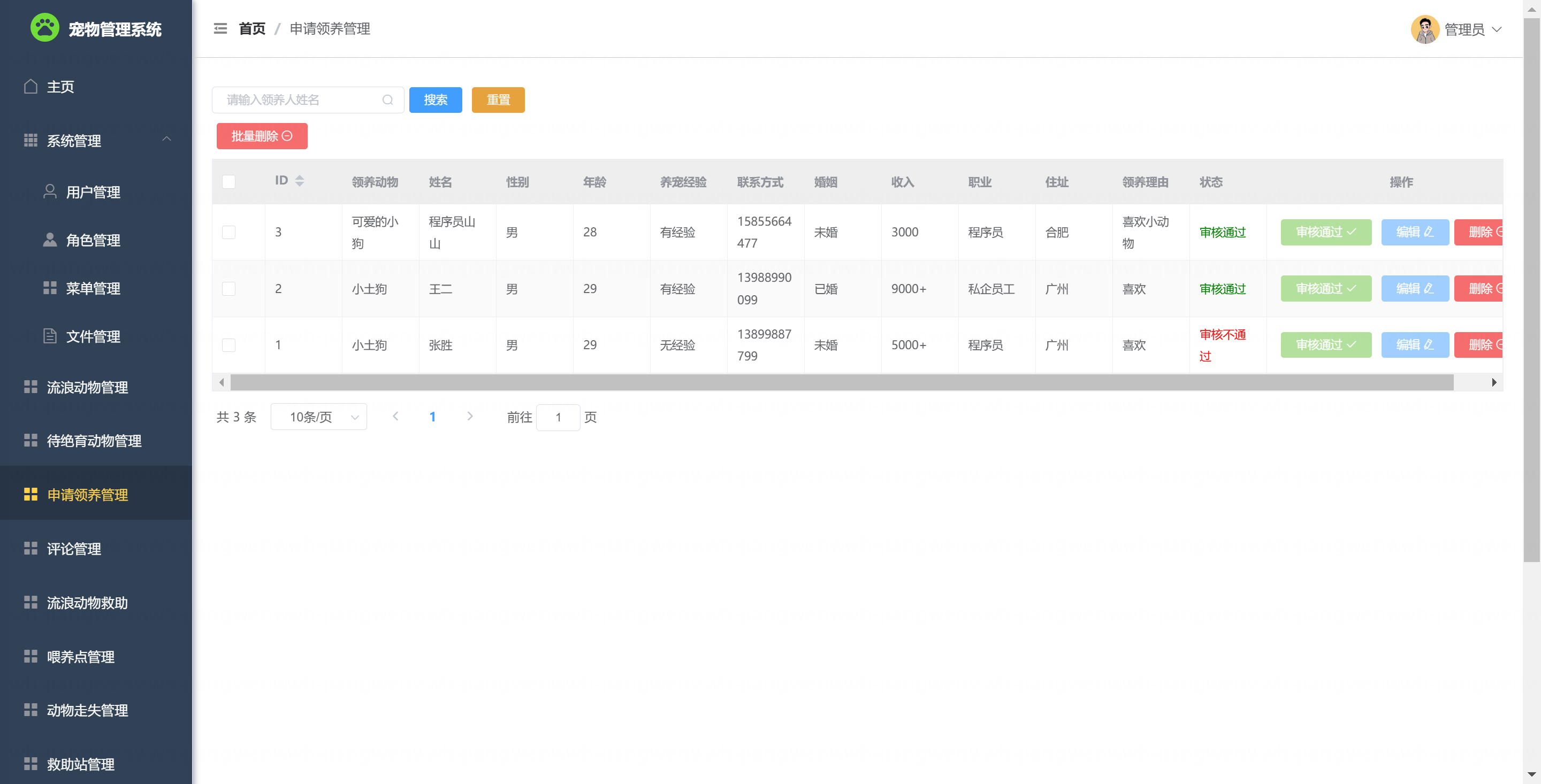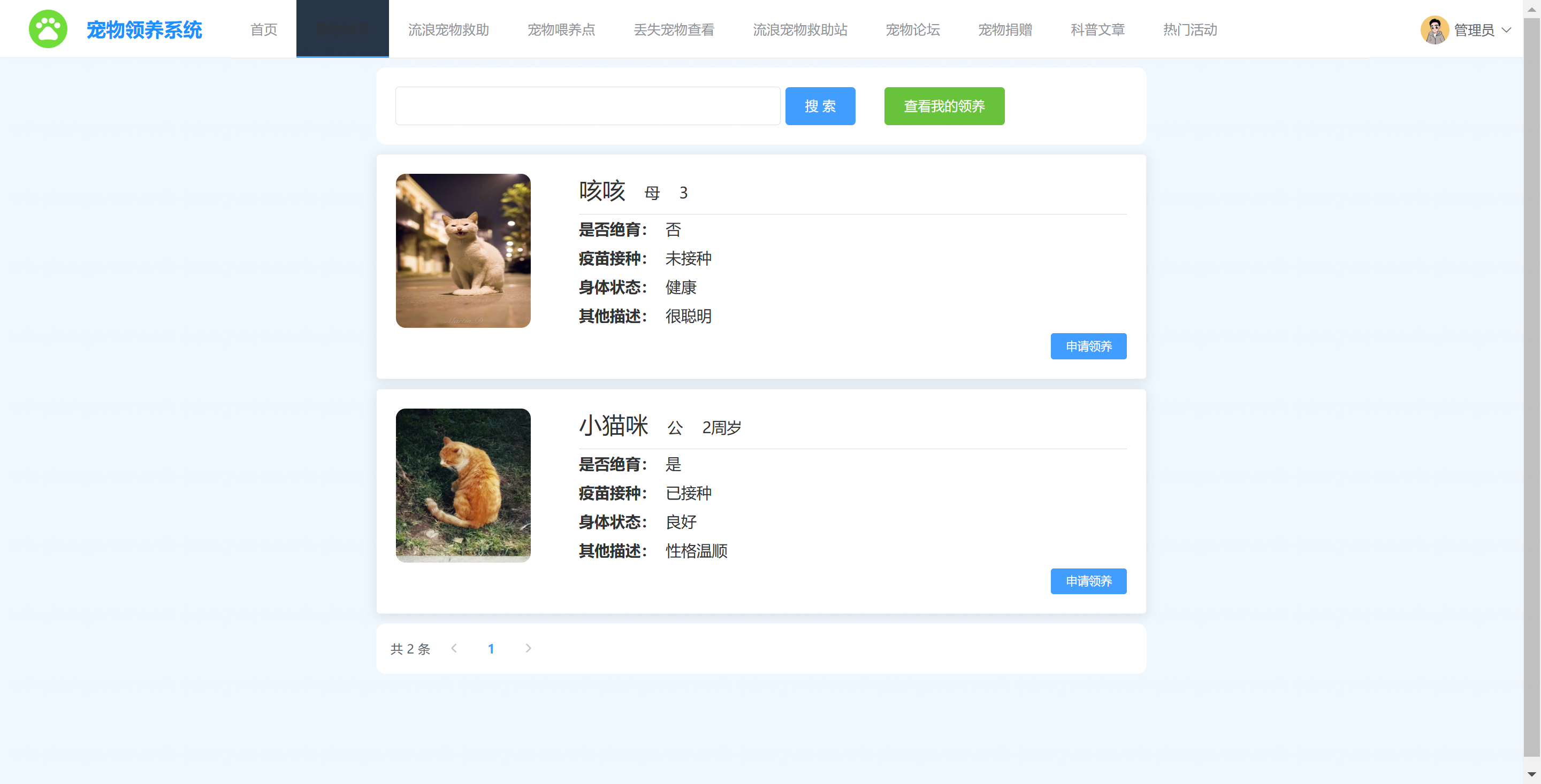 • 领养管理:领养申请审核、领养状态跟踪、申请记录管理。