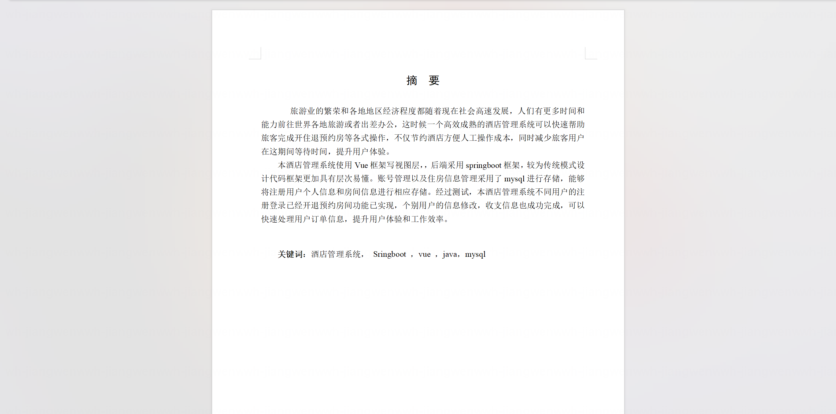 本项目为基于 Spring Boot + Vue 的酒店管理系统,分为 管理员(后台) 与 普通用户/游客两类角色。系统已实现的主要功能如下: