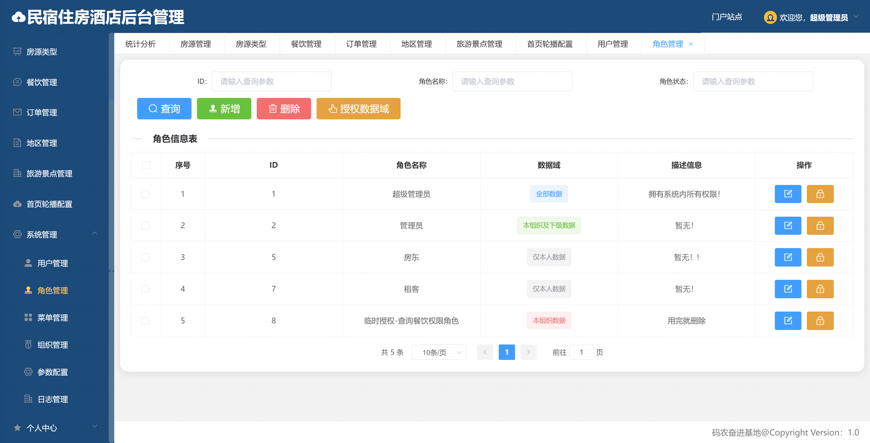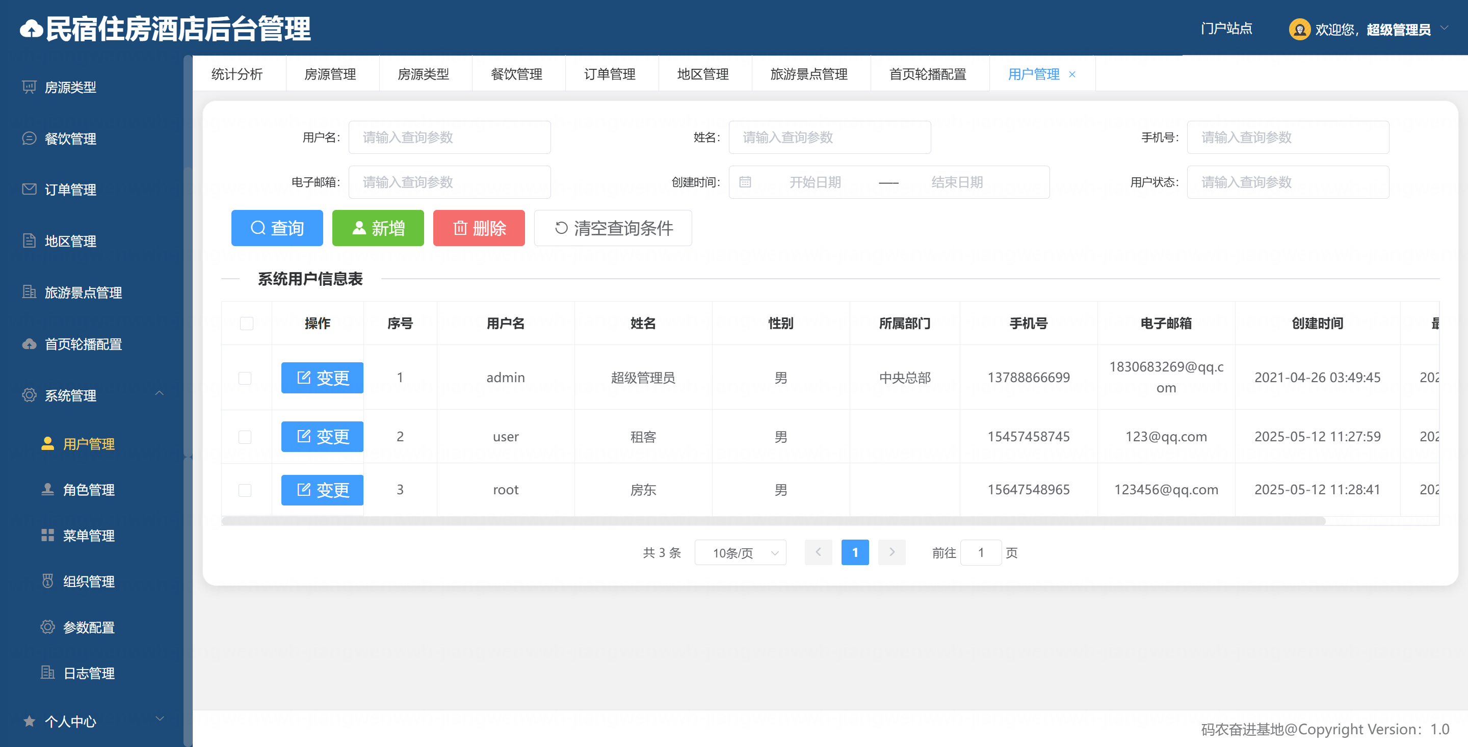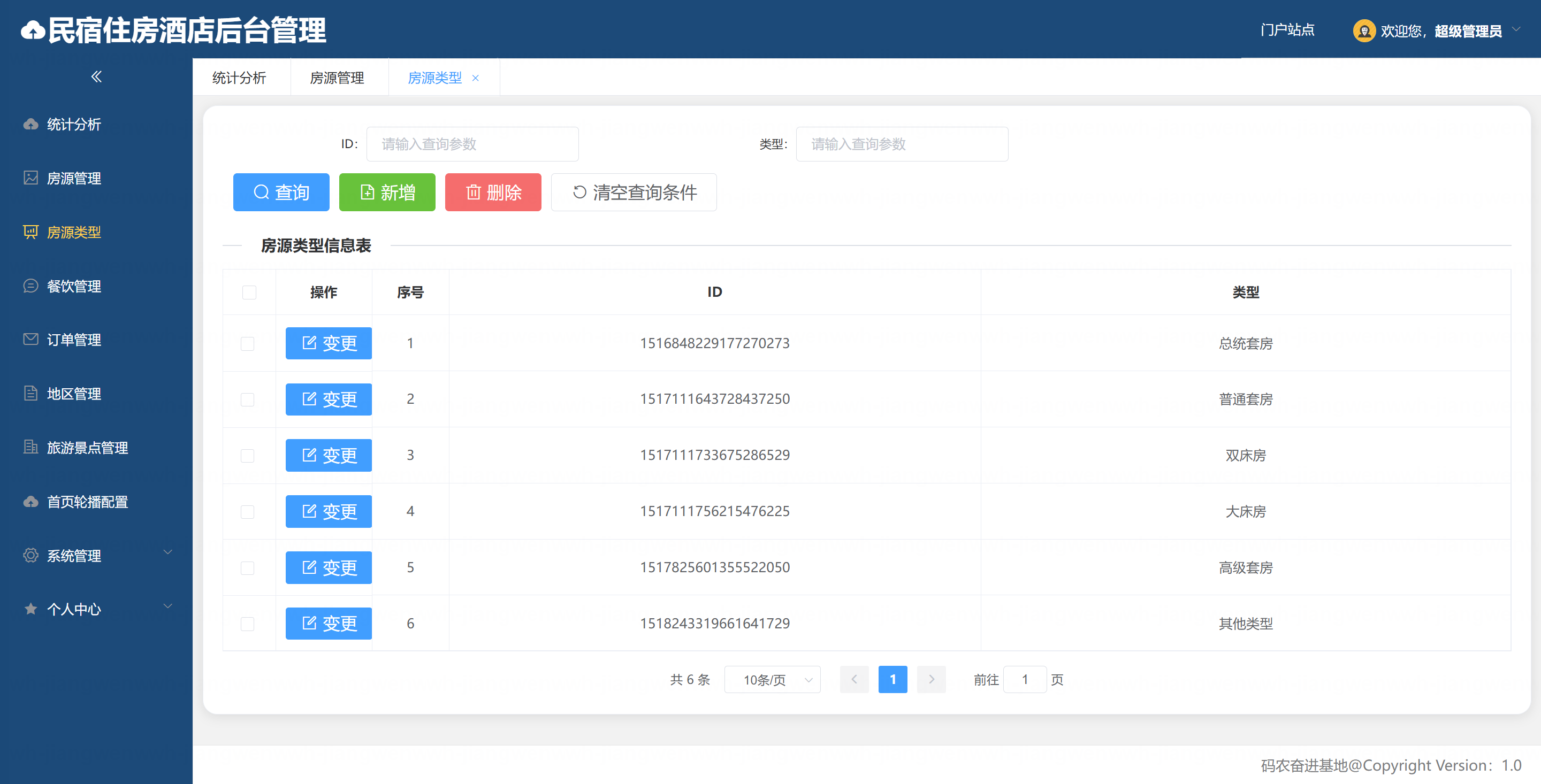 • 房源管理:房屋信息管理、房屋类型管理、房屋图片管理,支持房源的全面 CRUD 操作。