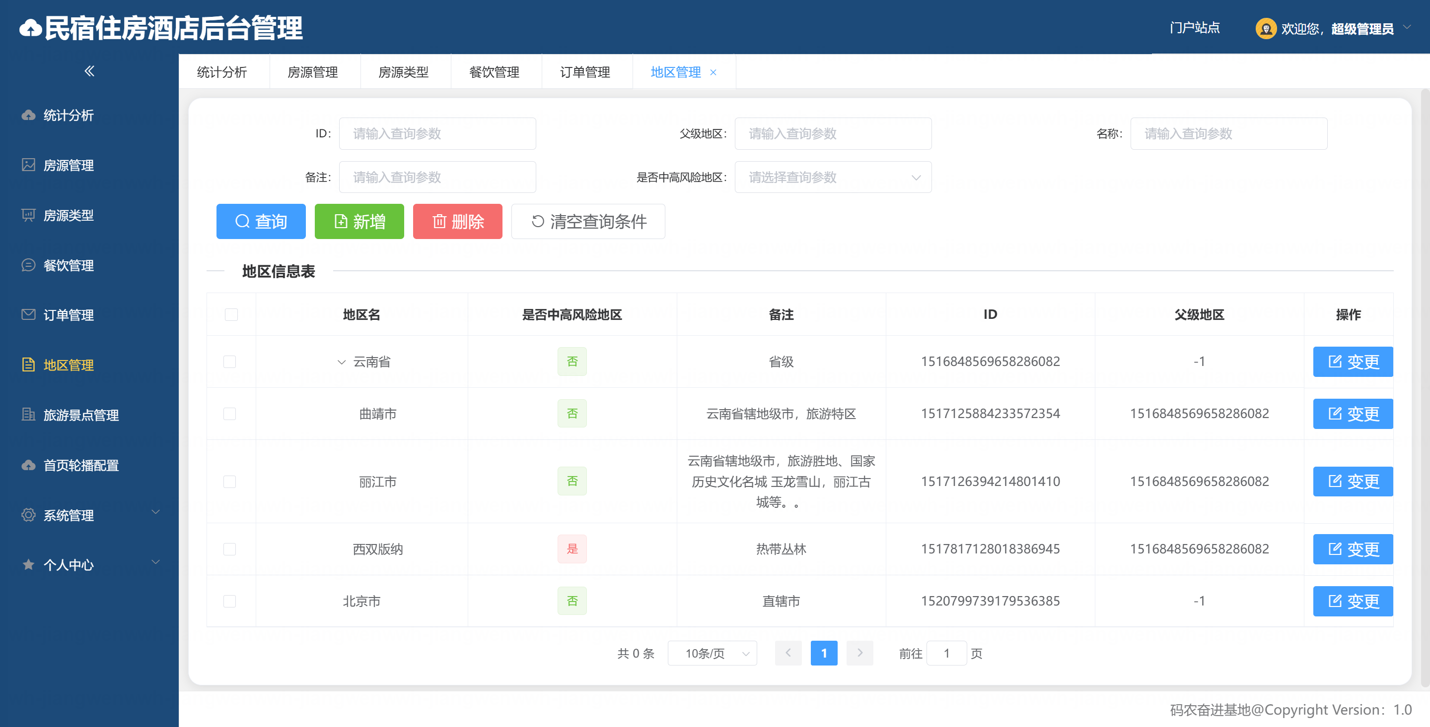 • 地区管理:地区信息的新增/修改/删除/查询。