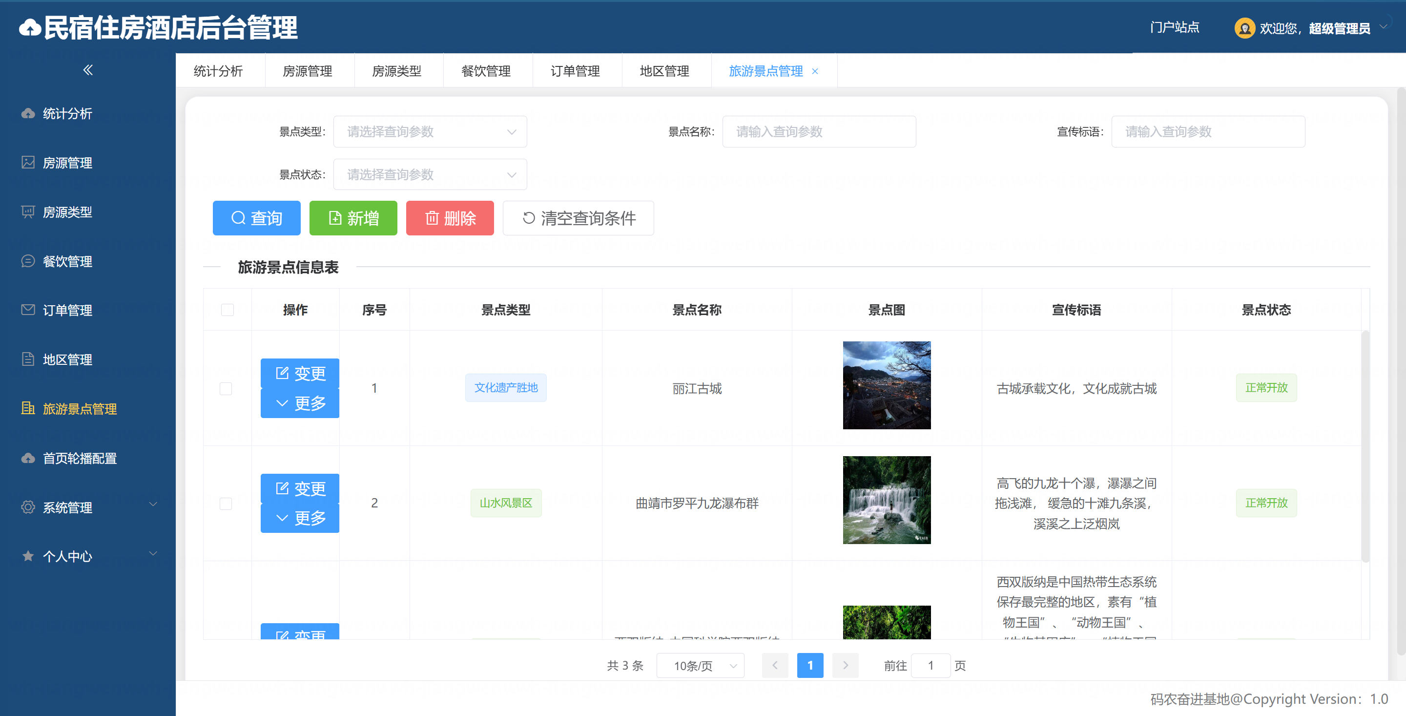 • 景点管理:景点信息管理,支持景点的 CRUD 操作。
