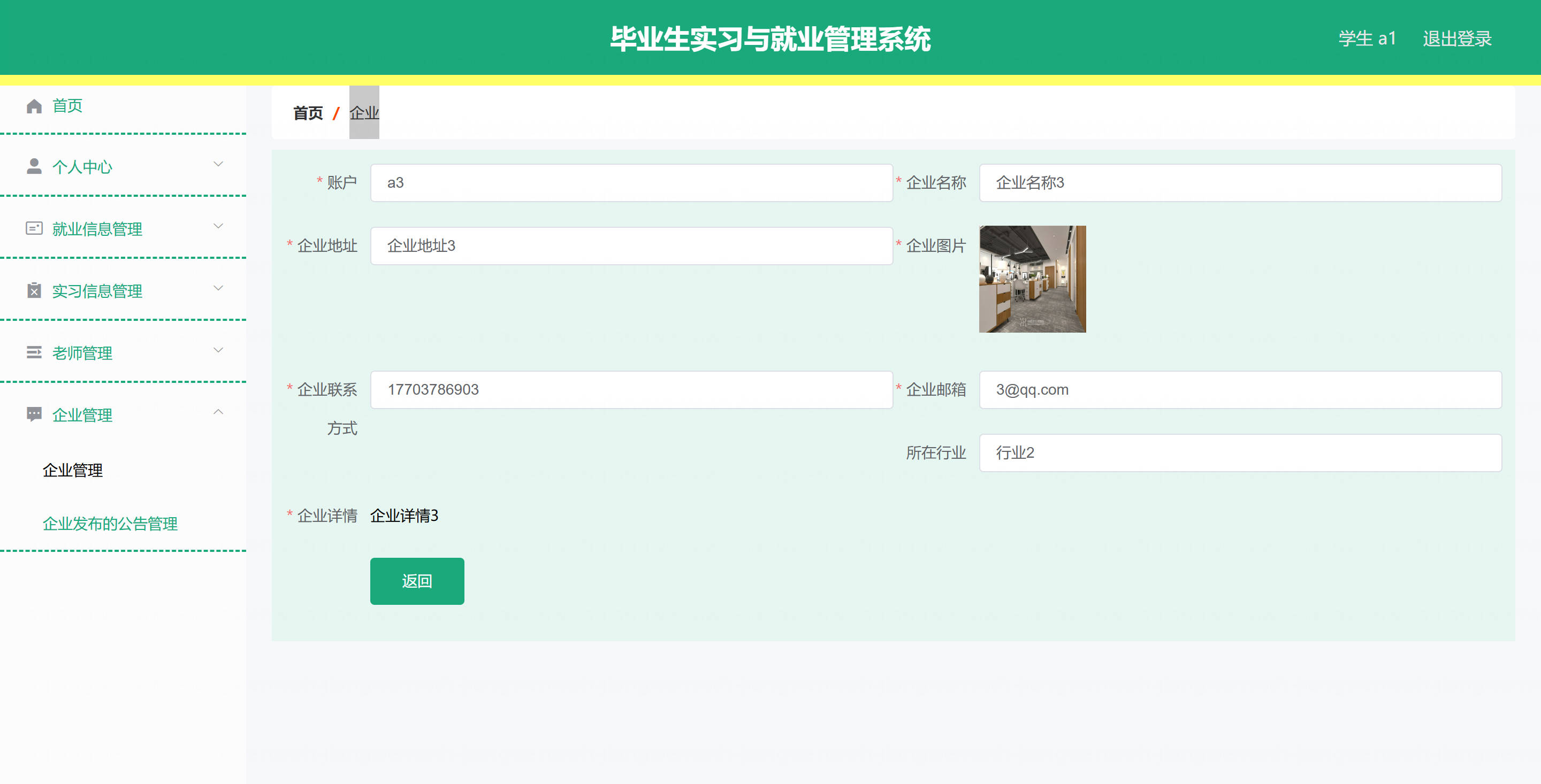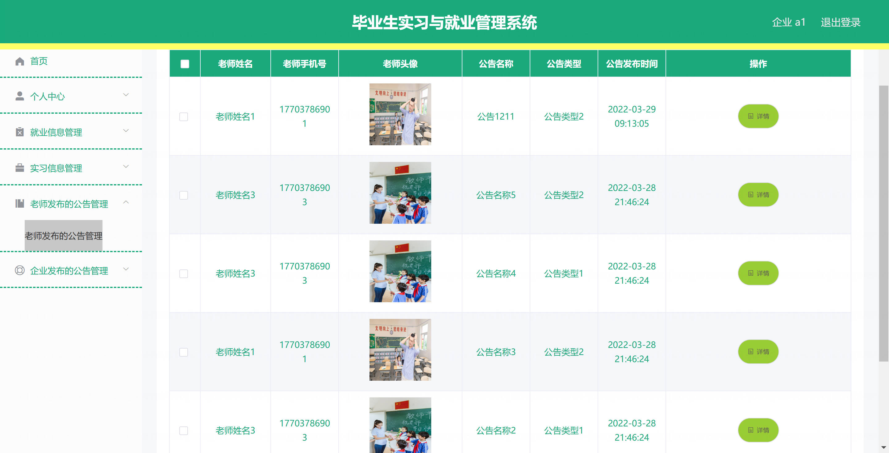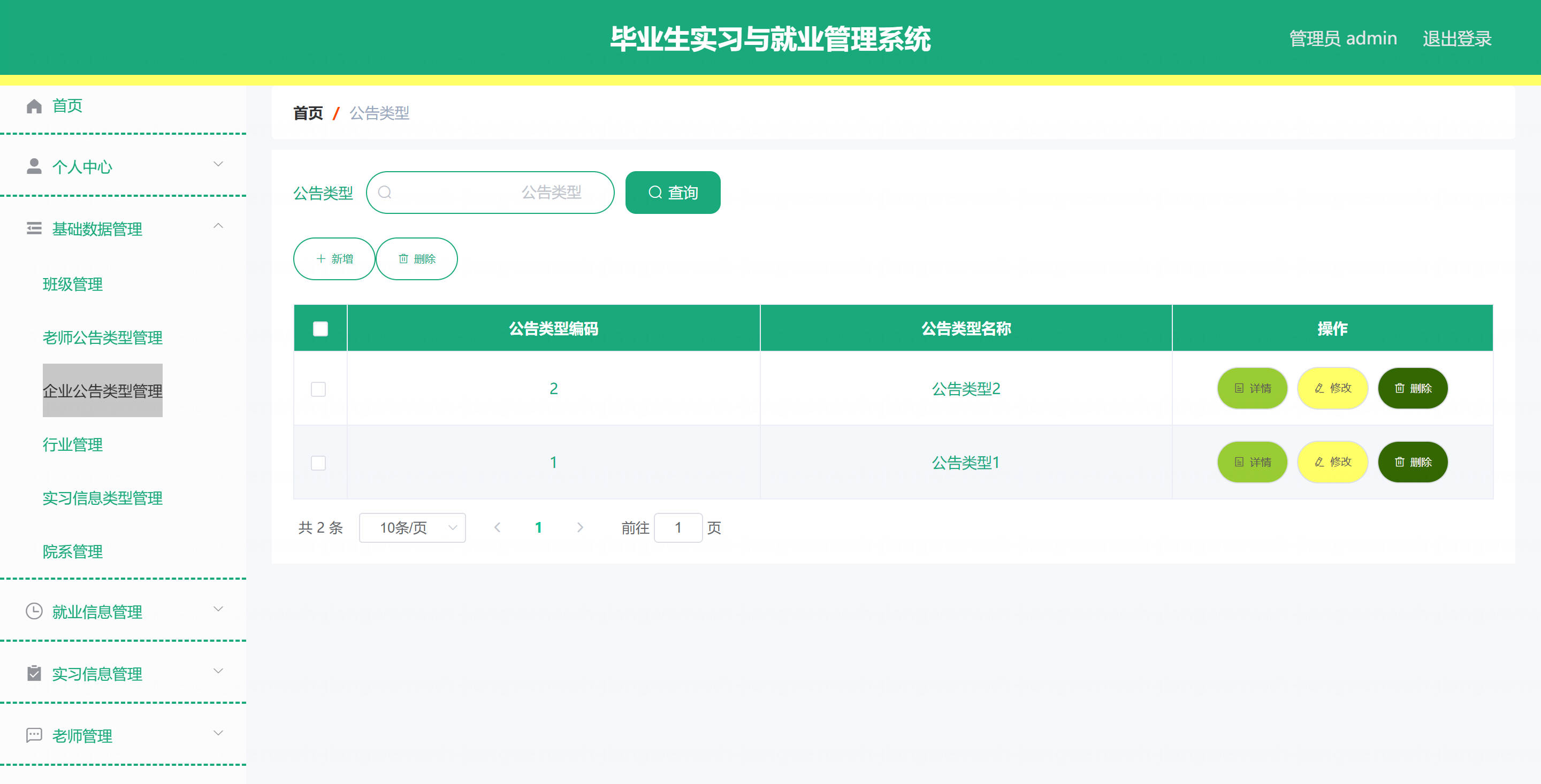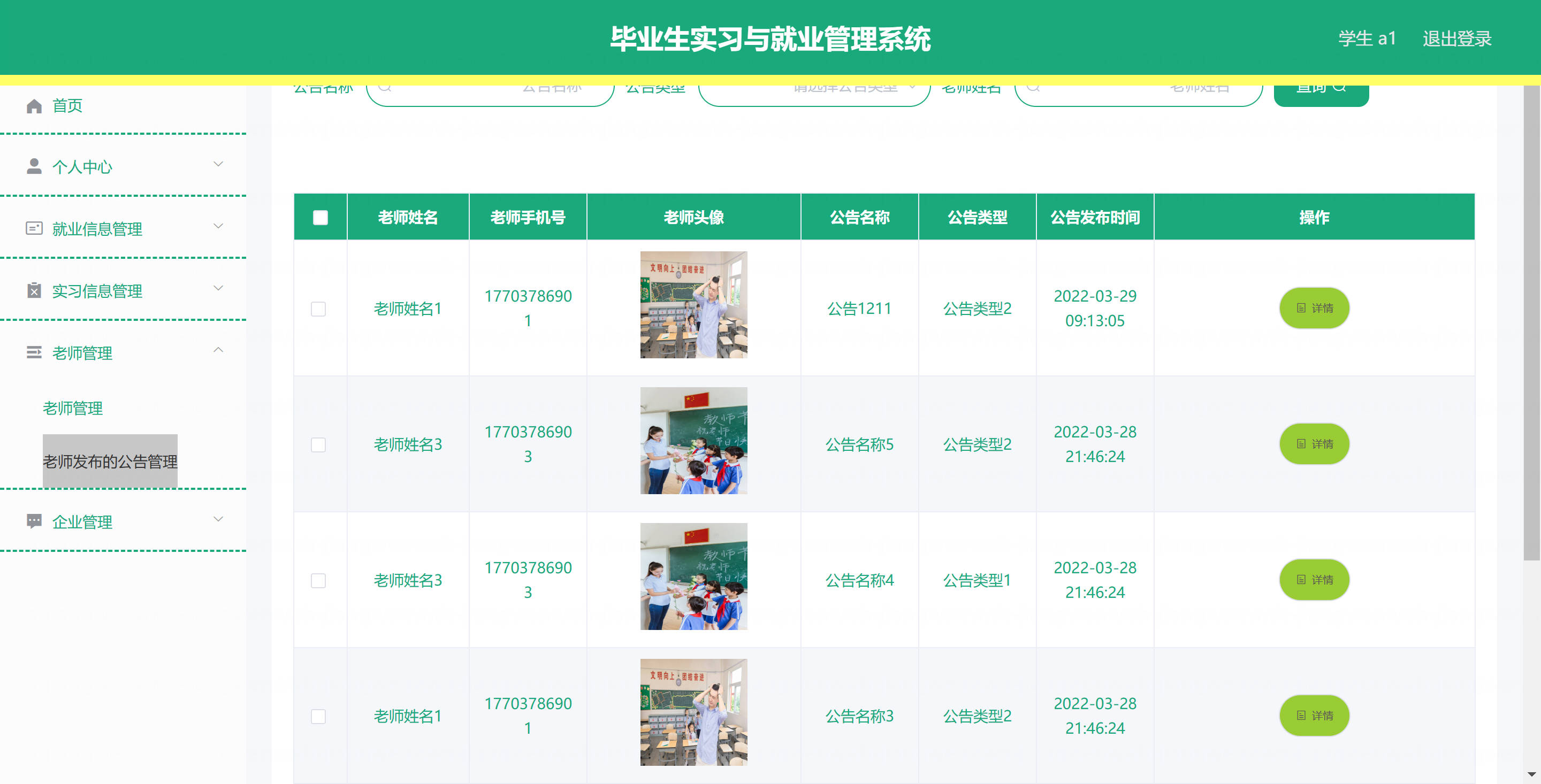 基于 Spring Boot 的毕业生实习与就业管理系统,系统角色为系统管理员、学生、教师和企业,主要功能如下