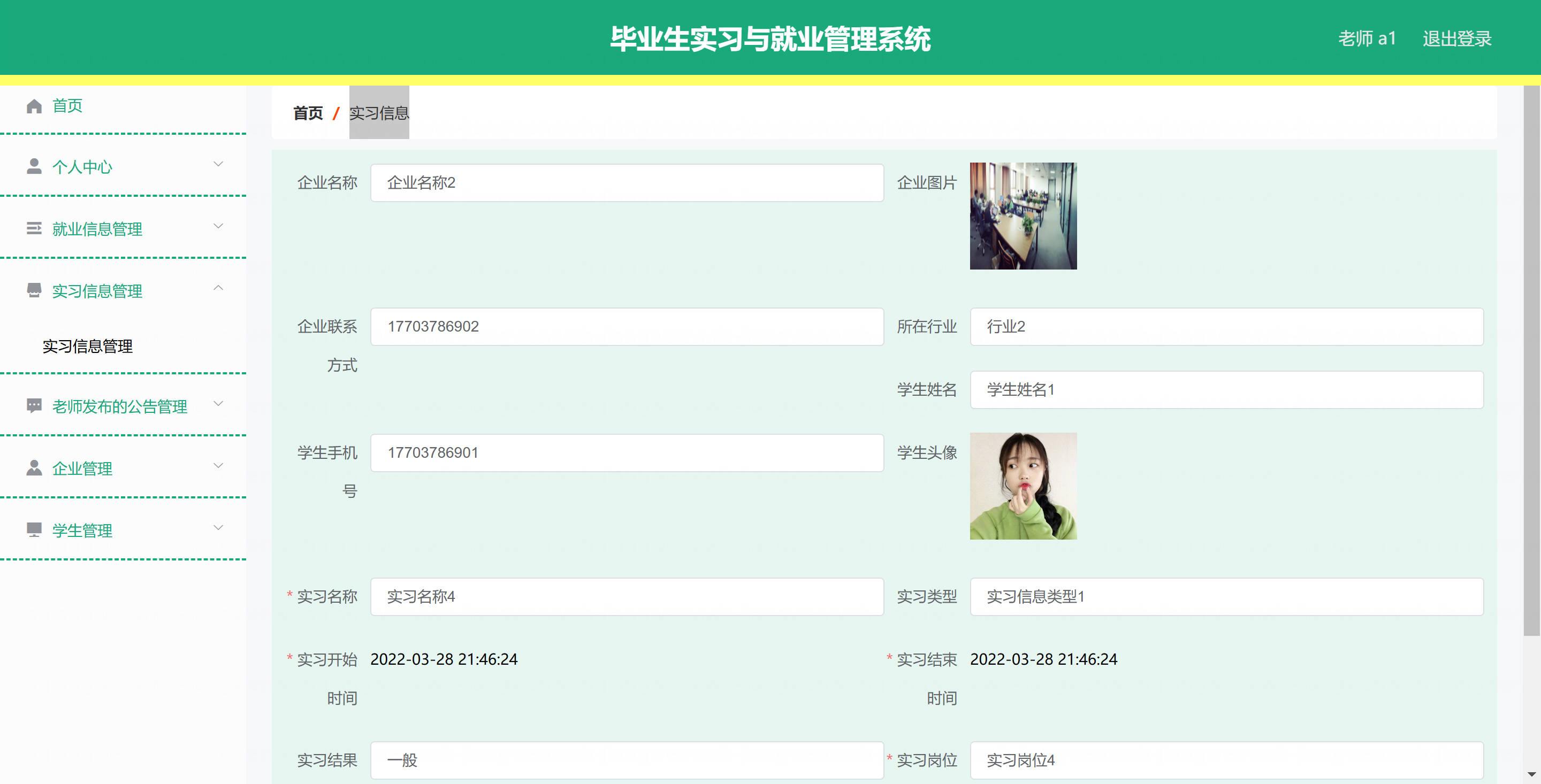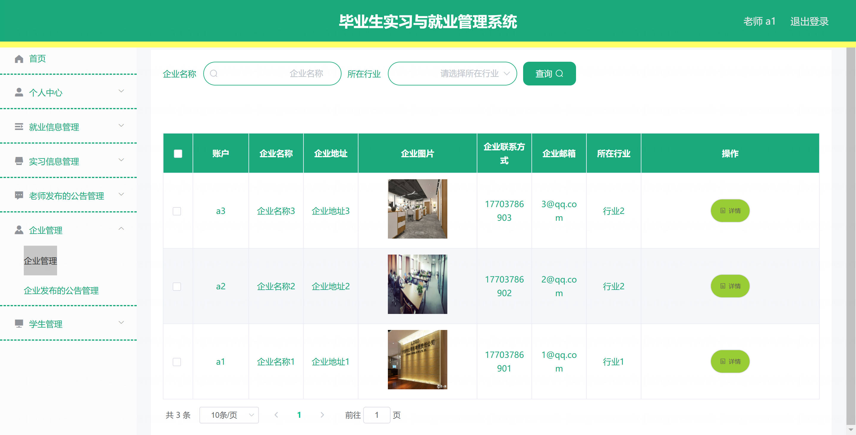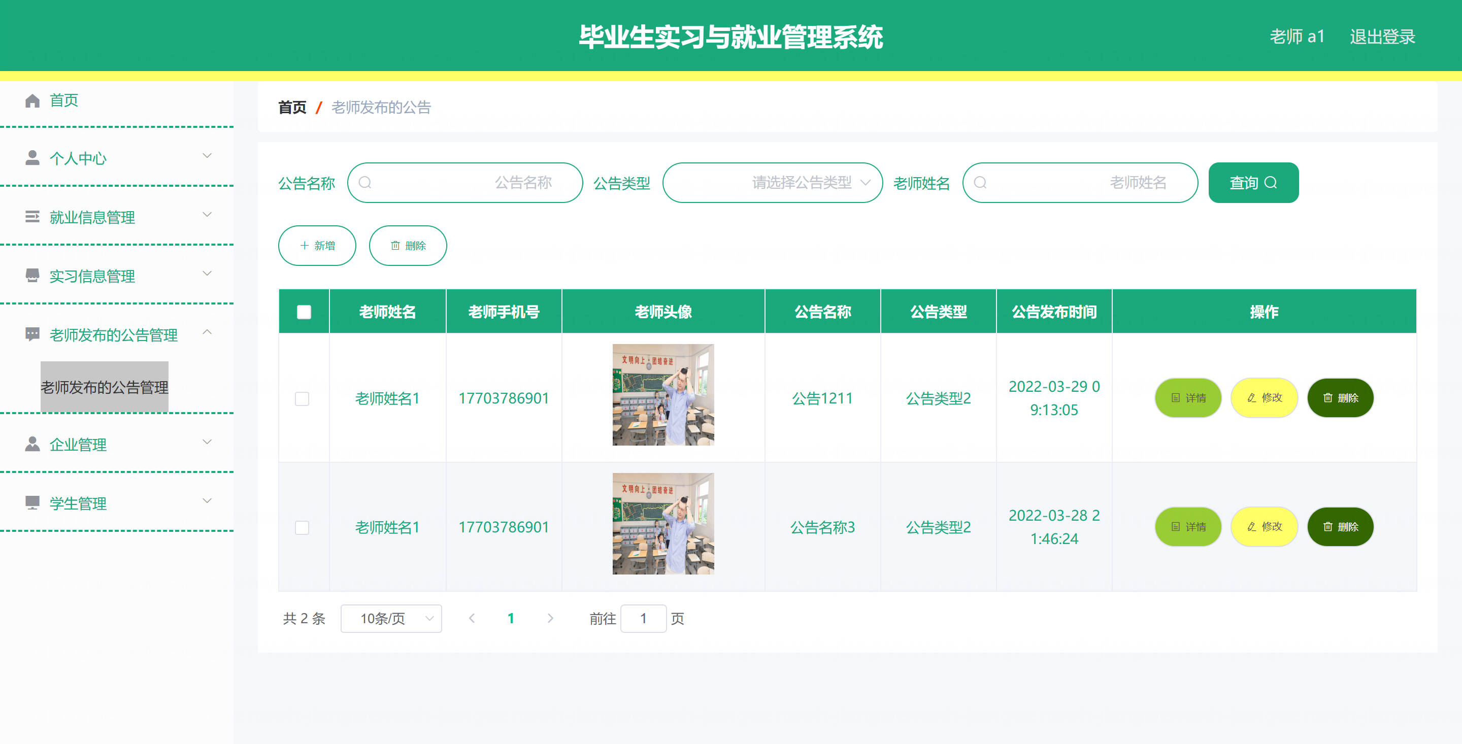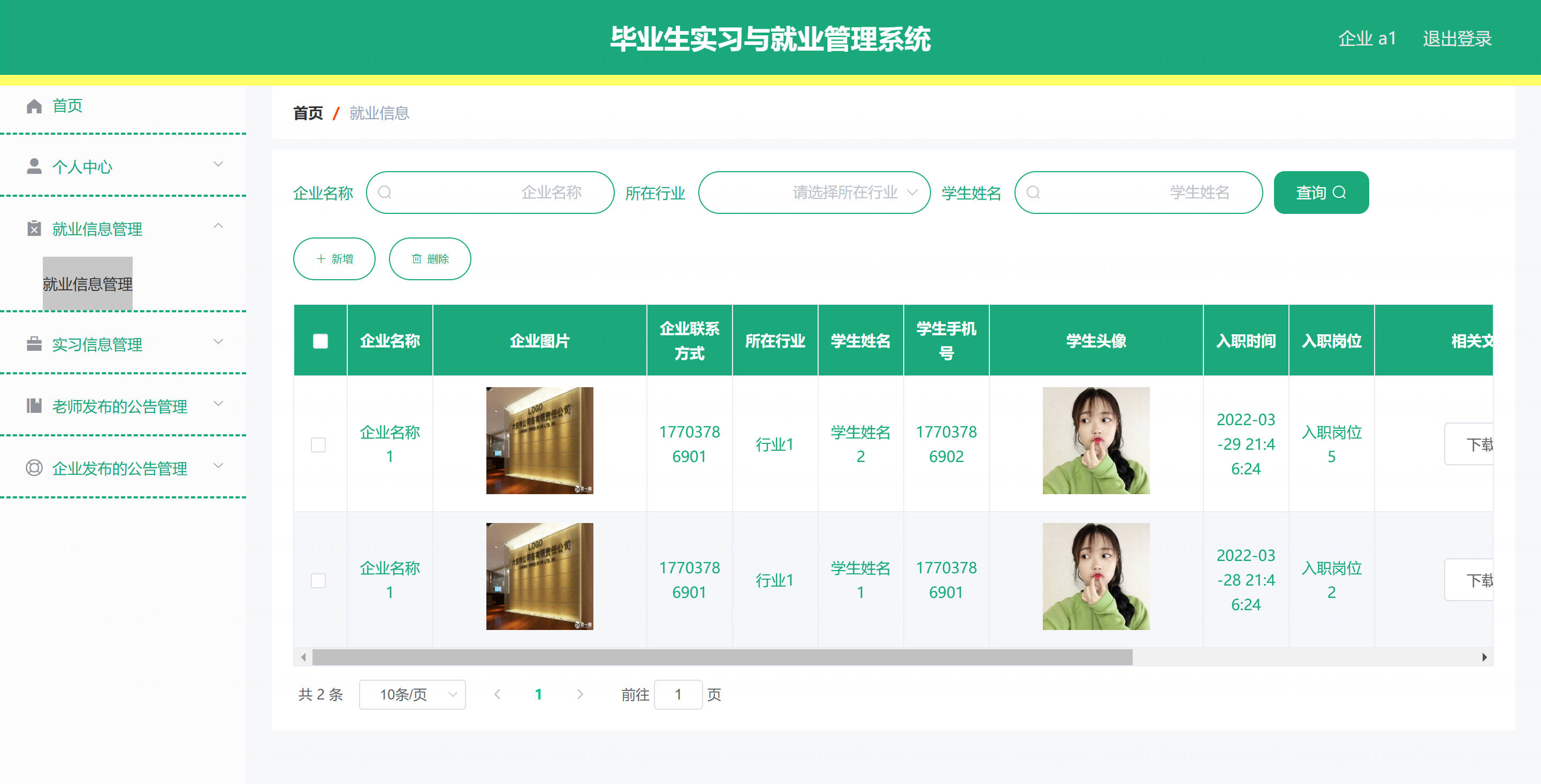基于 Spring Boot 的毕业生实习与就业管理系统,系统角色为系统管理员、学生、教师和企业,主要功能如下