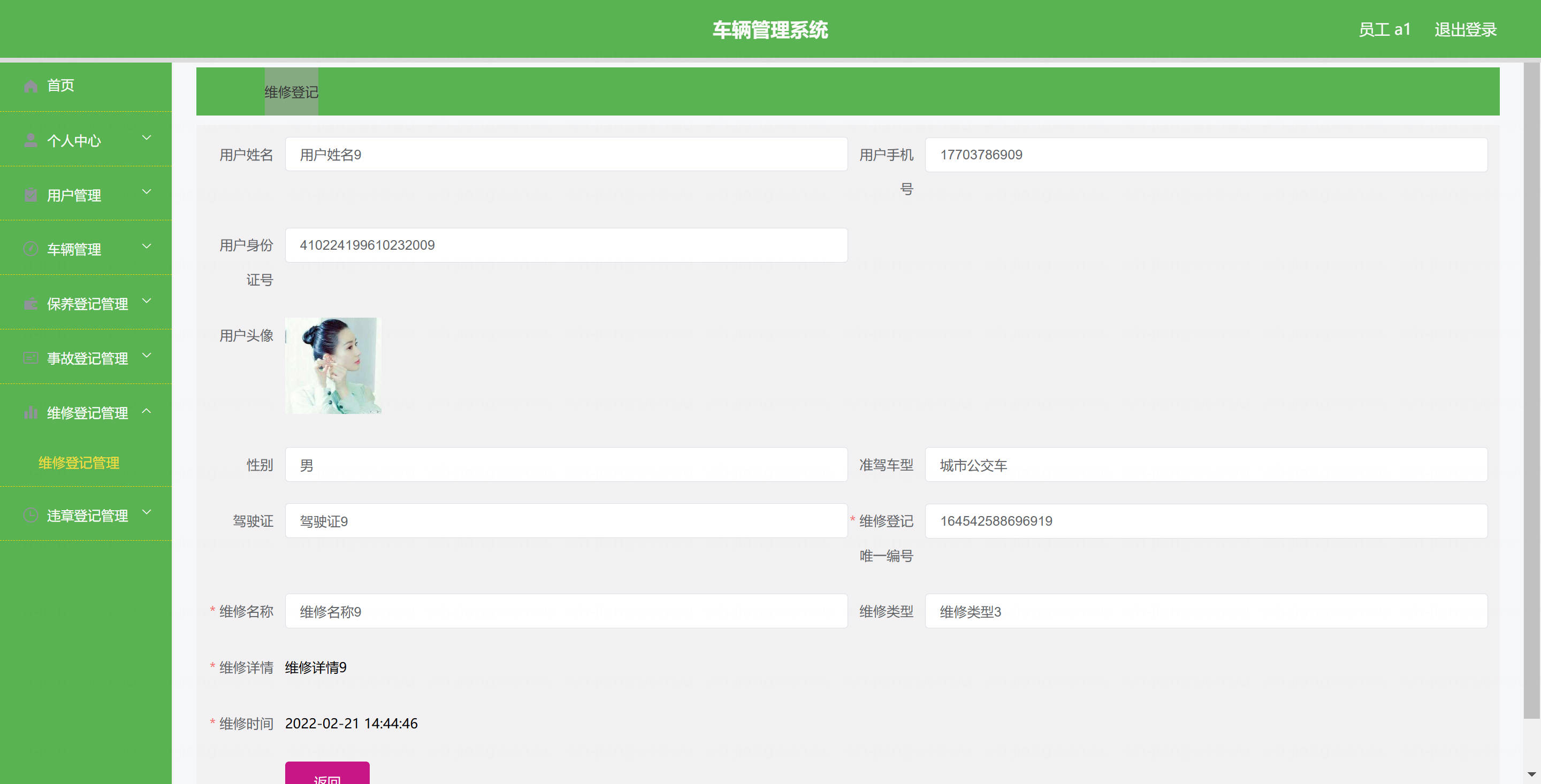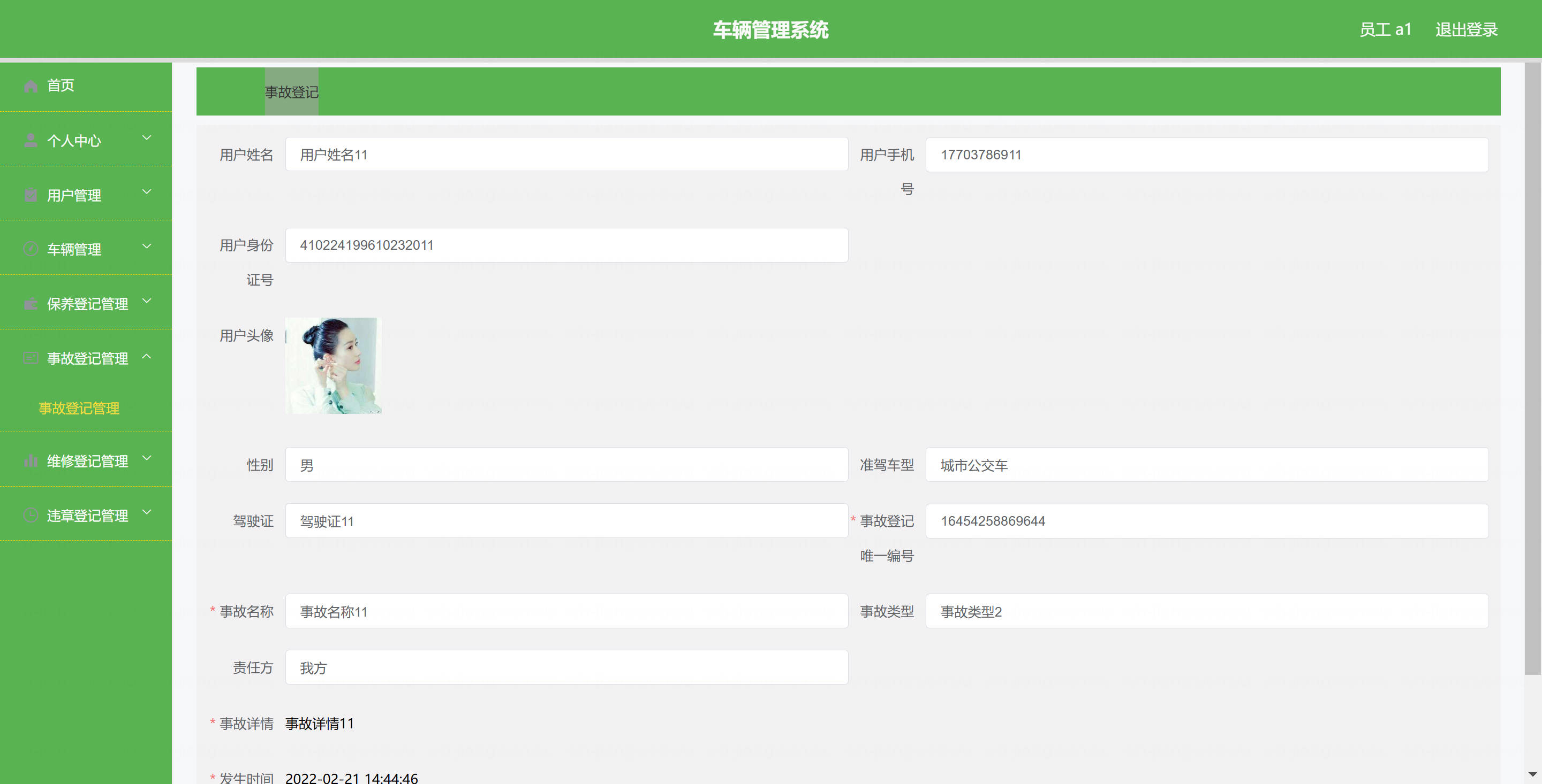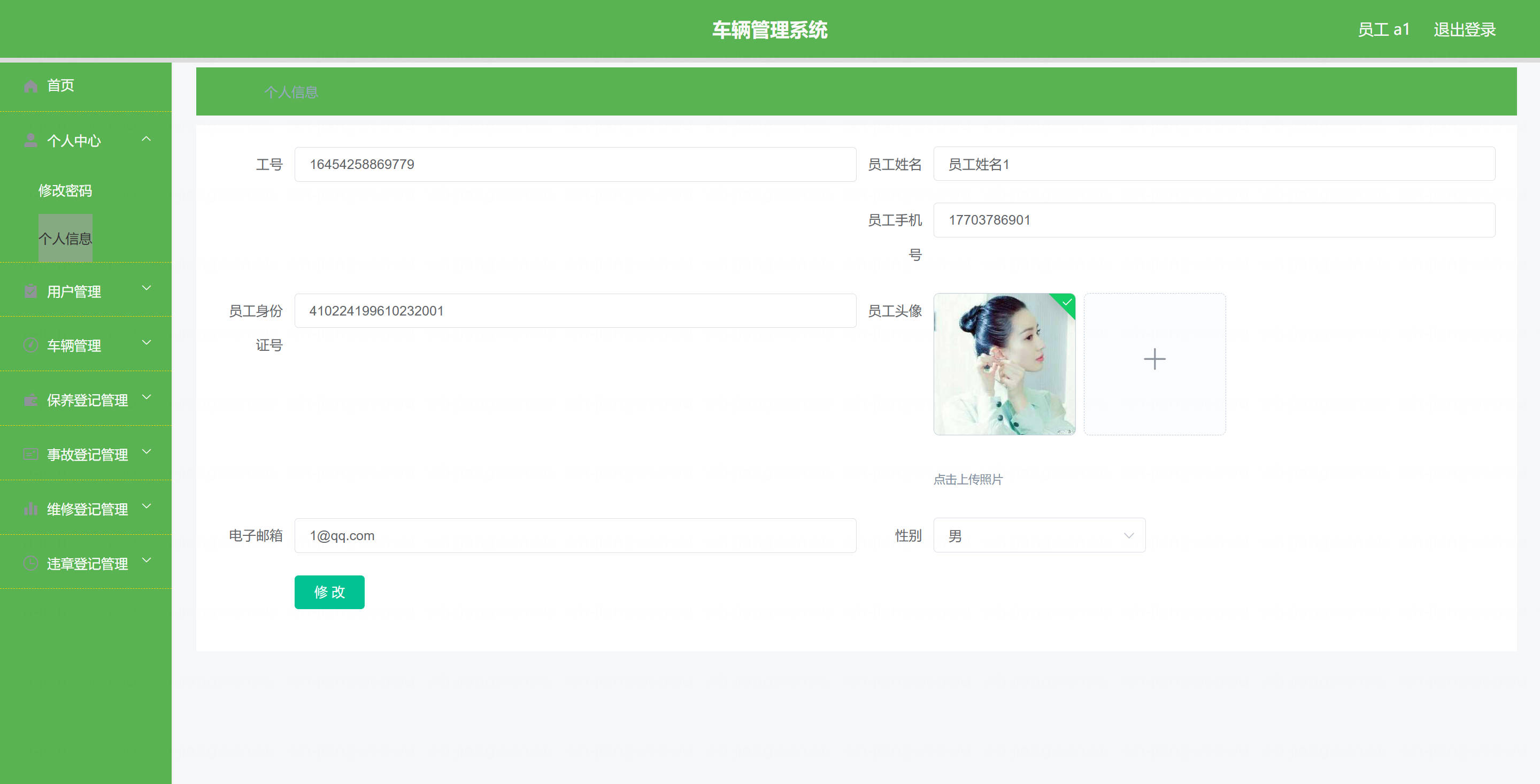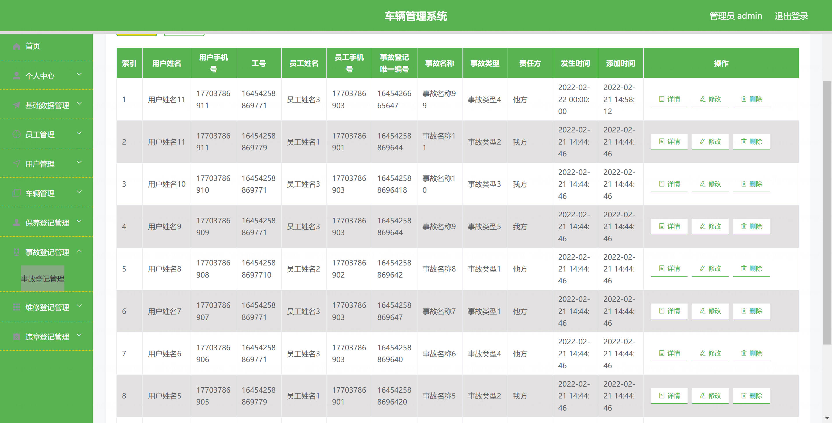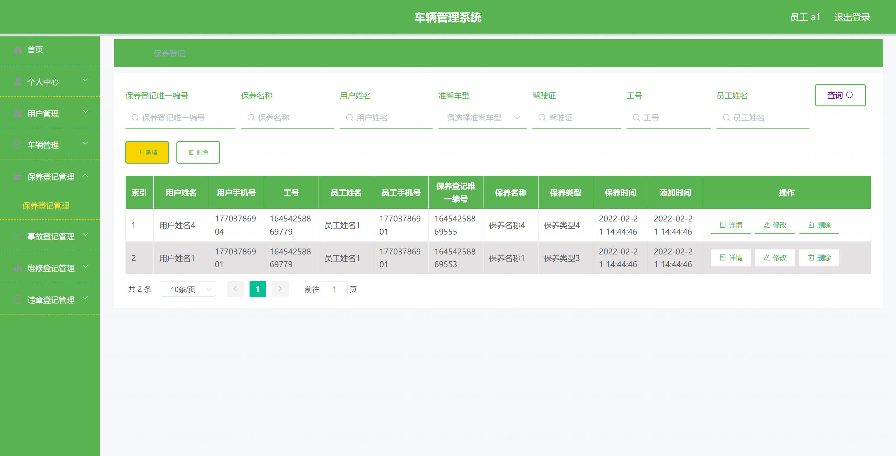 用户: 基本操作:登录、修改密码、获取个人信息、修改个人信息 车辆管理:筛选本人车辆、获取车辆列表、查看车辆详情 保养登记管理:查看保养登记列表、查看保养登记详情、提交保养登记 维修登记管理:查看维修登记列表、查看维修登记详情、提交维修登记 违章登记管理:查看违章登记列表、查看违章登记详情 事故登记管理:查看事故登记列表、查看事故登记详情