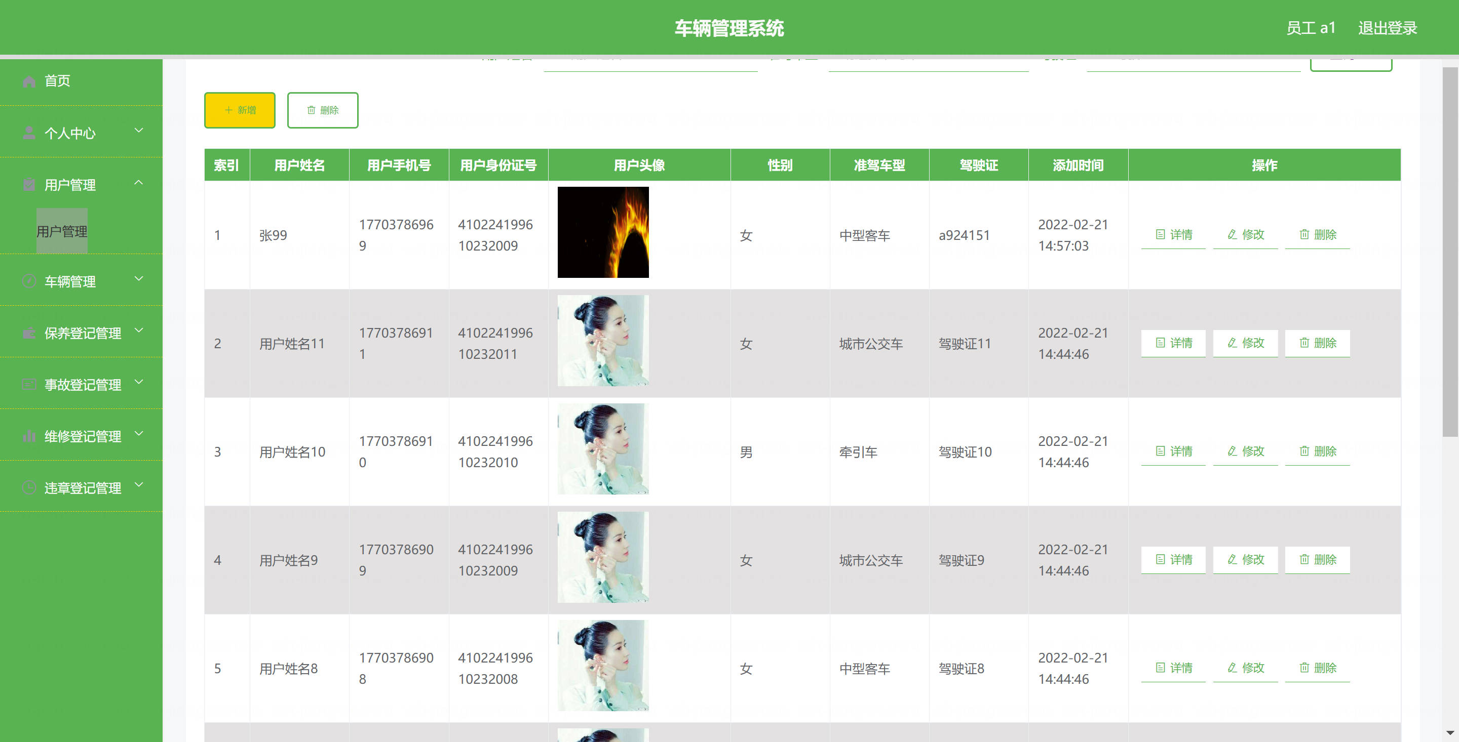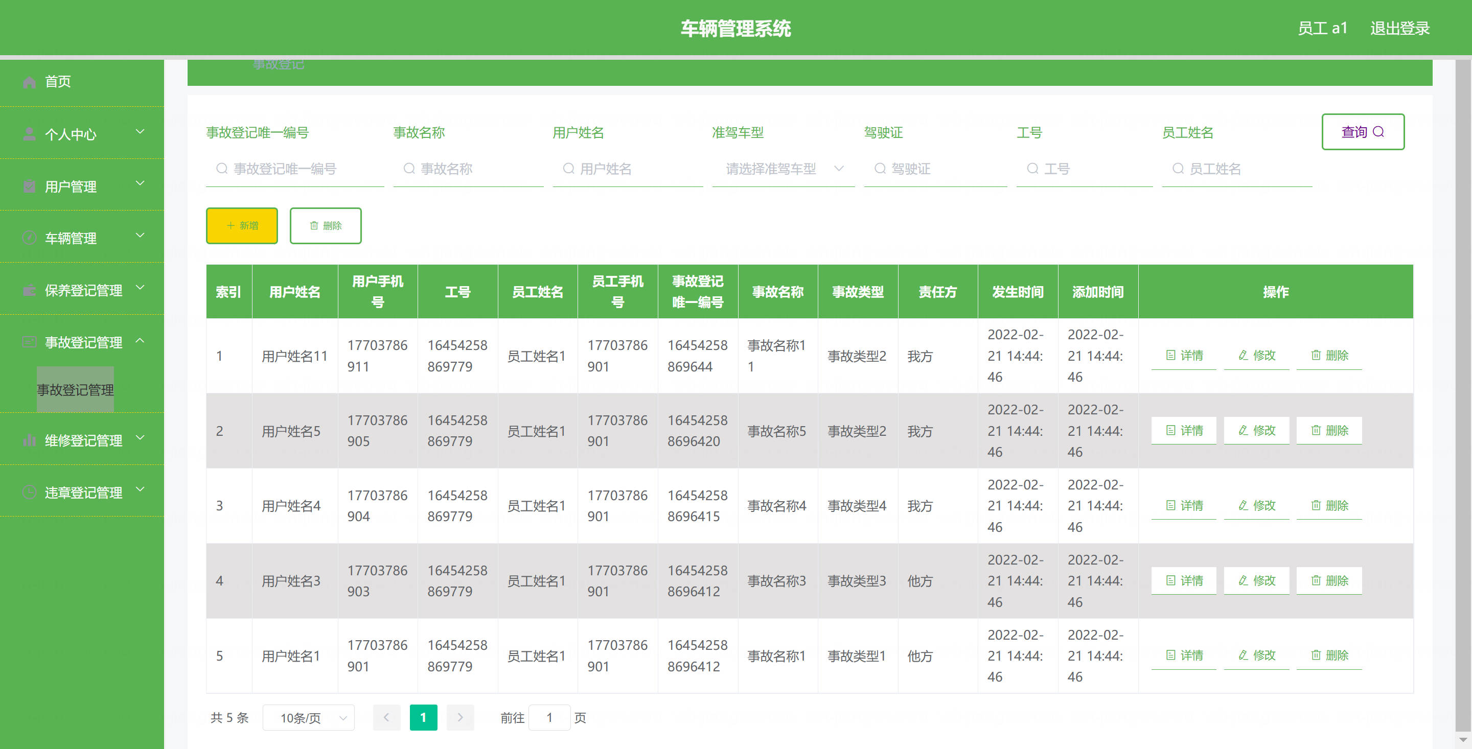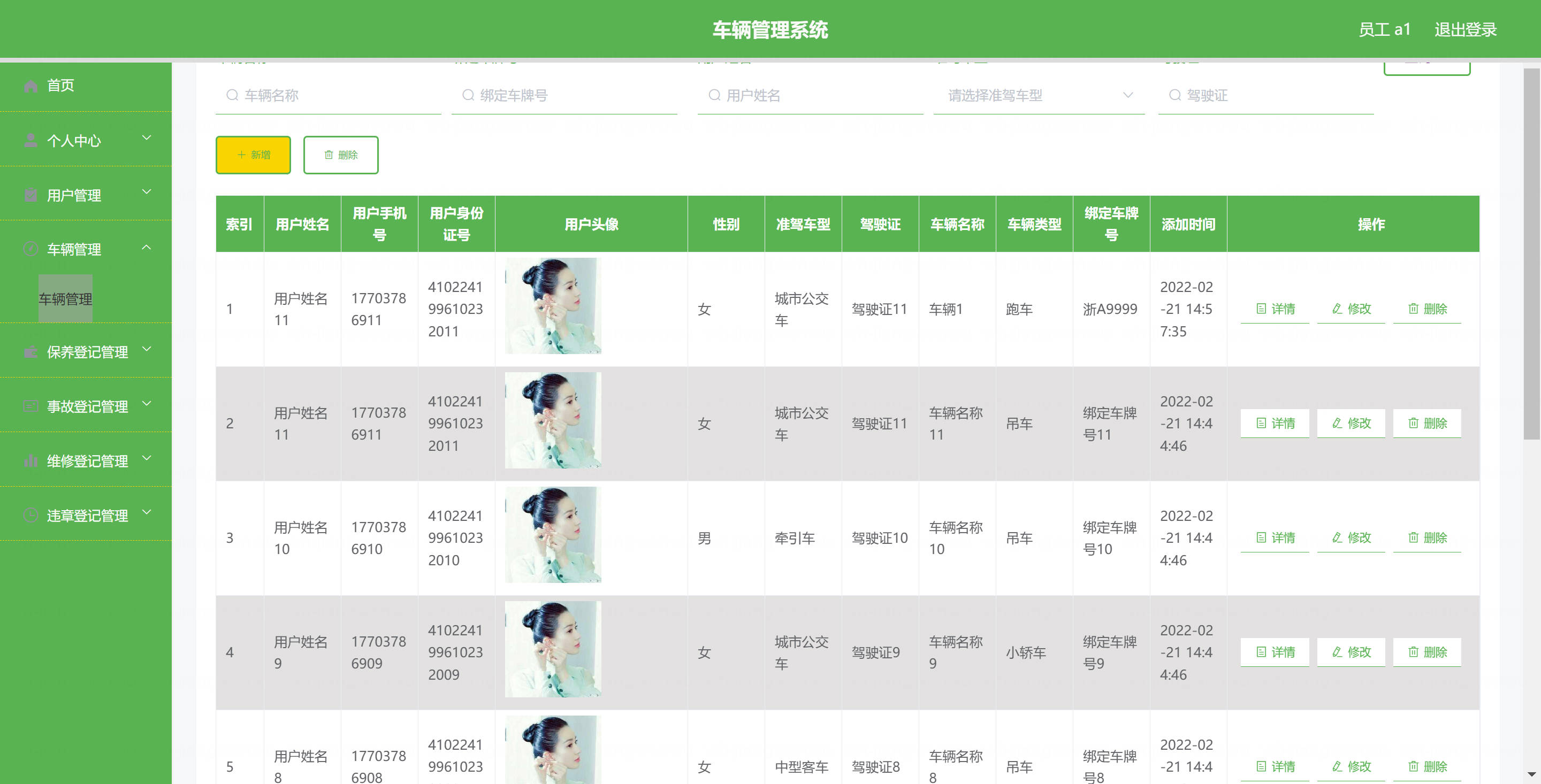 员工: 基本操作:登录、修改密码、获取个人信息、修改个人信息 车辆管理:筛选与本人相关车辆、获取车辆列表、查看车辆详情、新增车辆、删除车辆、修改车辆 保养登记管理:获取与本人相关保养登记列表、筛选保养登记、查看详情、新增保养登记、删除保养登记、修改保养登记 维修登记管理:获取与本人相关维修登记列表、筛选维修登记、查看详情、新增维修登记、删除维修登记、修改维修登记 违章登记管理:获取与本人相关违章登记列表、筛选违章登记、查看详情、新增违章登记、删除违章登记、修改违章登记 事故登记管理:获取与本人相关事故登记列表、筛选事故登记、查看详情、新增事故登记、删除事故登记、修改事故登记 用户管理(驾驶员):筛选用户信息、查看用户详情、新增用户、删除用户、修改用户