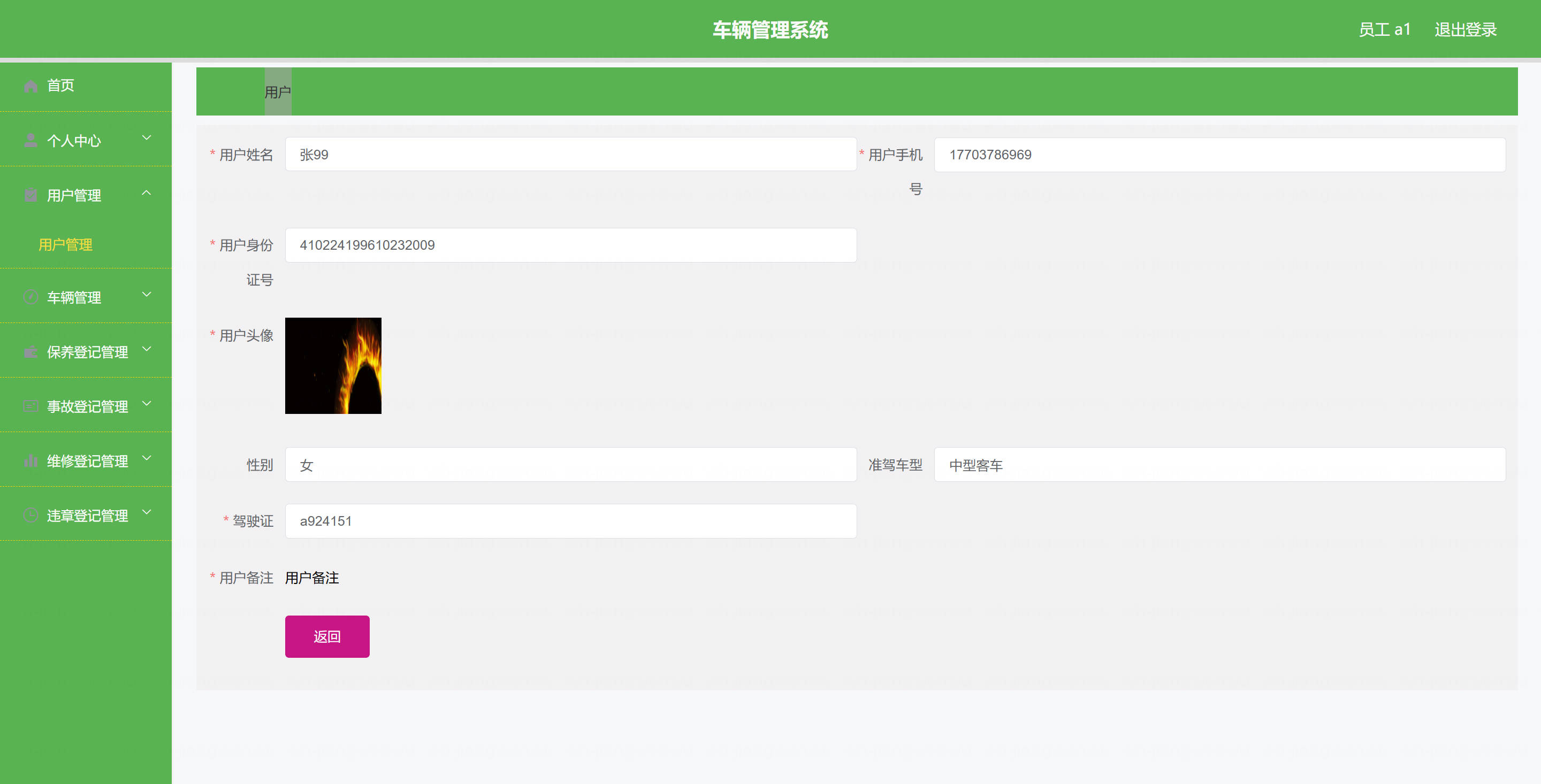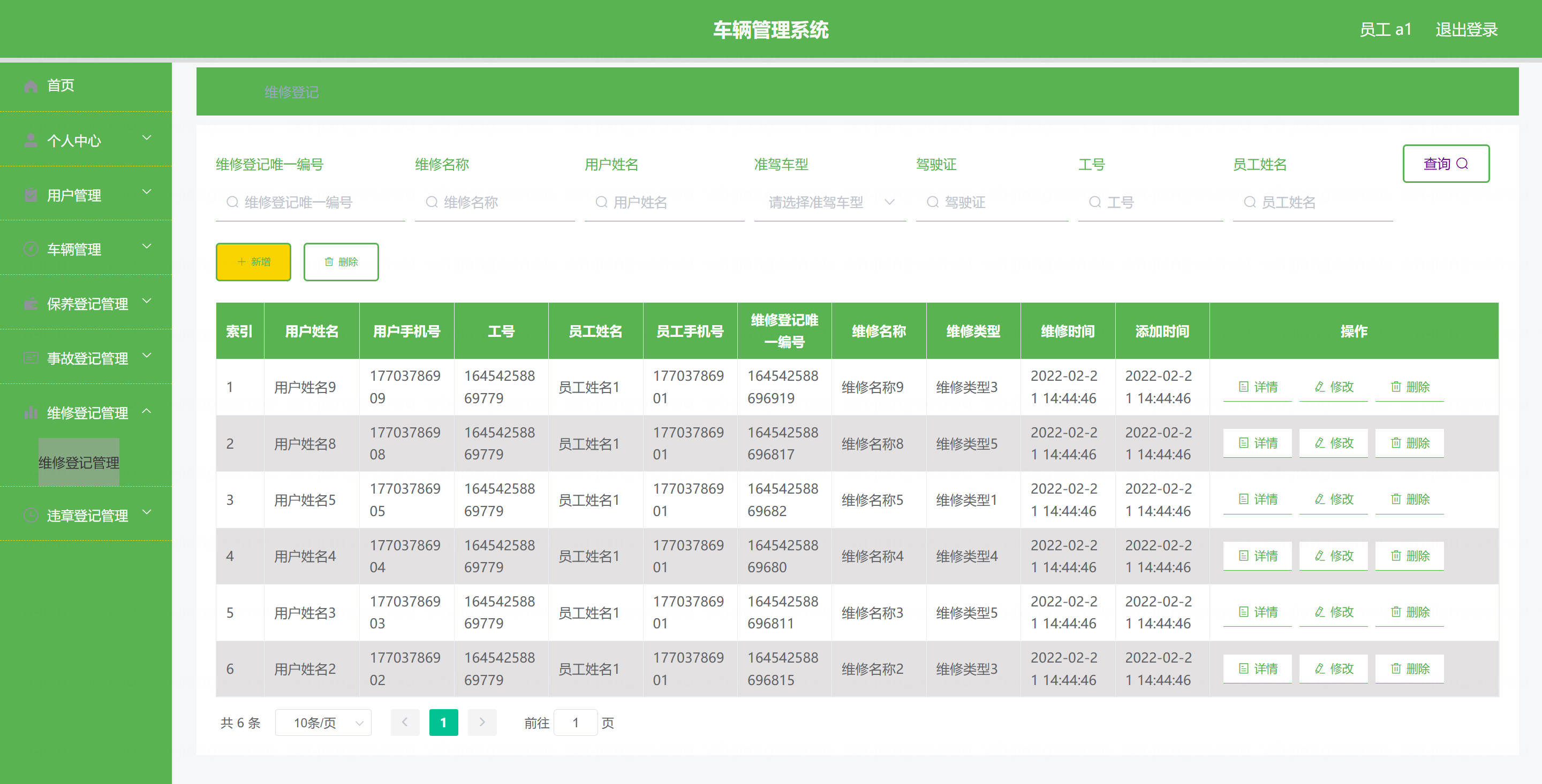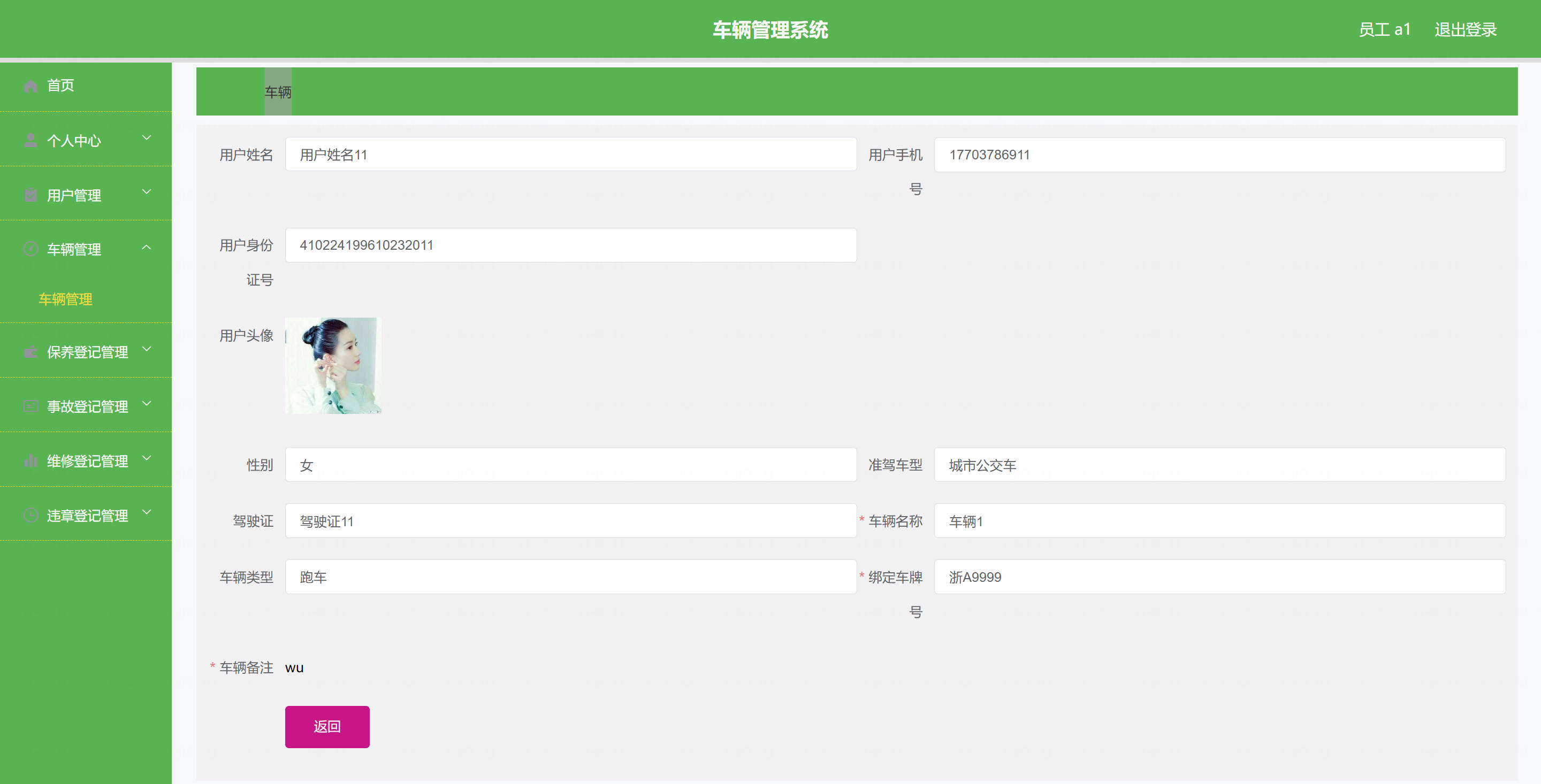 员工: 基本操作:登录、修改密码、获取个人信息、修改个人信息 车辆管理:筛选与本人相关车辆、获取车辆列表、查看车辆详情、新增车辆、删除车辆、修改车辆 保养登记管理:获取与本人相关保养登记列表、筛选保养登记、查看详情、新增保养登记、删除保养登记、修改保养登记 维修登记管理:获取与本人相关维修登记列表、筛选维修登记、查看详情、新增维修登记、删除维修登记、修改维修登记 违章登记管理:获取与本人相关违章登记列表、筛选违章登记、查看详情、新增违章登记、删除违章登记、修改违章登记 事故登记管理:获取与本人相关事故登记列表、筛选事故登记、查看详情、新增事故登记、删除事故登记、修改事故登记 用户管理(驾驶员):筛选用户信息、查看用户详情、新增用户、删除用户、修改用户