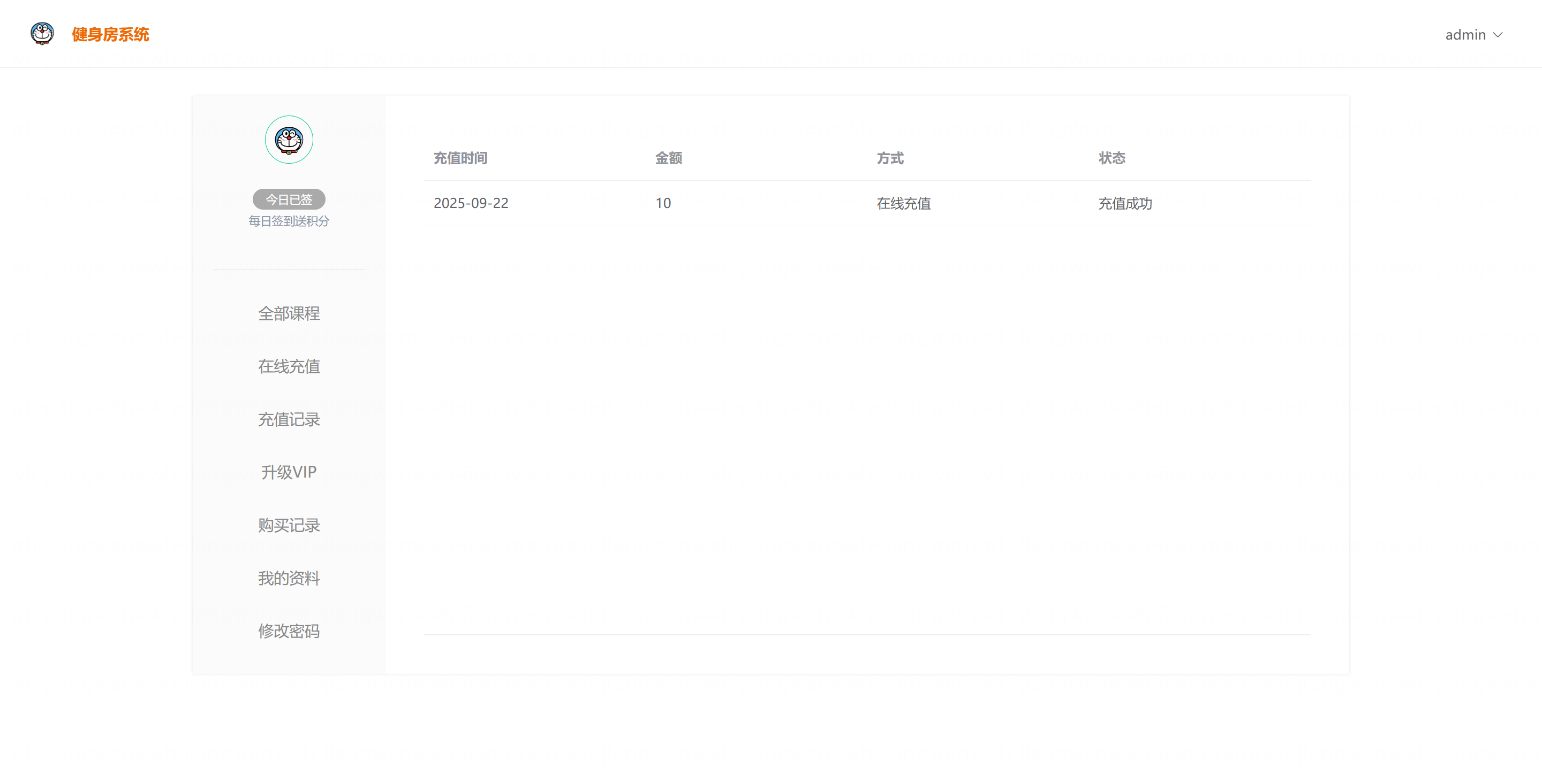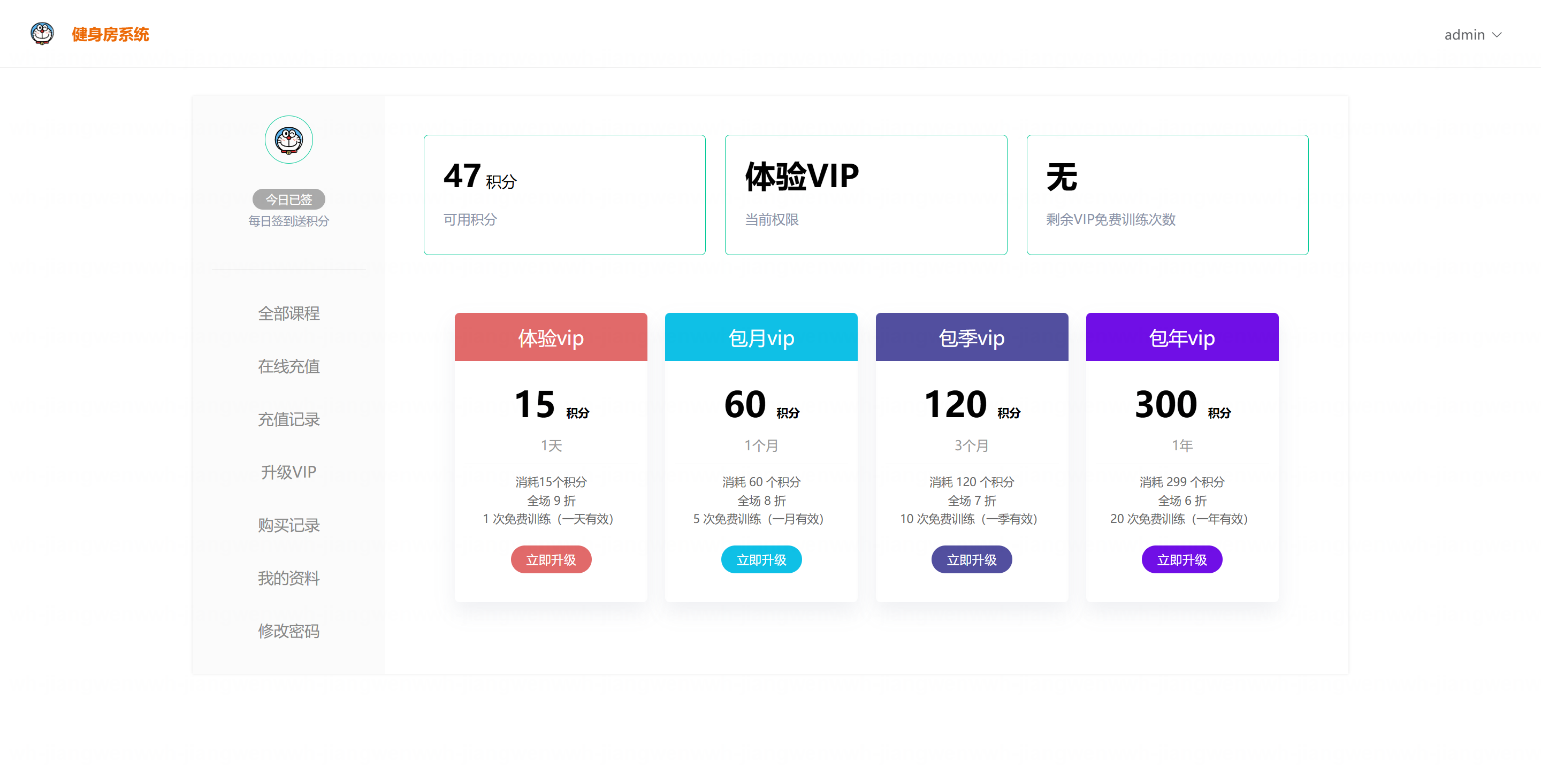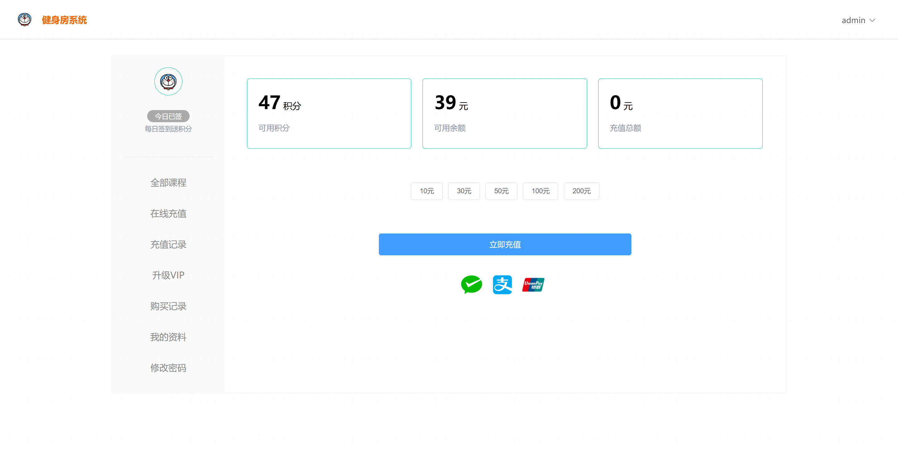- 个人中心:查看个人会员卡信息、充值记录、购买记录。