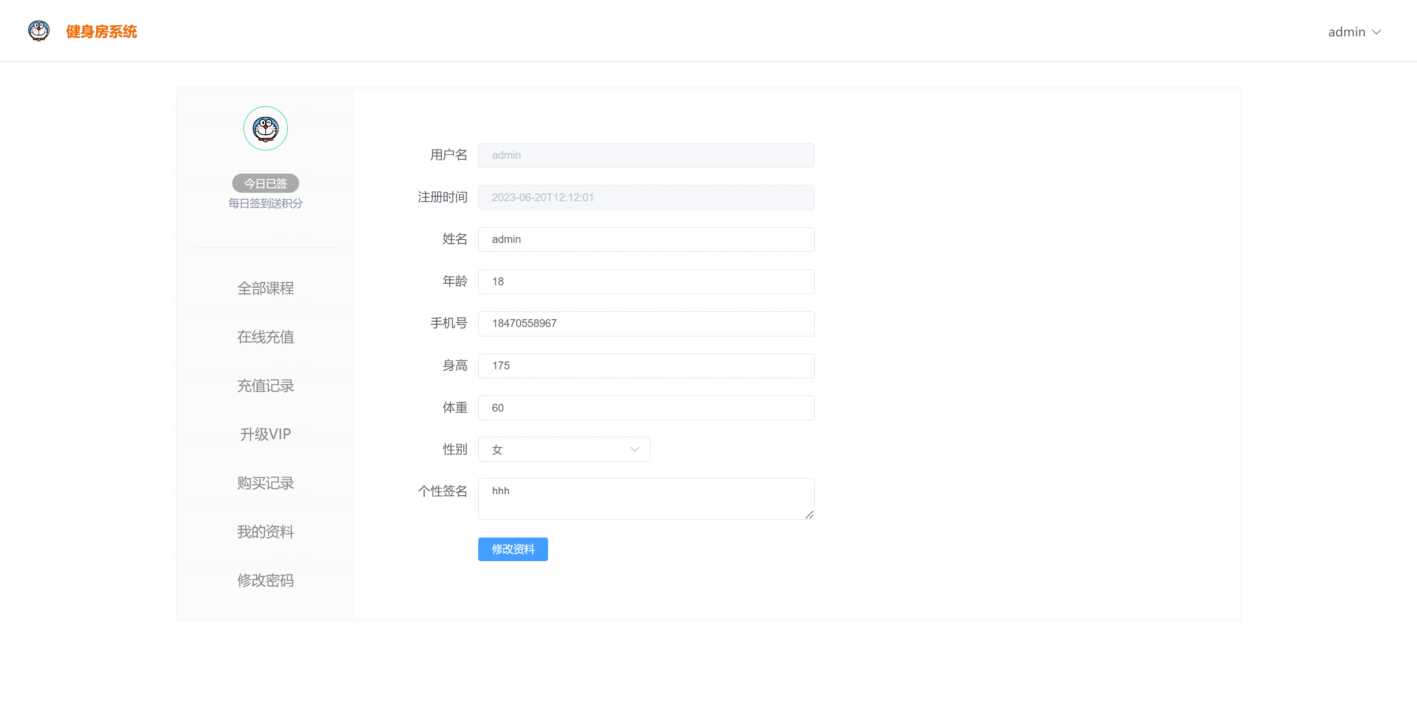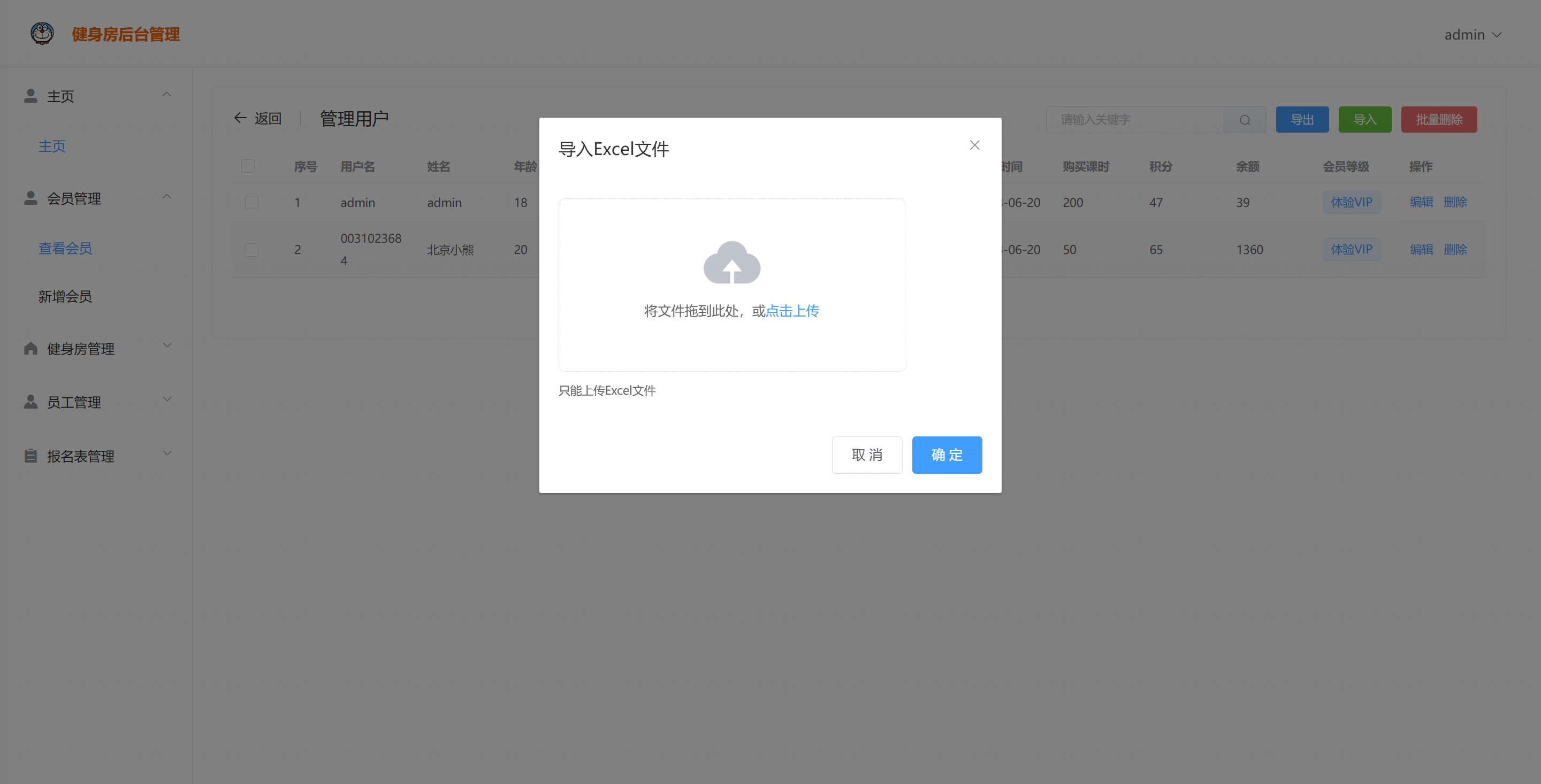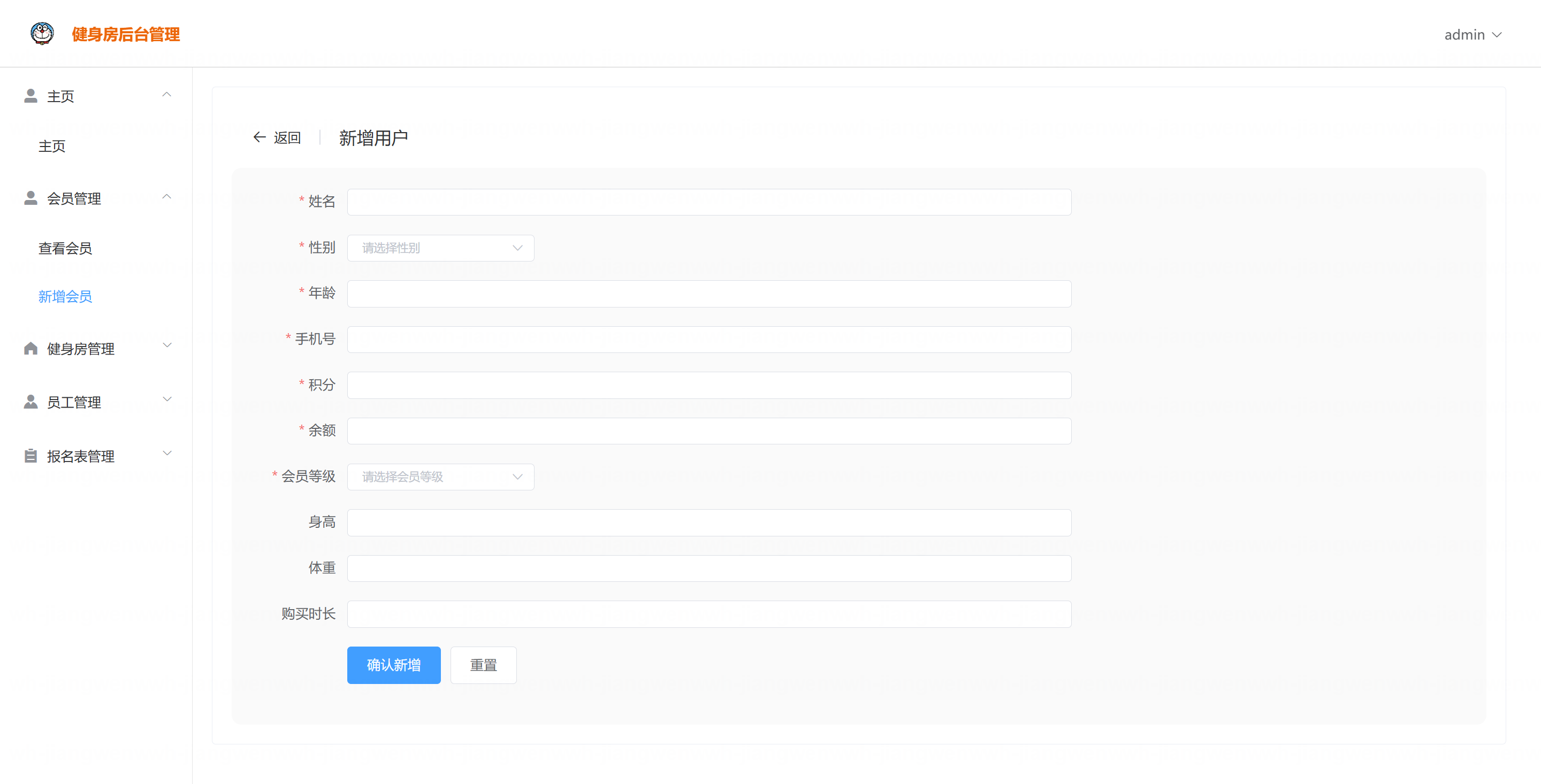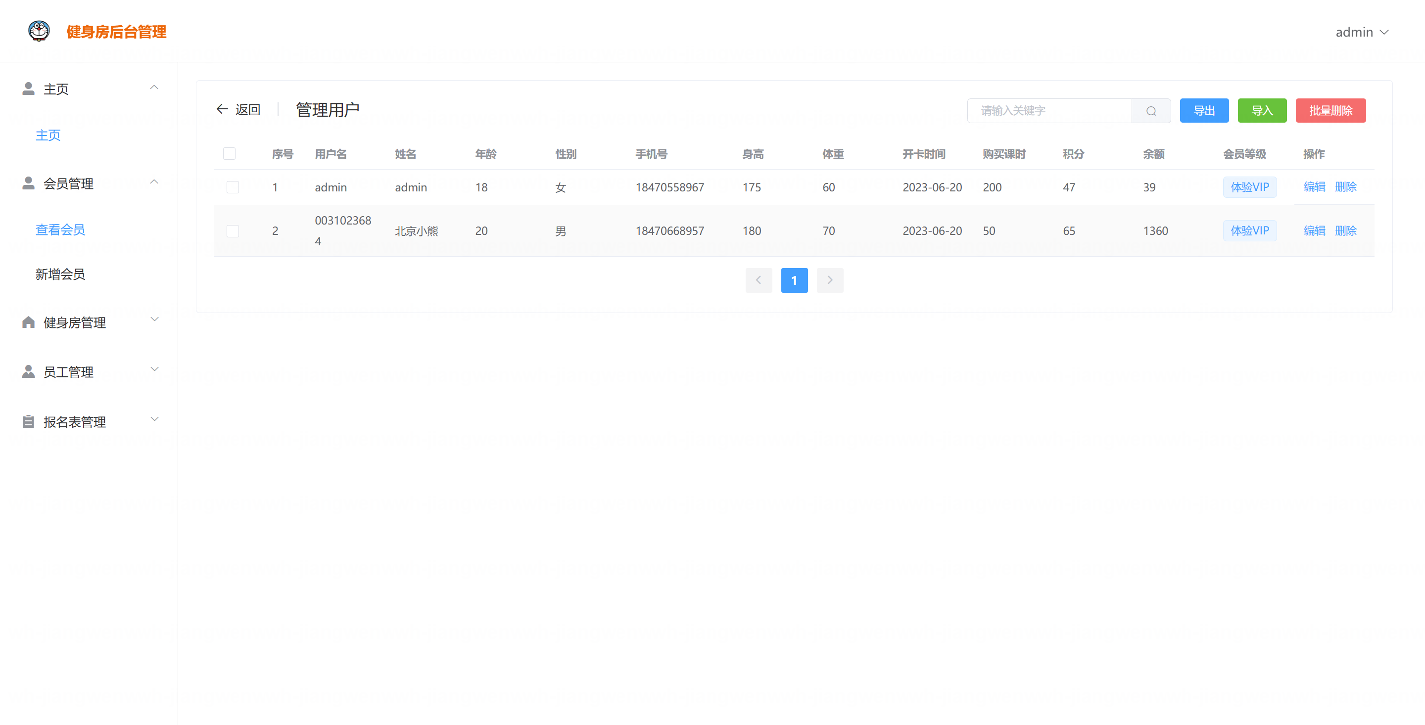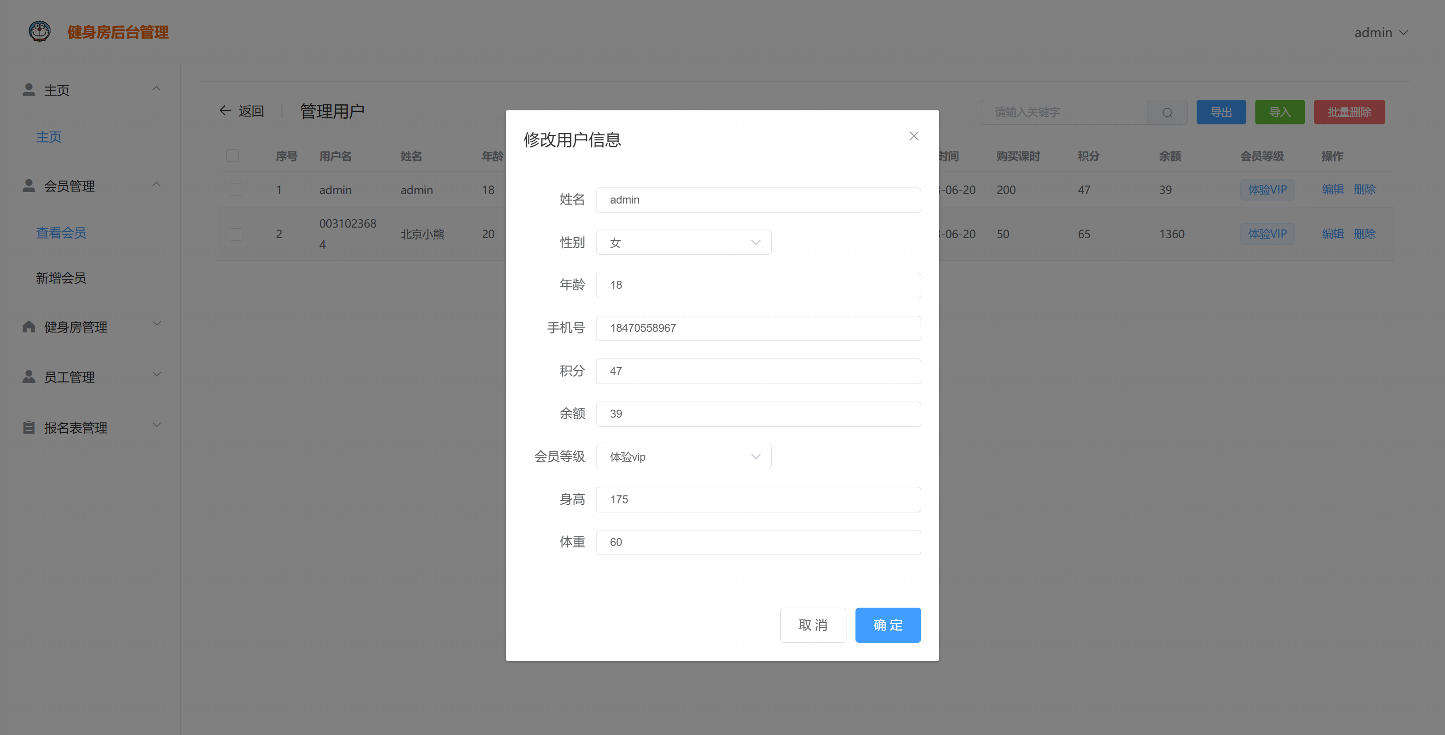 本项目为基于 Spring Boot + Vue 的健身房管理系统,分为 管理员(后台) 与 会员两类角色。系统已实现的主要功能如下: