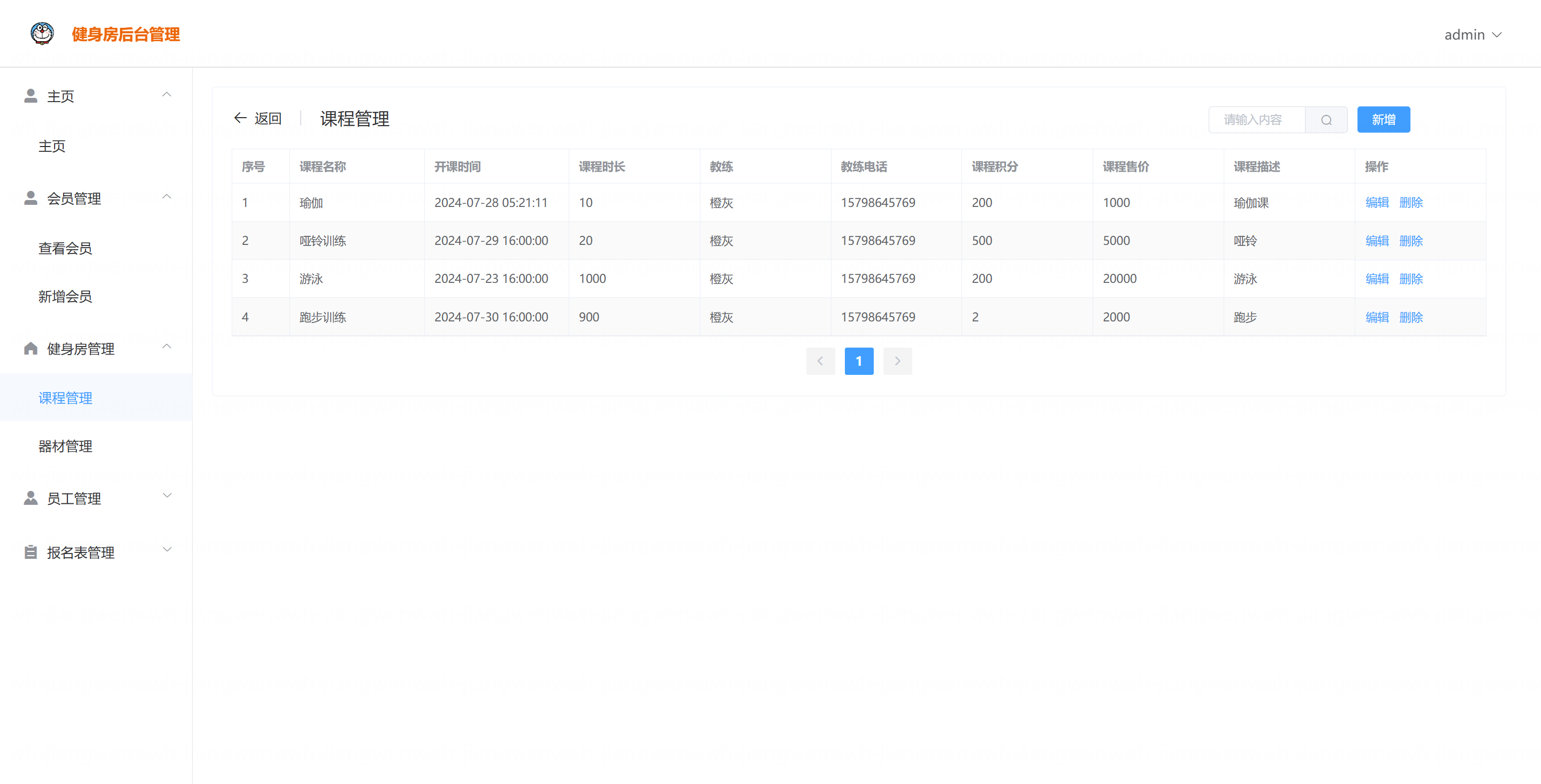 - 课程管理:健身课程的发布/修改/删除/查询管理。